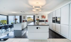 As you step up into the main living space, the home truly reveals itself. The view expands, the light deepens, and the connection to the outdoors becomes all-encompassing. This open plan kitchen, dining and living area is the social and visual heart of the home—an elegant, flowing space designed for both effortless day-to-day living and memorable entertaining. Three large glazed sliding triple doors dissolve the boundary between inside and out, opening onto the terrace where long lunches, sunset drinks and quiet moments overlooking the water become part of your routine.