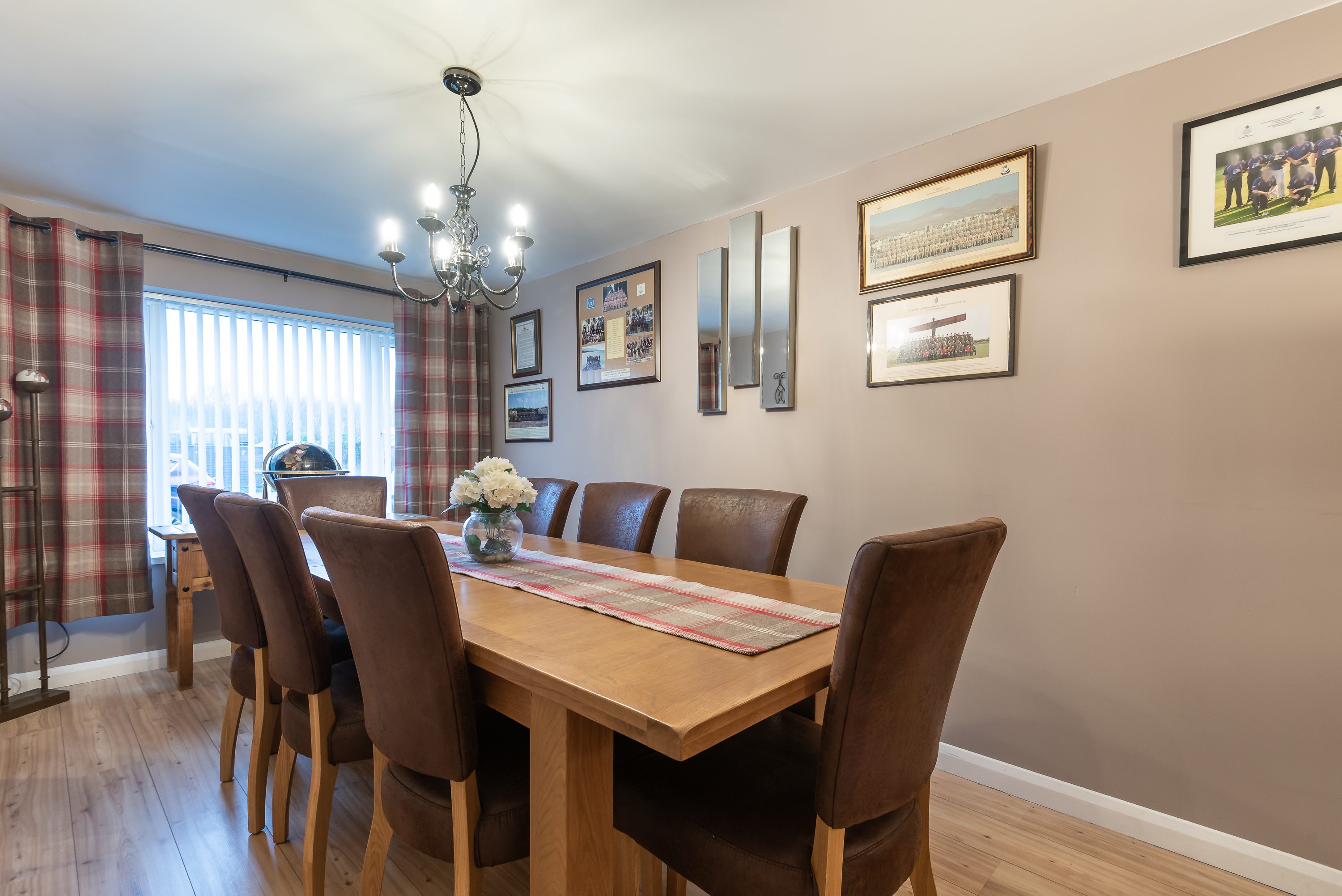 The ground floor welcomes you with a bright entrance hallway, with the previous garage converted into a stylish dining room. Bathed in natural light from a large window and enhanced by modern décor and decorative lighting fixtures, offering a dedicated space for hosting family and friends.