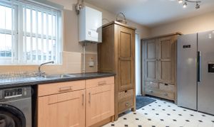 The timeless Shaker-style kitchen/diner, features sleek units and integrated appliances (including an oven and hob), with ample countertop space, is spacious and flooded with natural light. French doors provide seamless access to the private south-facing garden, blending indoor and outdoor living perfectly.
