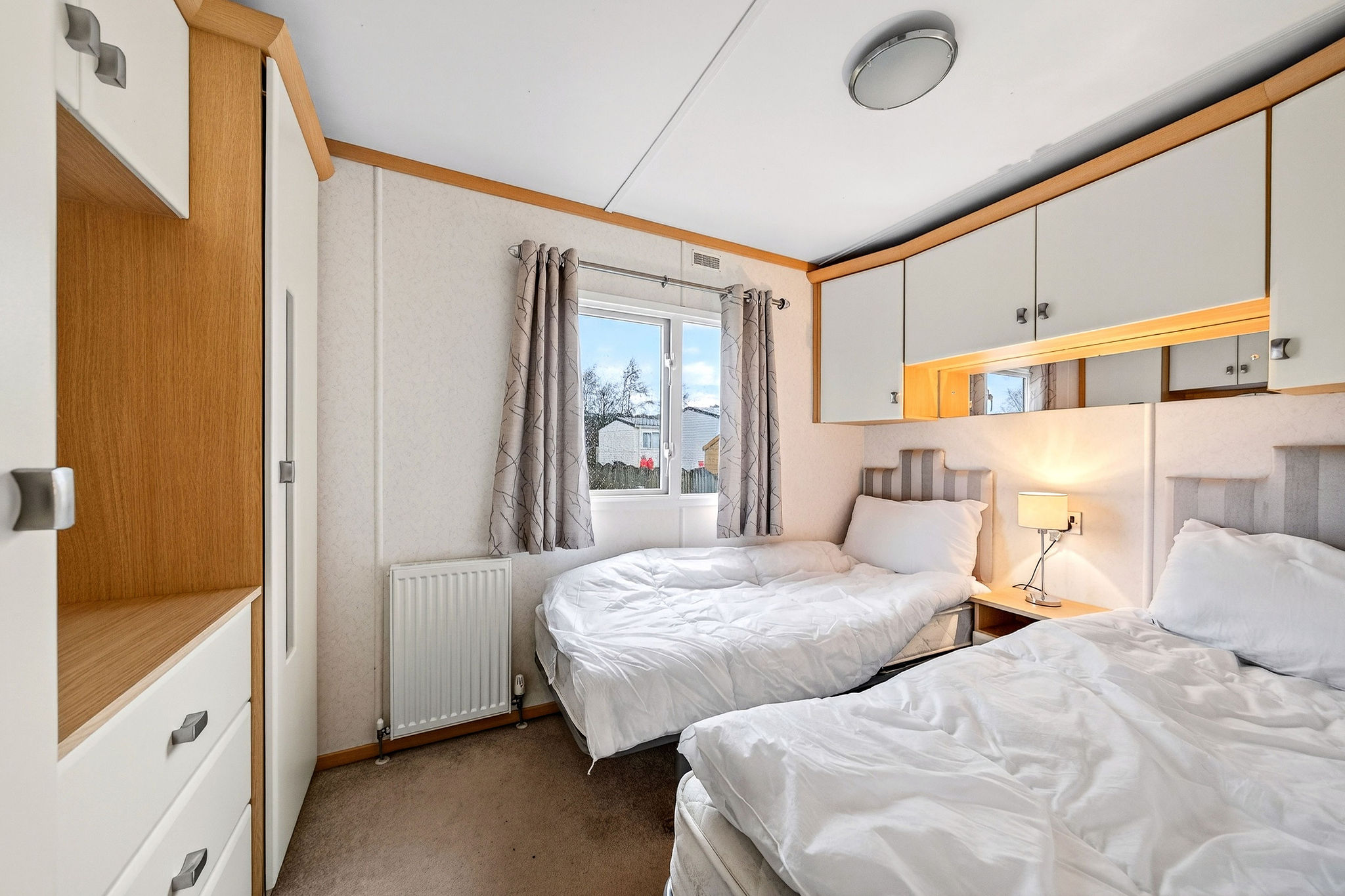 The second bedroom comes equipped with wall-mounted cabinets, fitted wardrobes and drawers. Currently arranged with 2 single beds but could be switched to 1 double bed if preferred.