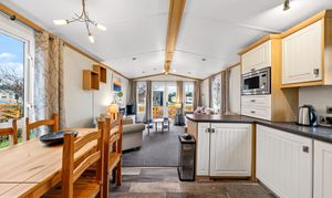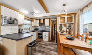The accommodation comprises: open plan lounge / kitchen / diner with French doors leading out to decking, feature fireplace / electric fire, dining table and chairs, fully equipped kitchen with double integrated oven, 5-ring gas hob, extractor hood, microwave, fridge and freezer.