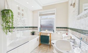 Three piece in white with mains fed shower over bath, tiled splashbacks, tiled flooring, uPVC double glazed frosted window, panel radiator.
