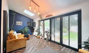 Leading seamlessly from the lounge is the extended rear of the house, where a truly outstanding open plan kitchen, living, and dining area awaits. The addition of bi-folding doors floods the space with natural light, creating an inviting and versatile area that offers indoor/ outdoor living.