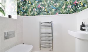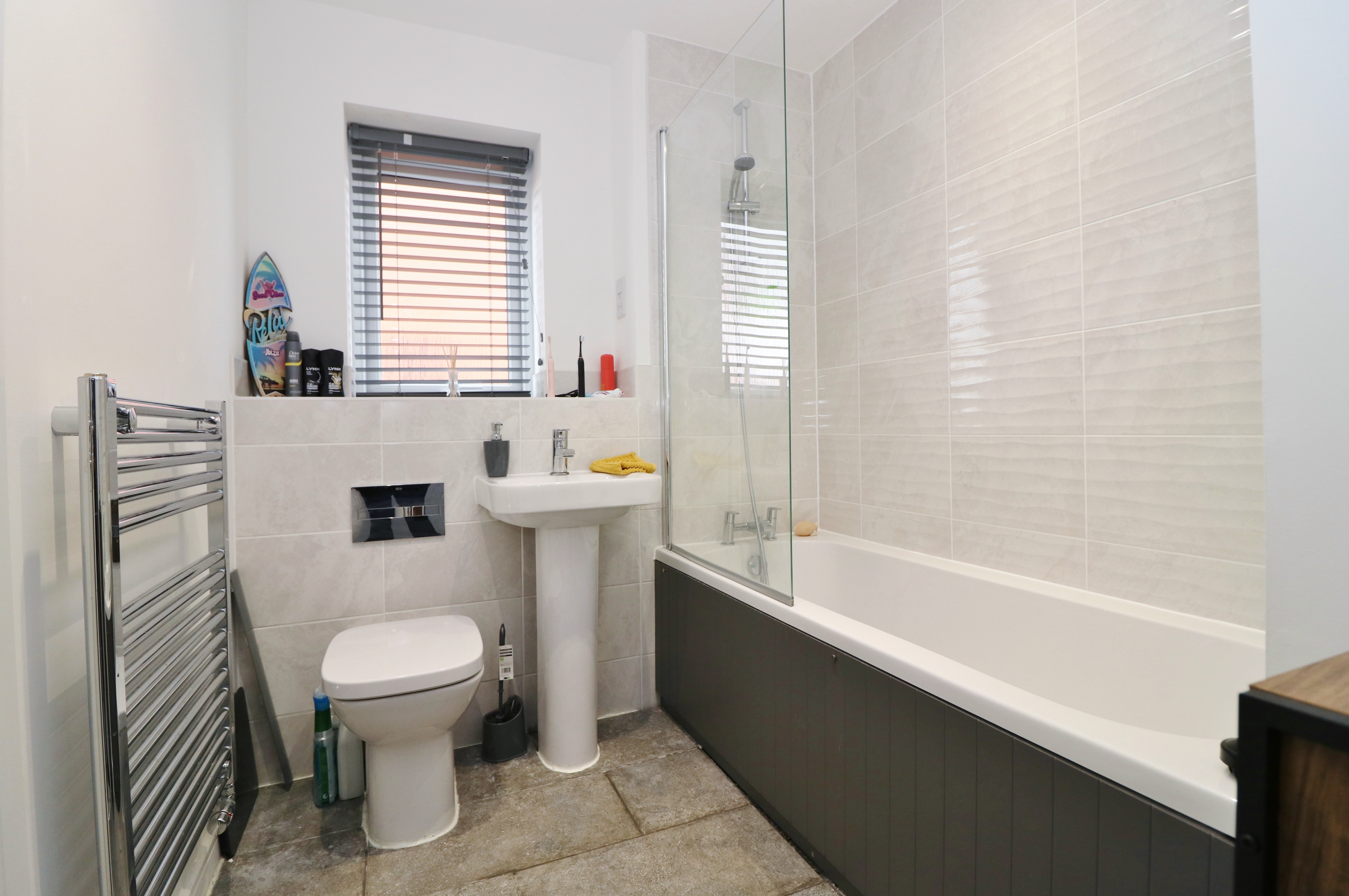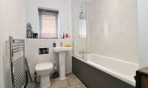 The modern family bathroom comprises a panel enclosed bath with shower and screen over, WC, wash hand basin and a window to the side.