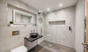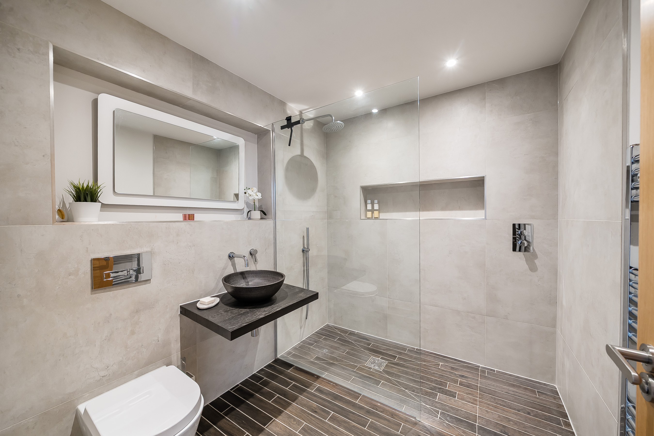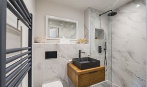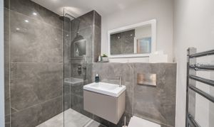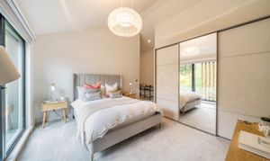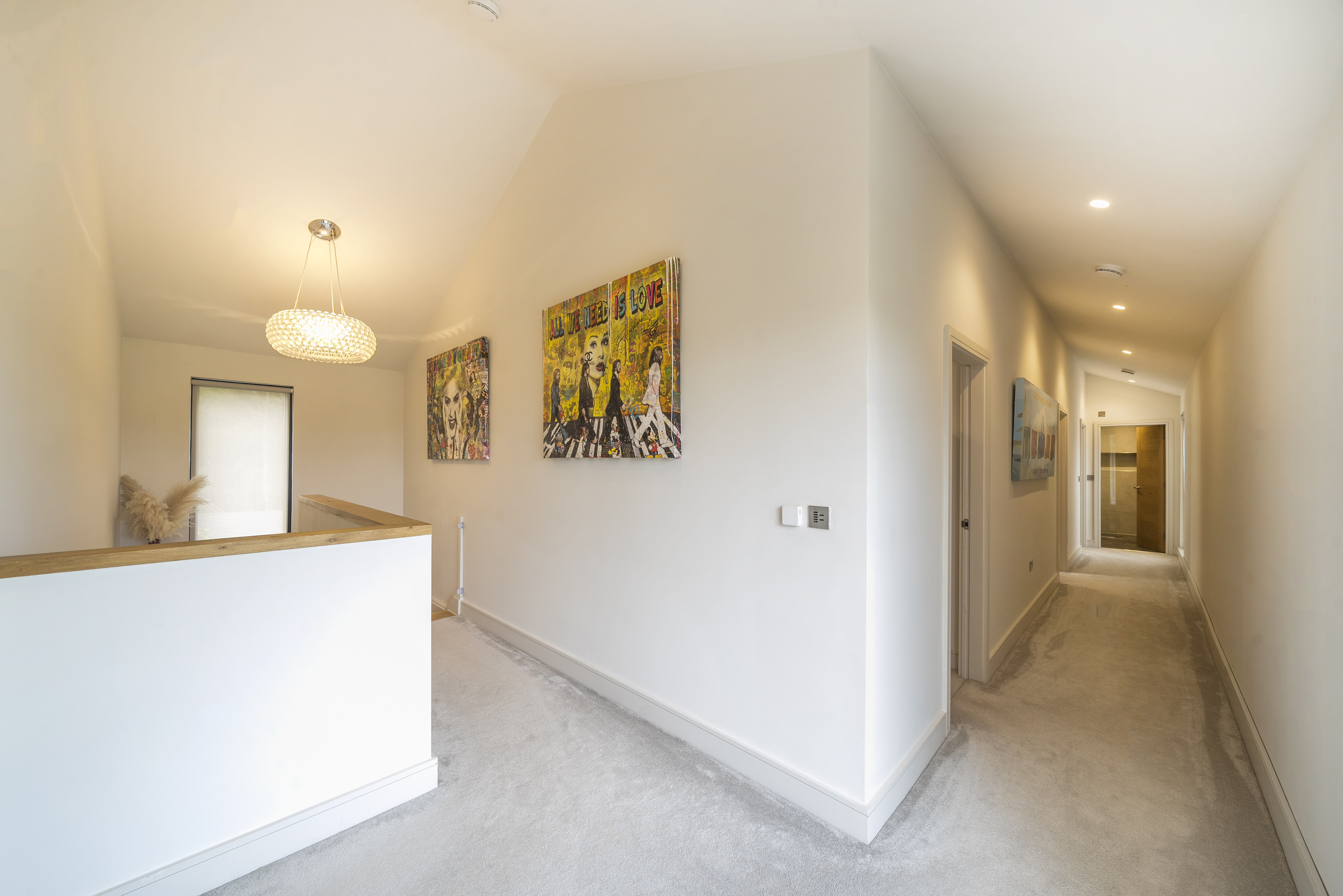 Upstairs, the impressive principal suite boasts a vaulted ceiling, private dressing area, and a luxurious en suite bathroom adorned with solid Italian Lapicida marble tiles, Bagno brassware, and Duravit ceramics. Three further double bedrooms each offer fitted wardrobes and contemporary en suites finished to the highest standard.