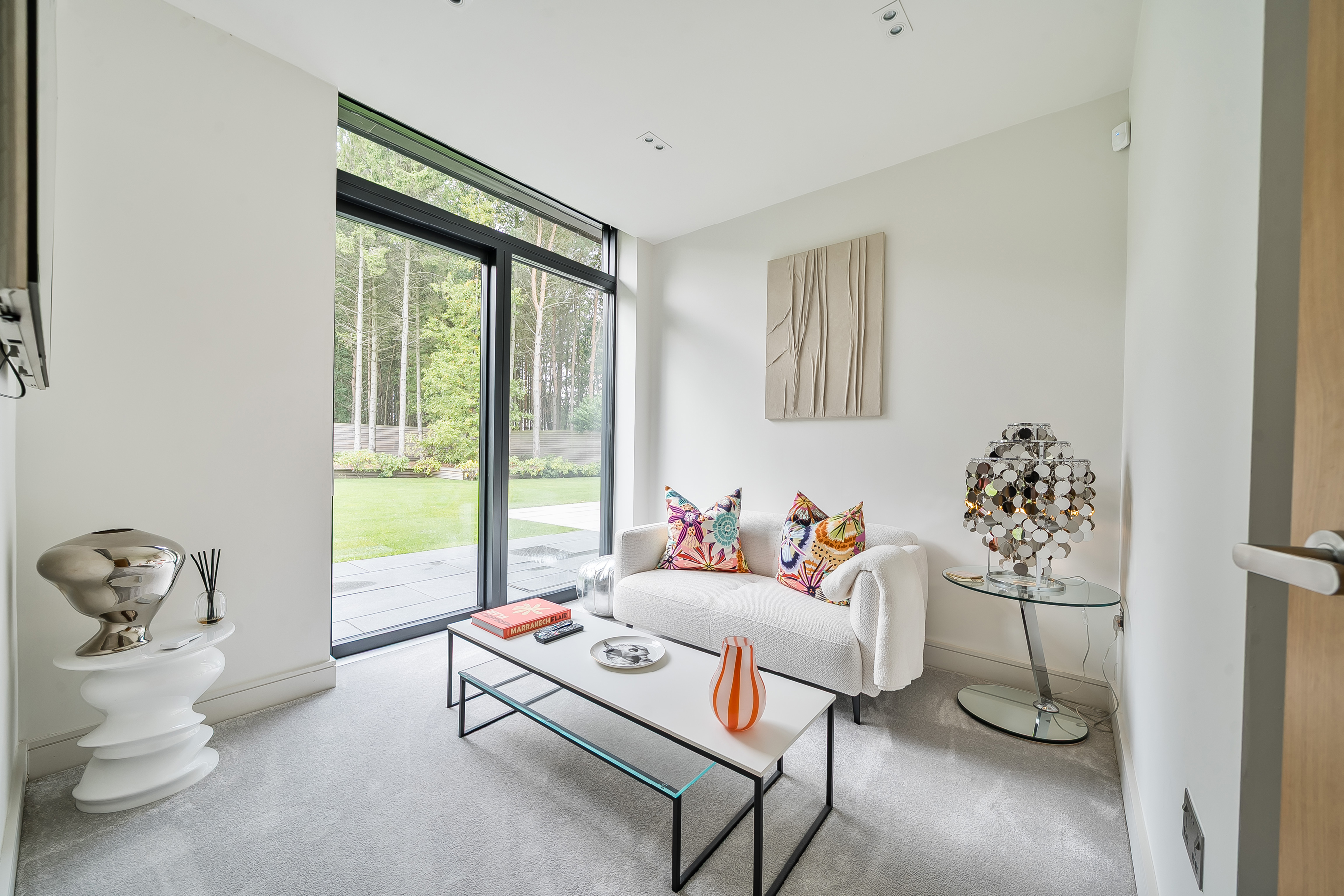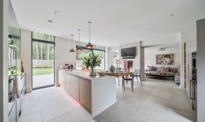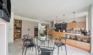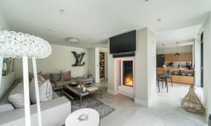 The sleek, fully integrated kitchen features premium German cabinetry, Silestone worktops, and top of the range appliances, including Siemens dishwashers, an induction hob, microwave, larder fridge, wine cooler, cold drinks centre, and a Fisher & Paykel American fridge freezer. The downstairs of the property also features a cosy snug, practical utility room and WC.