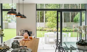 At the heart of the home is an expansive open plan kitchen, dining, and living space, perfectly designed for both entertaining and everyday family life. A striking dual sided Italian designer LPG real flame burner forms a stunning focal point, while floor to ceiling windows and French doors flood the space with natural light and open onto the manicured front lawn, creating a seamless connection between indoors and out.
