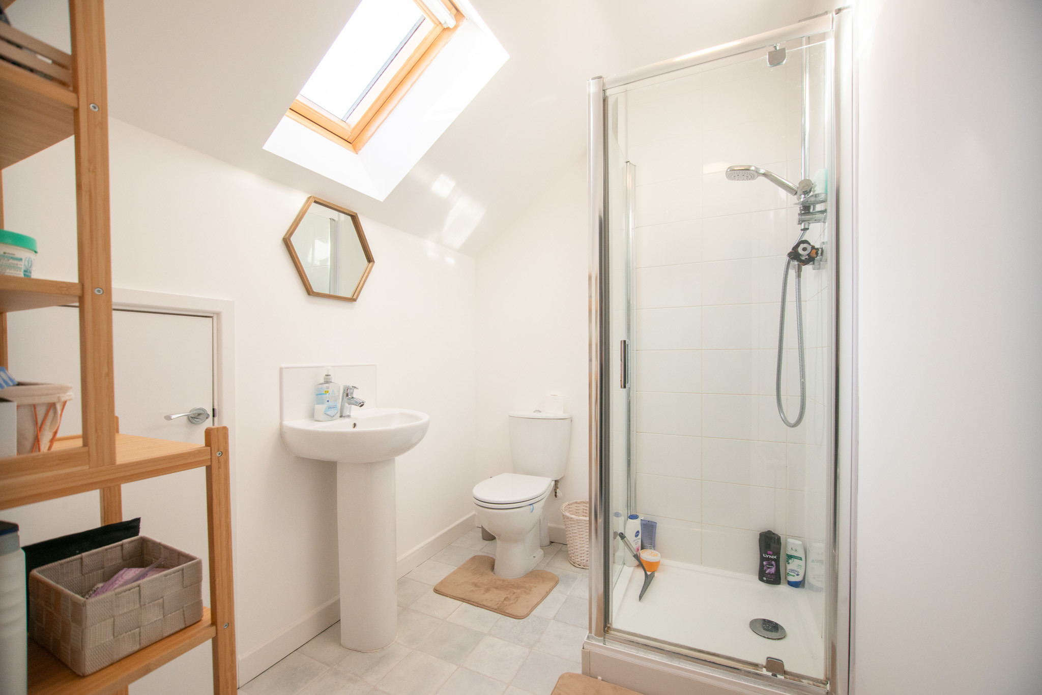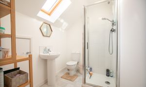 With laminate flooring, Velux-style window, shower cubicle, toilet, and wash basin on pedestal.