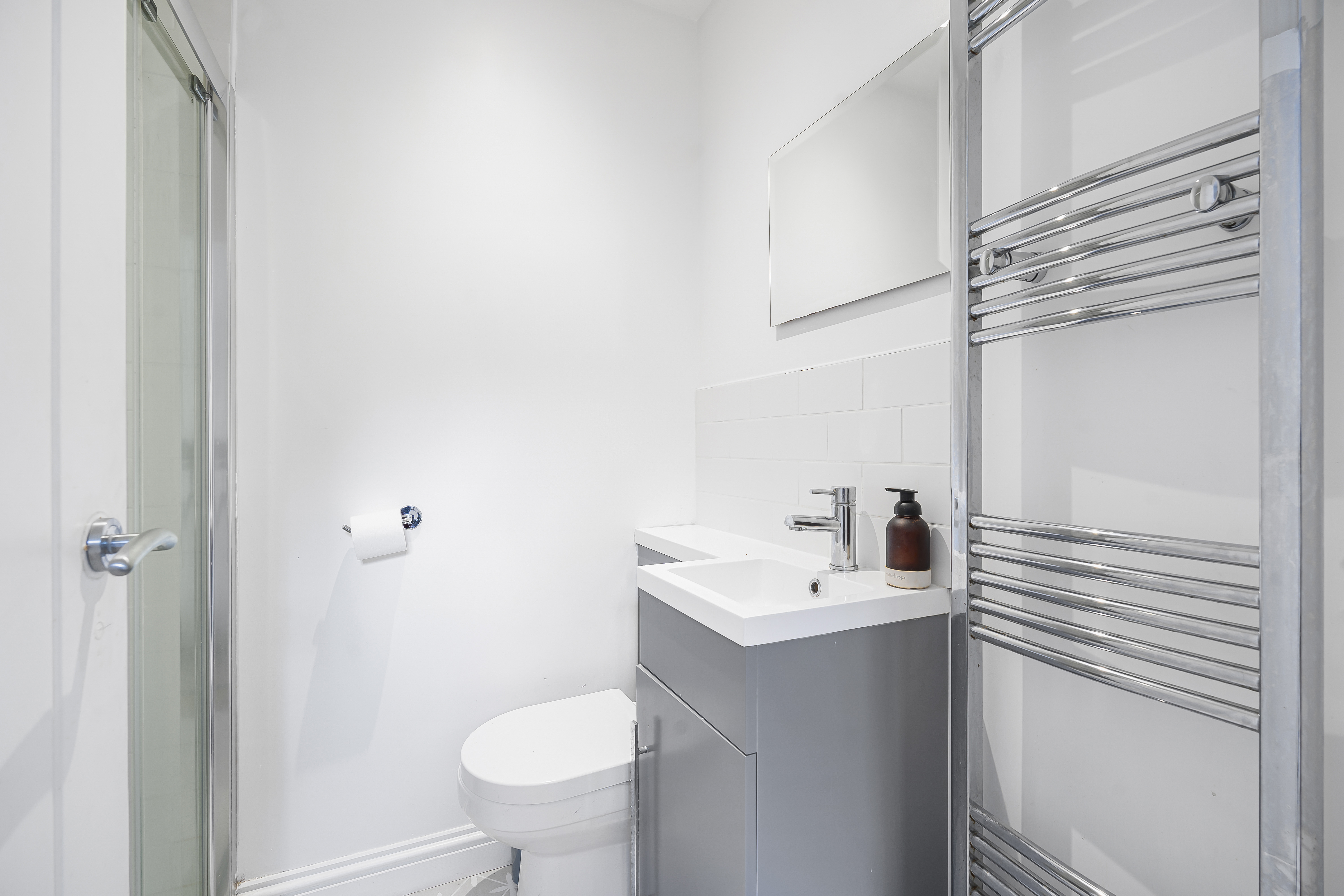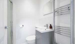 The family shower room has a shower cubicle, built in W.C and sink unit with vanity below and heated towel rail. There is also an inbuilt linen cupboard with washer/dryer below.