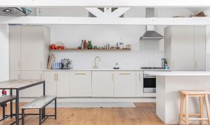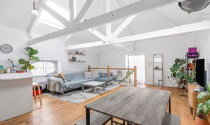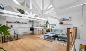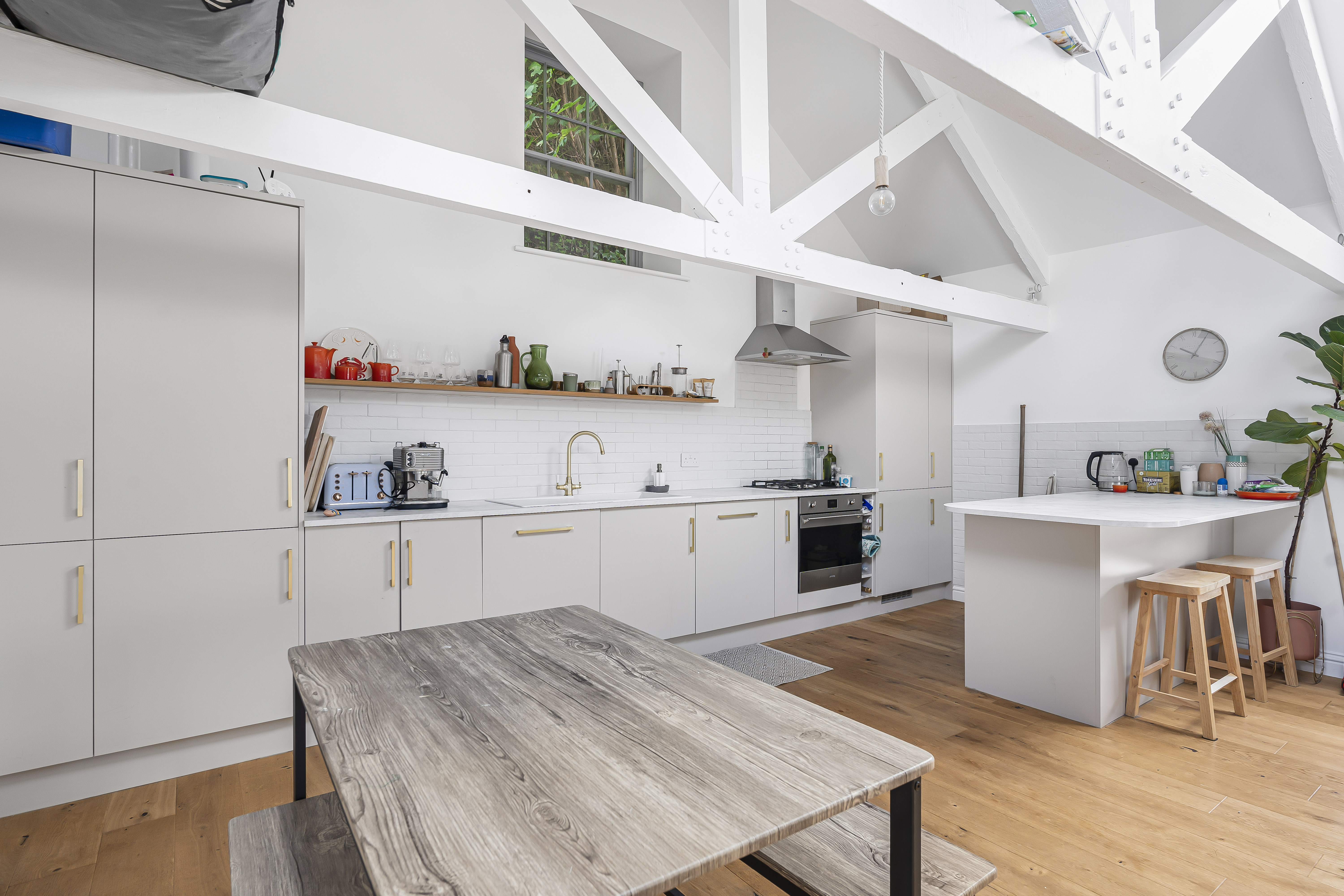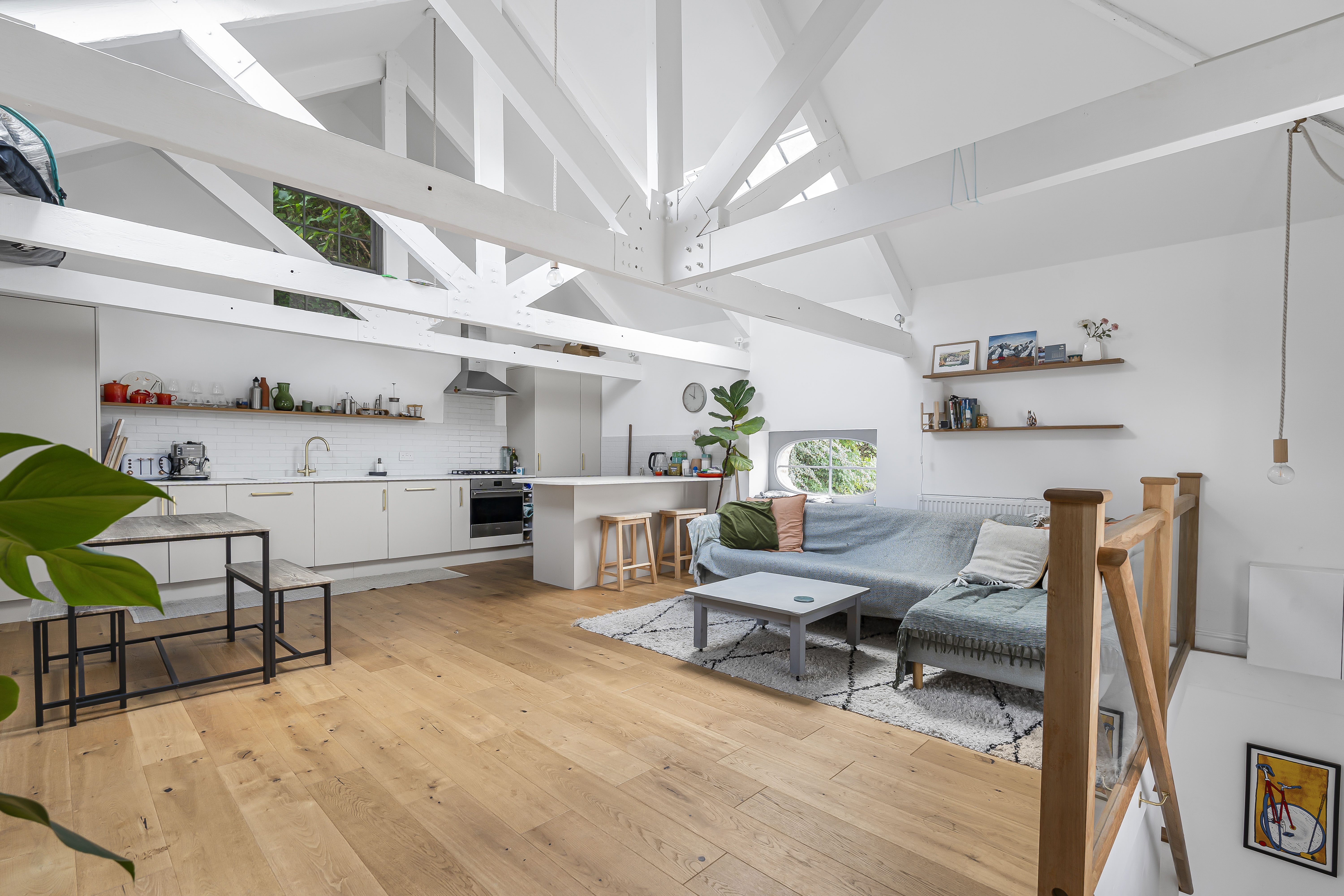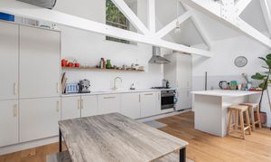 To the first floor you have a superb open plan living space, great for socialising and entertaining. It certainly has the wow factor with a beautiful, vaulted ceiling with exposed original beams, bespoke hardwood windows, and engineered oak floors. You have plenty of space for a lounge area, large dining table, and practical kitchen area.