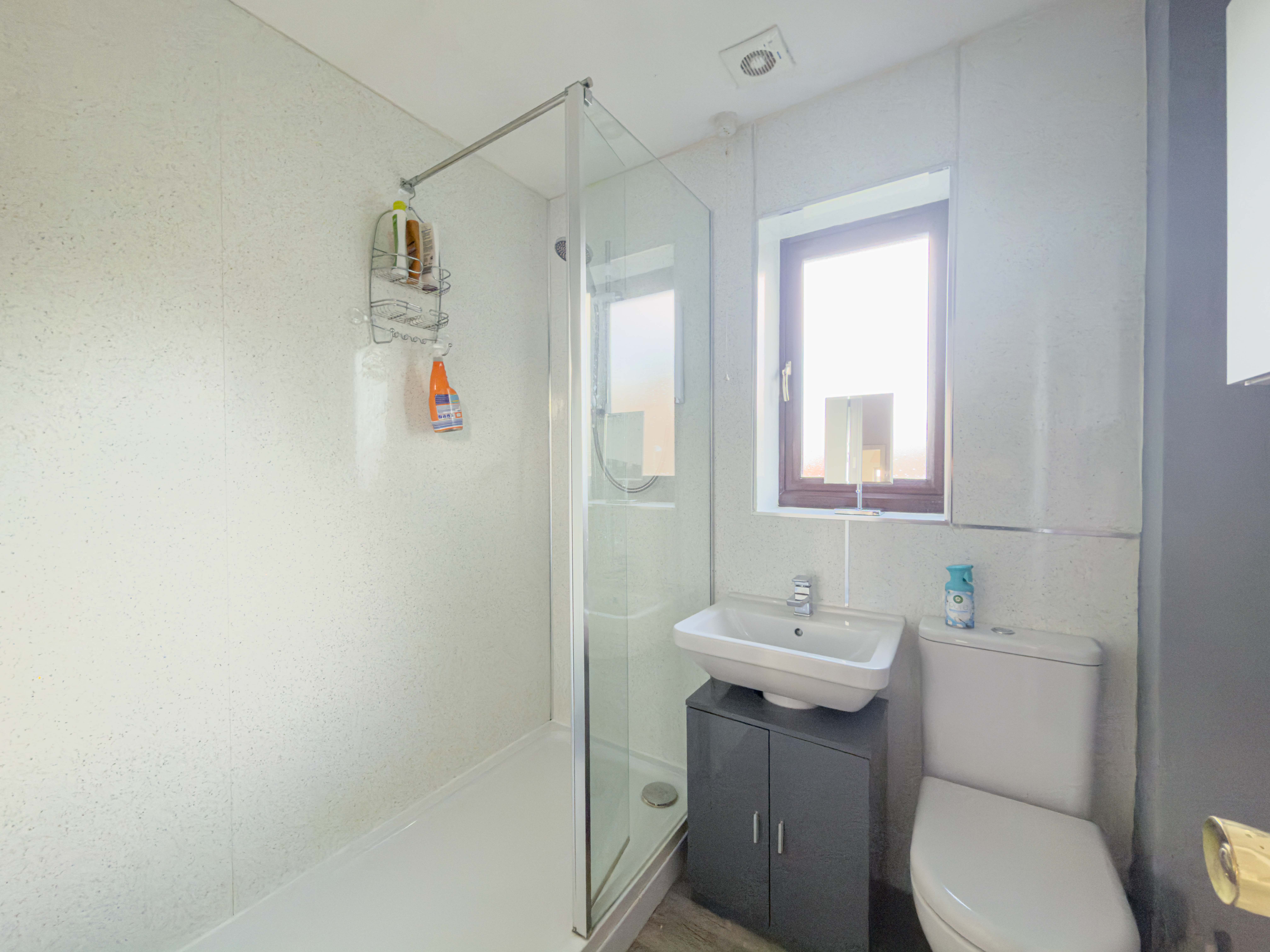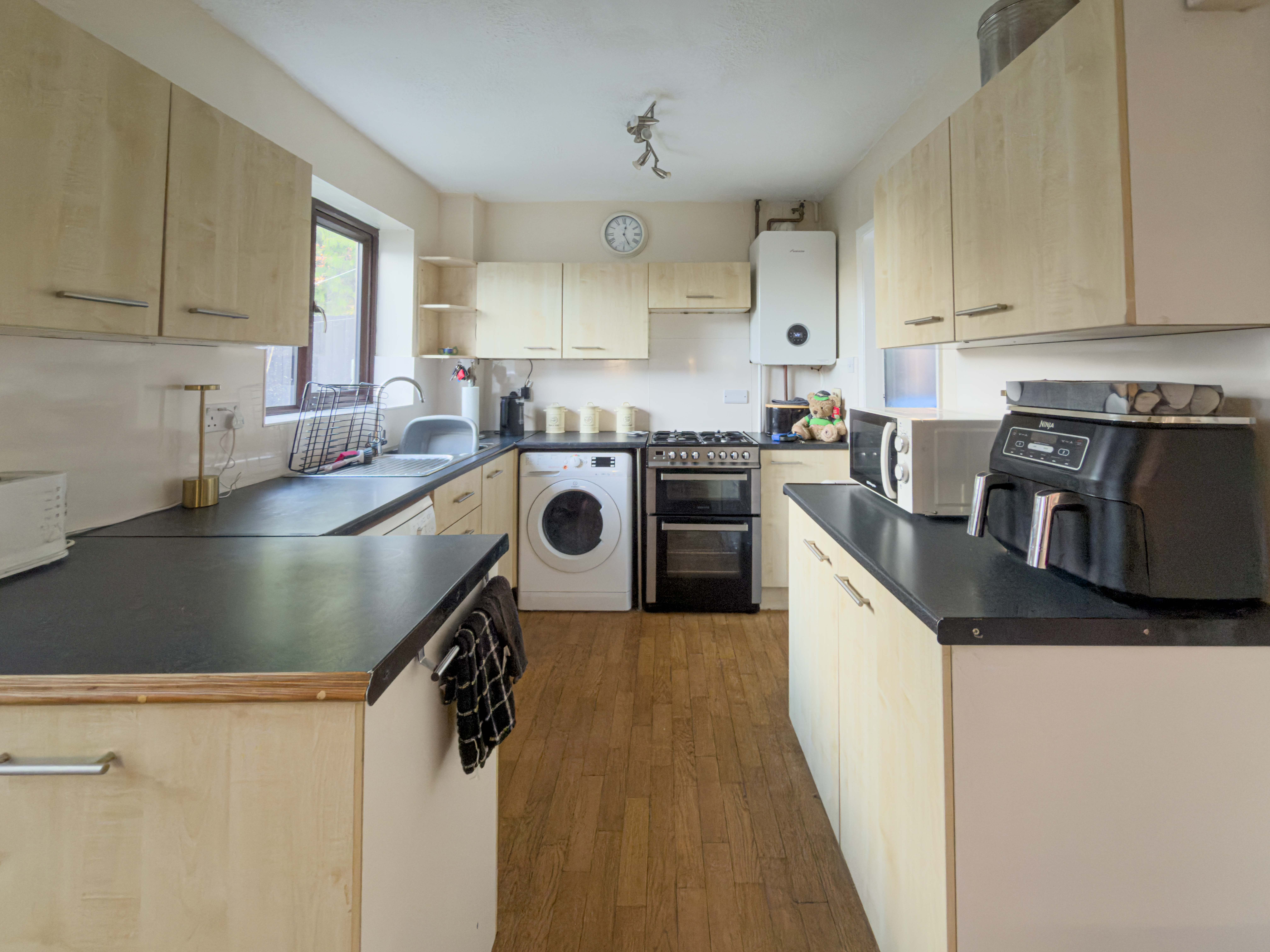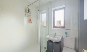 The contemporary kitchen seamlessly combines style and functionality with its modern units, integrated appliances, and ample counter space for meal preparation. Natural light pours in from a large window and a convenient door that opens directly onto the garden, creating an effortless indoor-outdoor flow ideal for family living or summer gatherings. Upstairs, you’ll find three spacious bedrooms, each thoughtfully designed with large windows that flood the rooms with natural light, neutral décor for easy personalisation. These bedrooms are versatile enough to accommodate double beds alongside wardrobes and additional furnishings, ensuring comfort for the whole family. The modern bathroom continues the home’s contemporary theme, boasting a sleek walk-in shower with a glass enclosure, stylish fixtures, a compact vanity unit for storage, and an abundance of natural light, resulting in a fresh and inviting atmosphere.