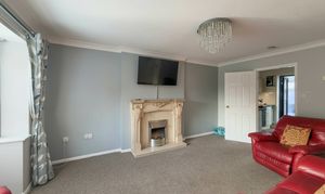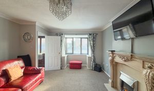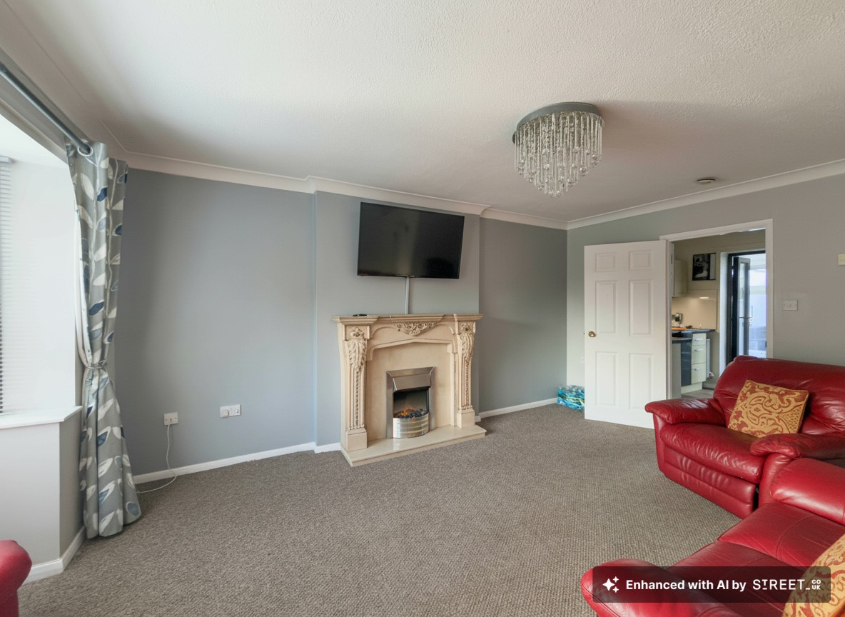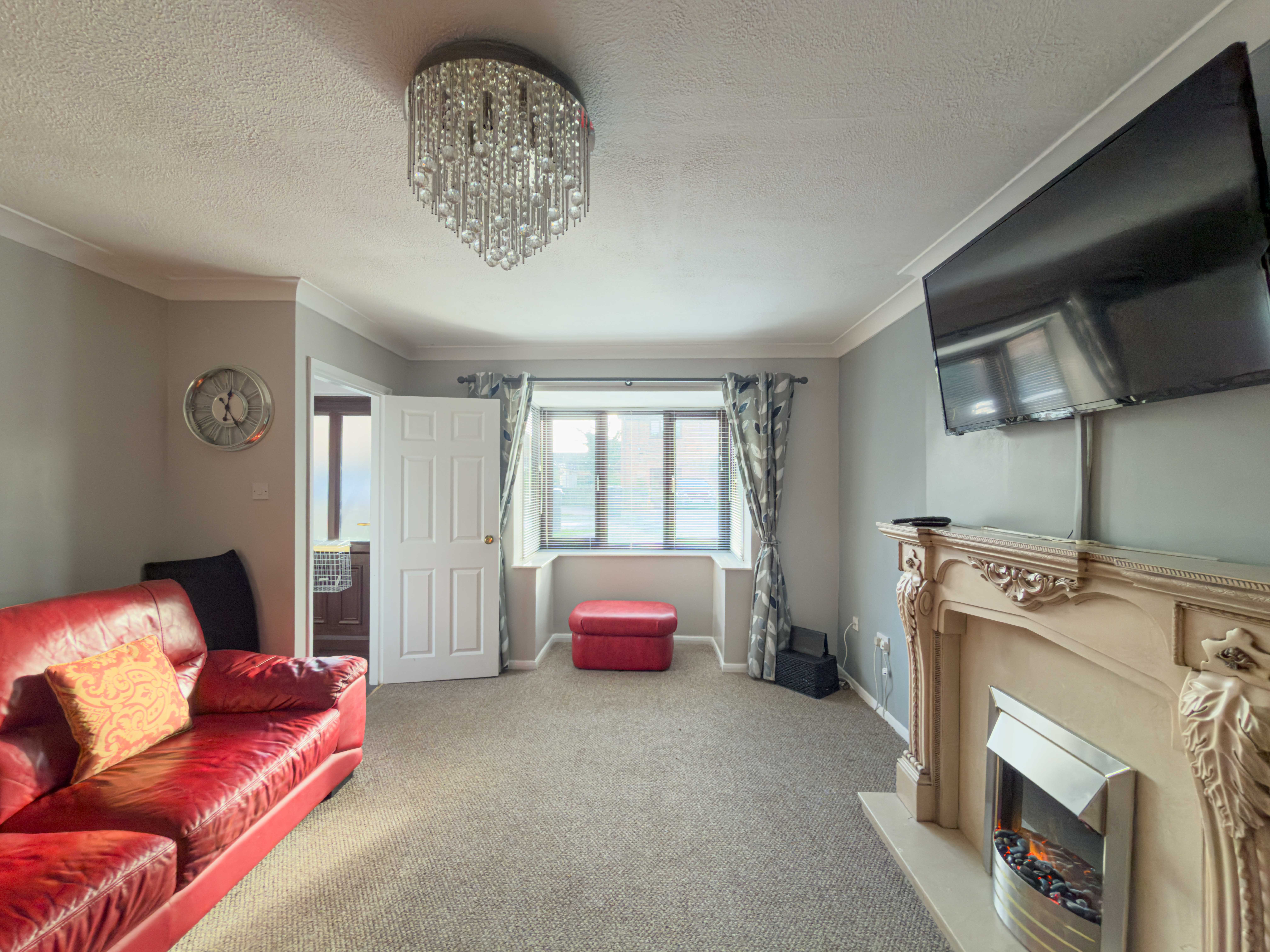This impressive three-bedroom semi-detached house offers a harmonious blend of modern design, comfort, and practical living across its thoughtfully arranged spaces. As you approach, the classic brick exterior immediately catches the eye. The spacious driveway provides ample off-road parking for multiple vehicles, while the front garden is tastefully adorned with potted plants for added kerb appeal. Stepping inside, the inviting living room serves as the heart of the home, featuring a beautifully crafted fireplace with intricate detailing as its focal point. This space is bathed in natural light from a generous bay window.