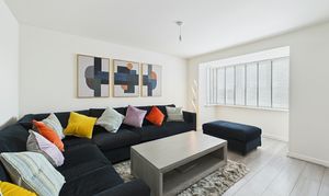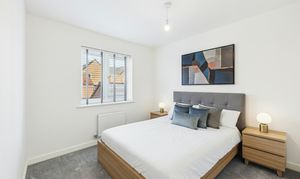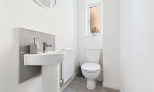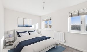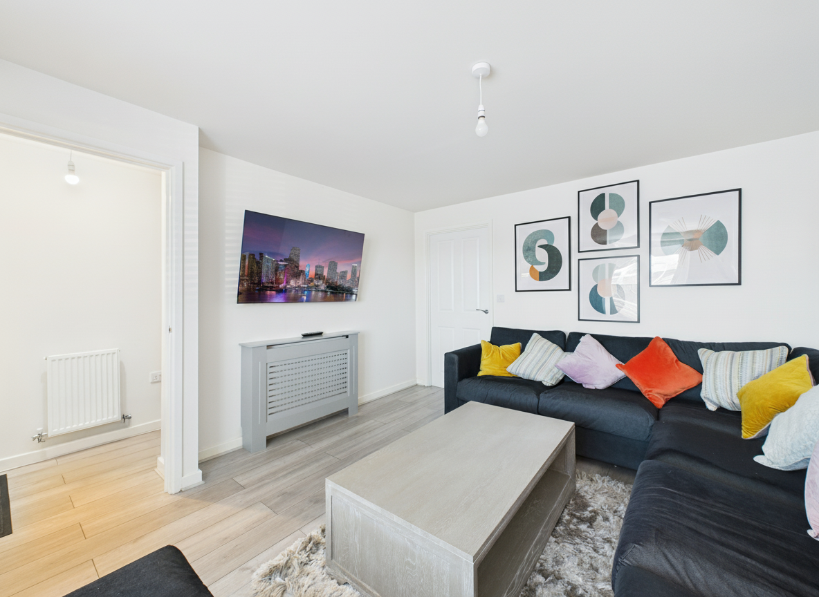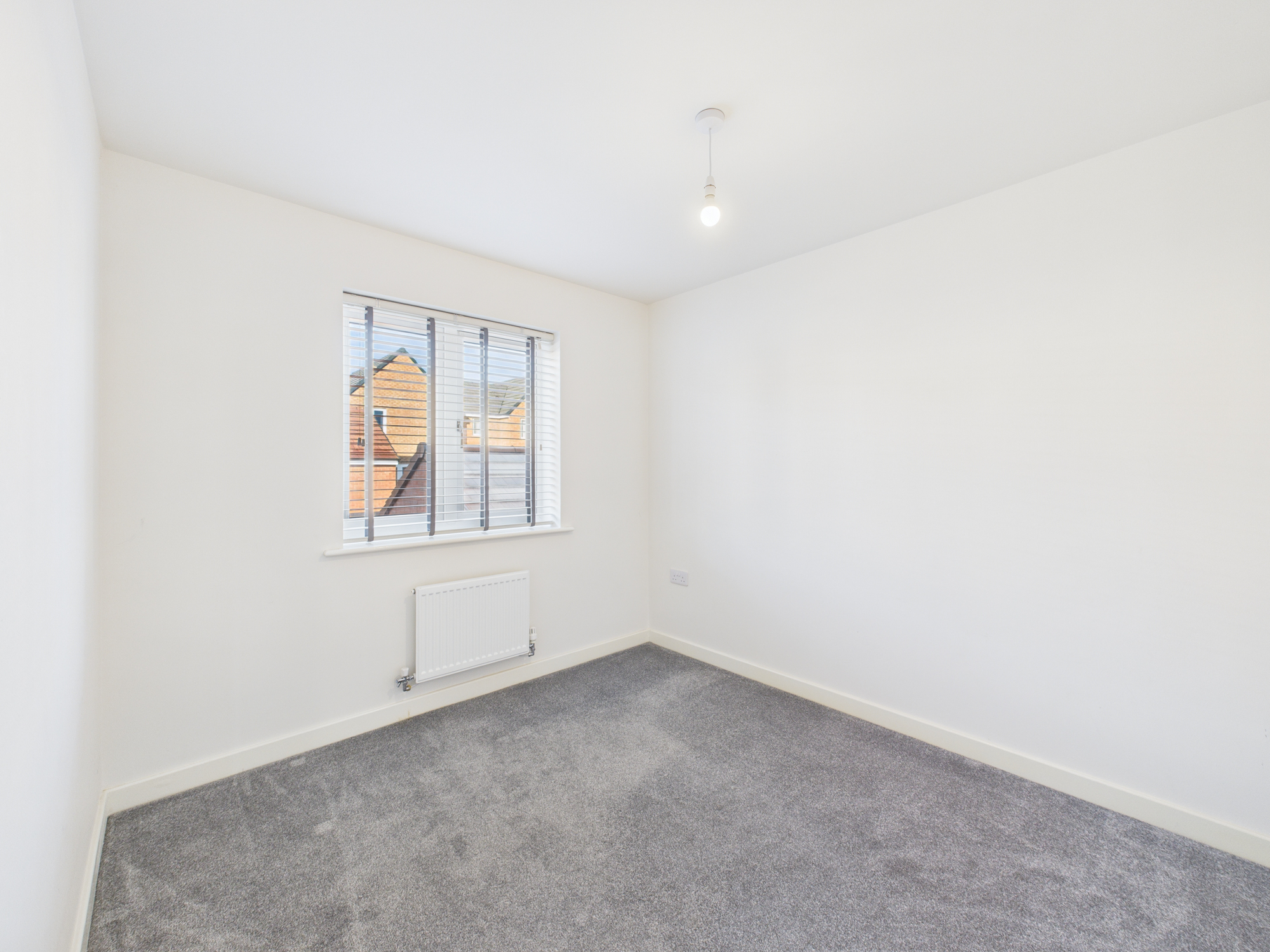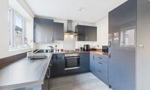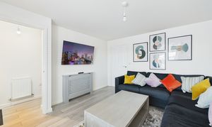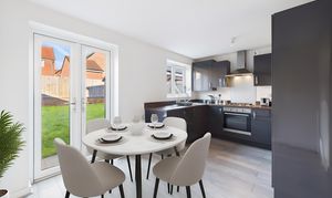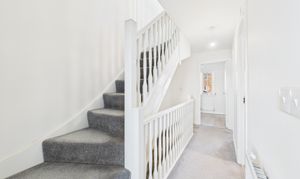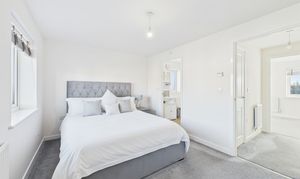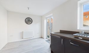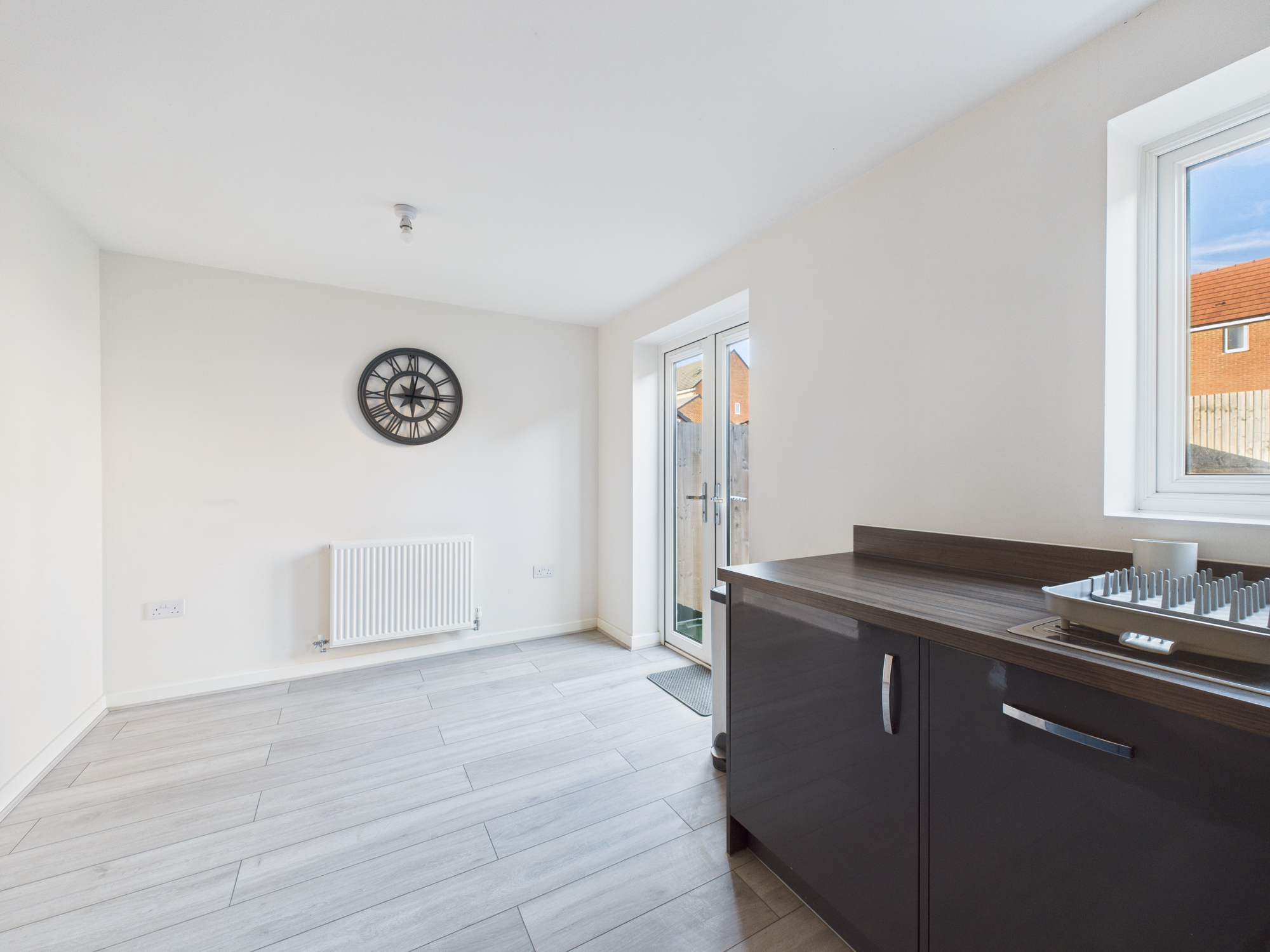 The ground floor features an initial hallway leading to a bright and spacious lounge with a feature box window, perfect for relaxing or entertaining guests. The contemporary open plan dining kitchen is a highlight, boasting integrated appliances and French doors, creating a seamless connection to the outdoors. The kitchen is equipped with an oven, hob with extractor, dishwasher, fridge/freezer and washing machine to cater to modern living needs and also has an adjoining downstairs WC.