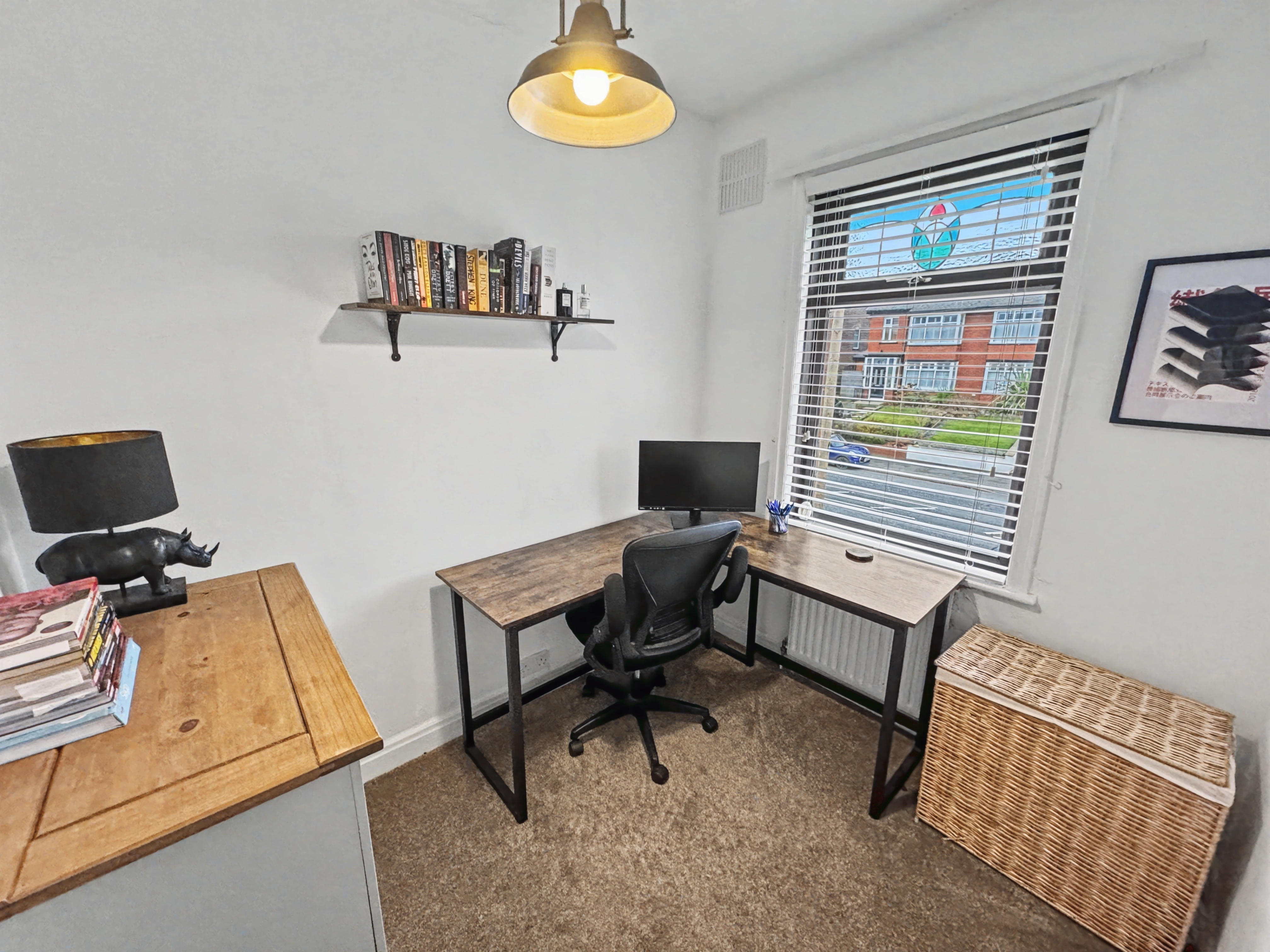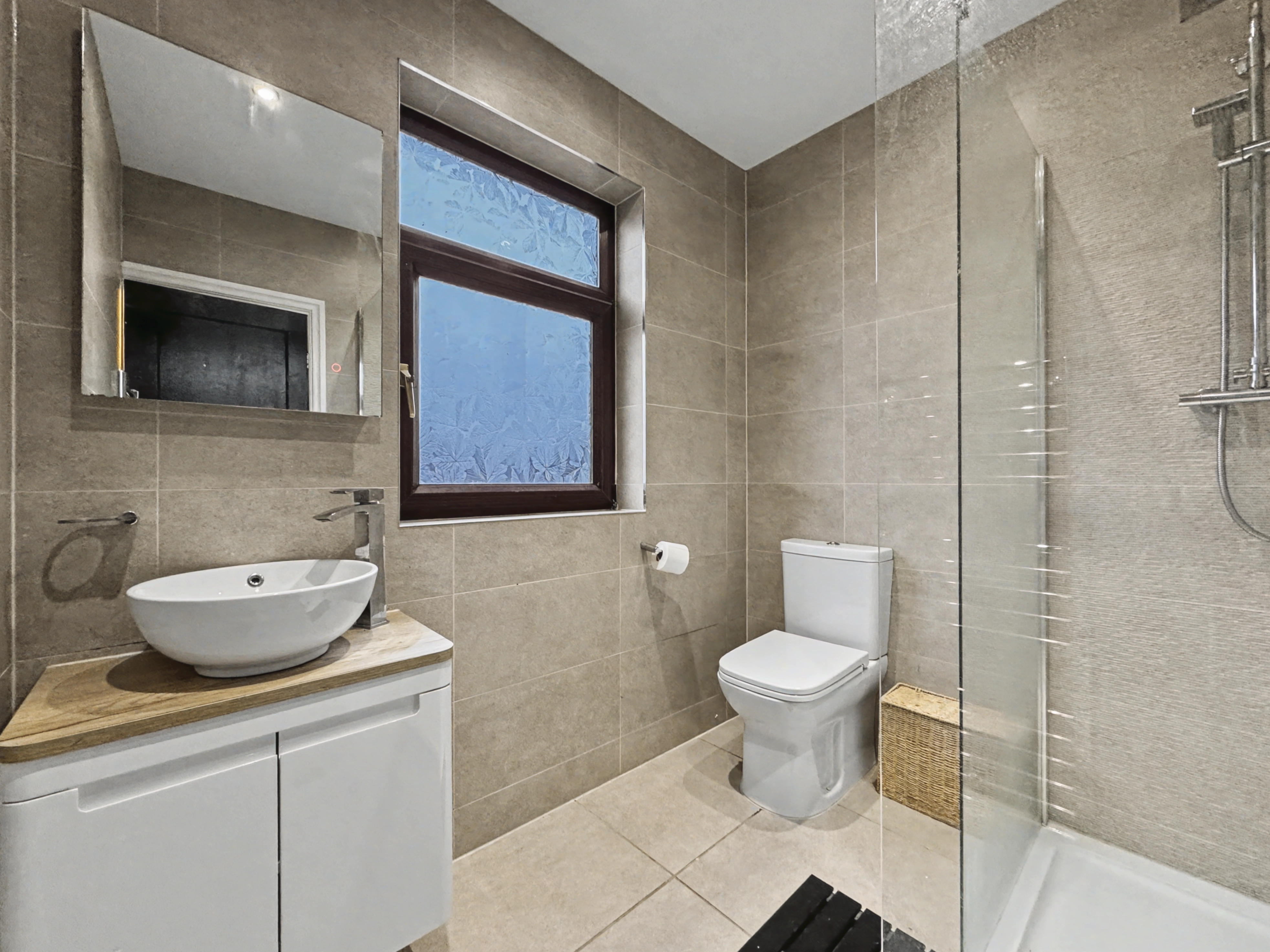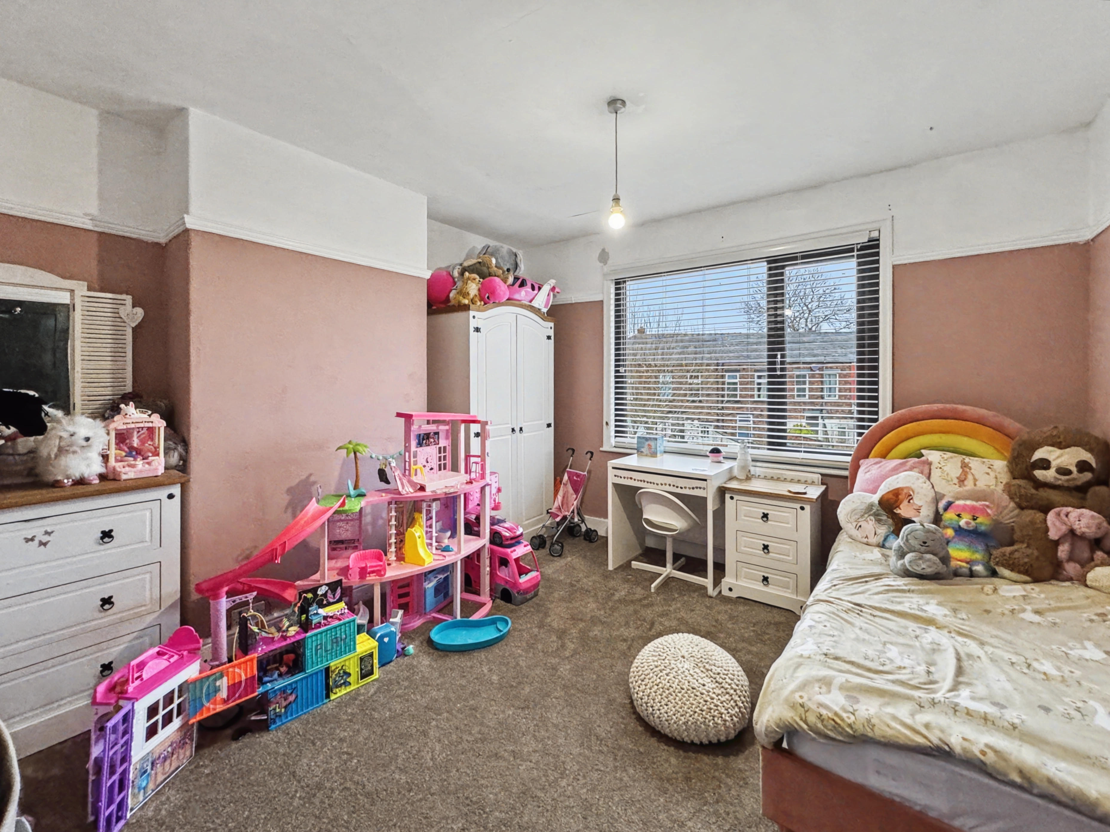 Upstairs, three well-proportioned bedrooms offer peaceful retreats, each benefitting from fresh décor with ample space for bedroom furniture. The principal bedroom is particularly impressive, with space for a king-sized bed and additional furnishings, while the remaining bedrooms provide versatility for family, guests, or home office use. The contemporary family bathroom is finished to a high standard with quality fittings, a modern three piece white suite, and tasteful tiling, ensuring both comfort and style.