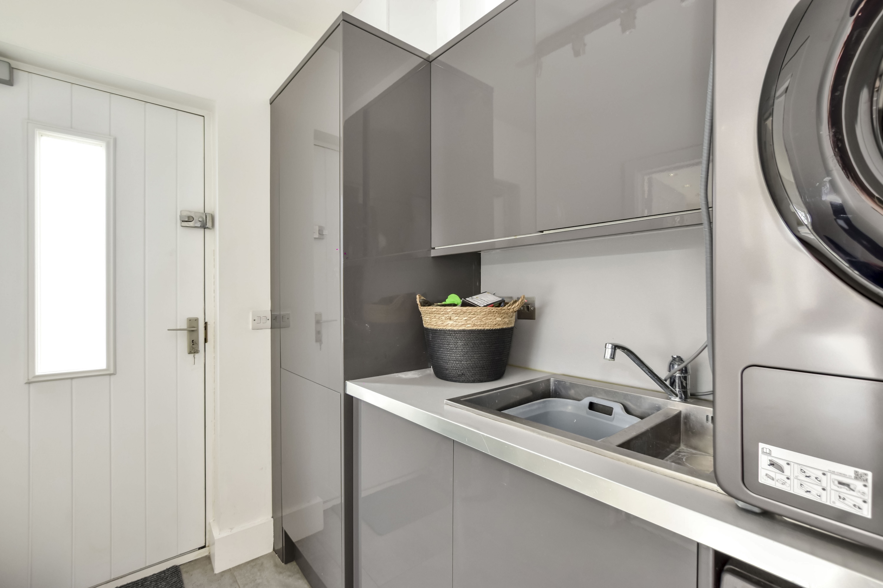 The ground floor accommodation has been remodelled and refurbished throughout. You enter in to a welcoming entrance hall with storage cupboard and access to a comfortable home office. A doorway leads you to the rear of the house, where you enter in to the wonderful main kitchen and living space. This open-plan flowing space is well designed, with dedicated lounge and dining areas. The kitchen itself is fitted in a sleek and contemporary design, with large island and granite worktops. The high ceilings and and bi-fold doors give a lovely sense of space and light. Adjacent to this is a large conservatory with solid roof, which overlooks the garden. Additionally, there is a separate utility room and downstairs W/C.