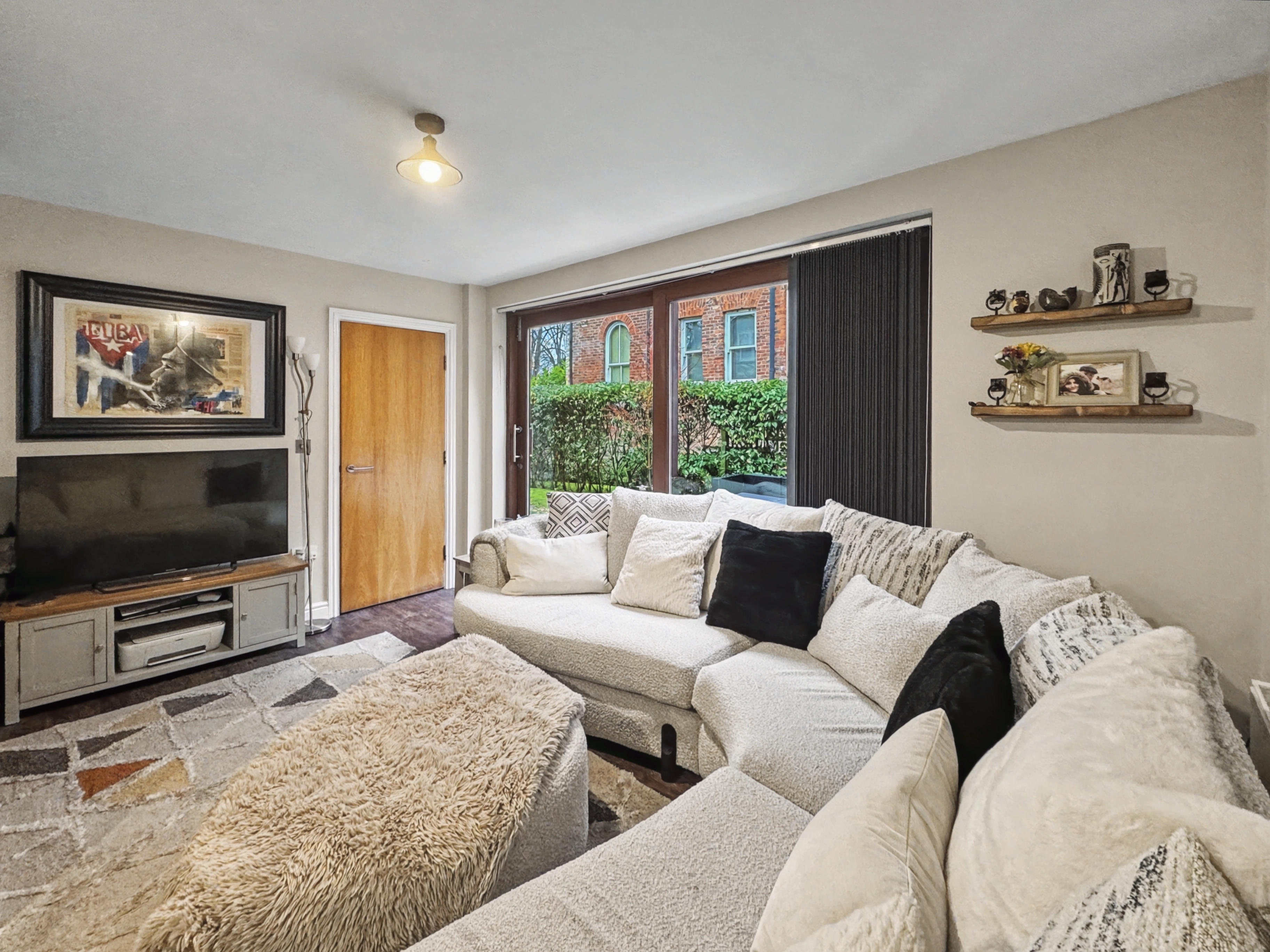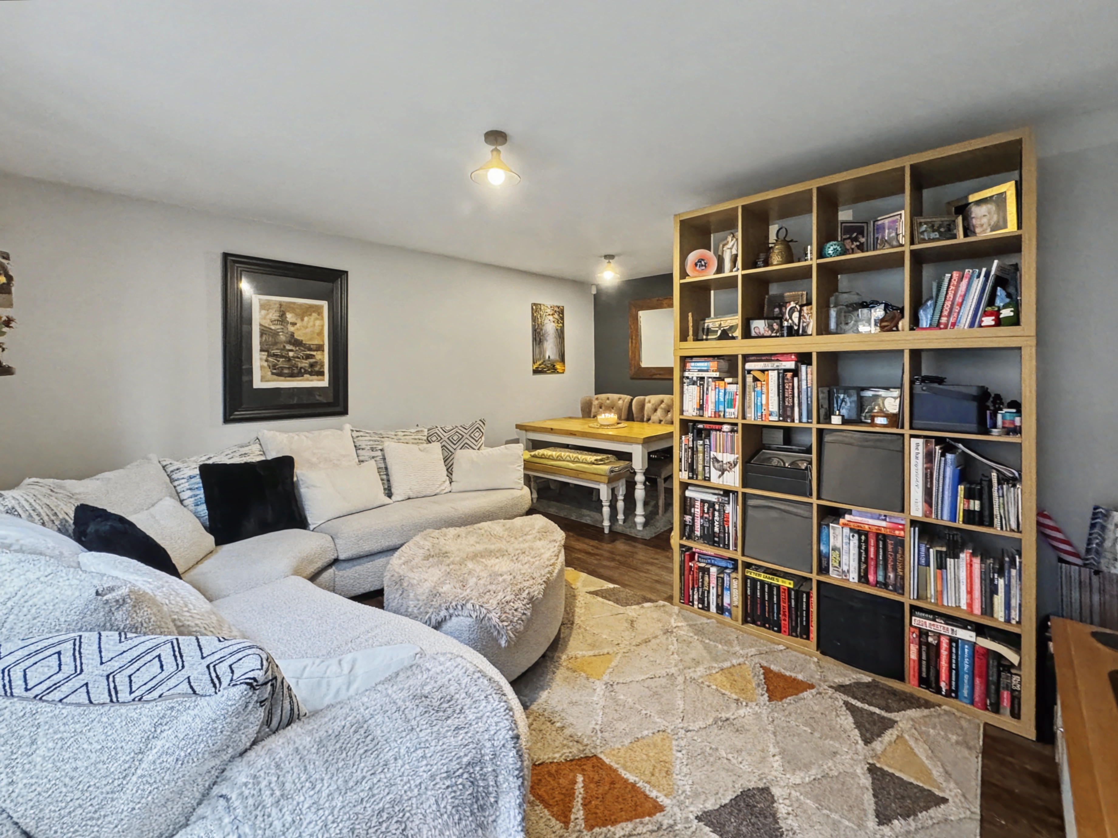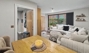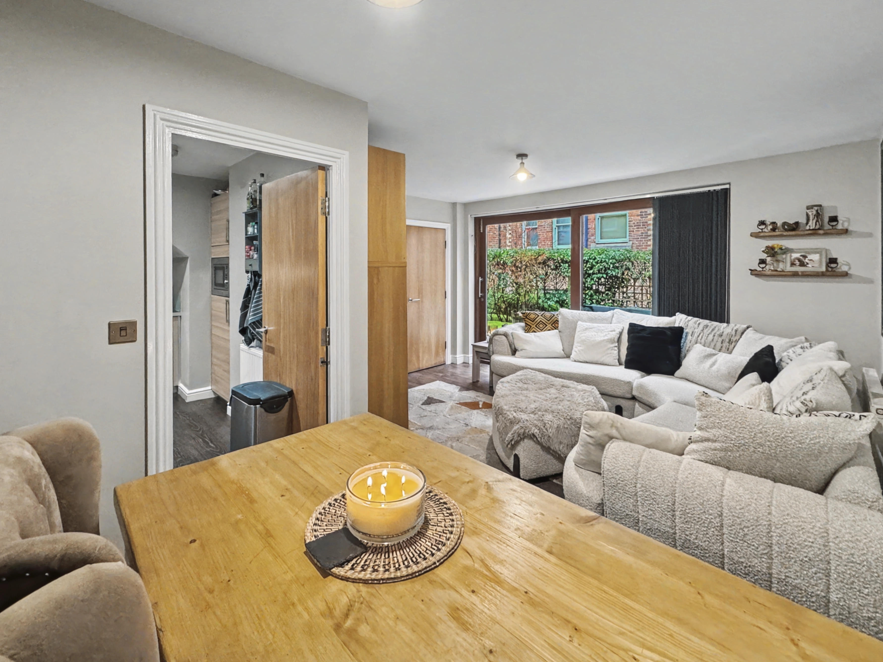 The accommodation centres around a bright and generously sized lounge, offering ample space for both relaxing and dining. Patio doors from the living room open directly into the garden area, creating easy access for outdoor living and making it ideal for summer entertaining. Natural light enhances the sense of space throughout, adding to the room’s welcoming feel.
