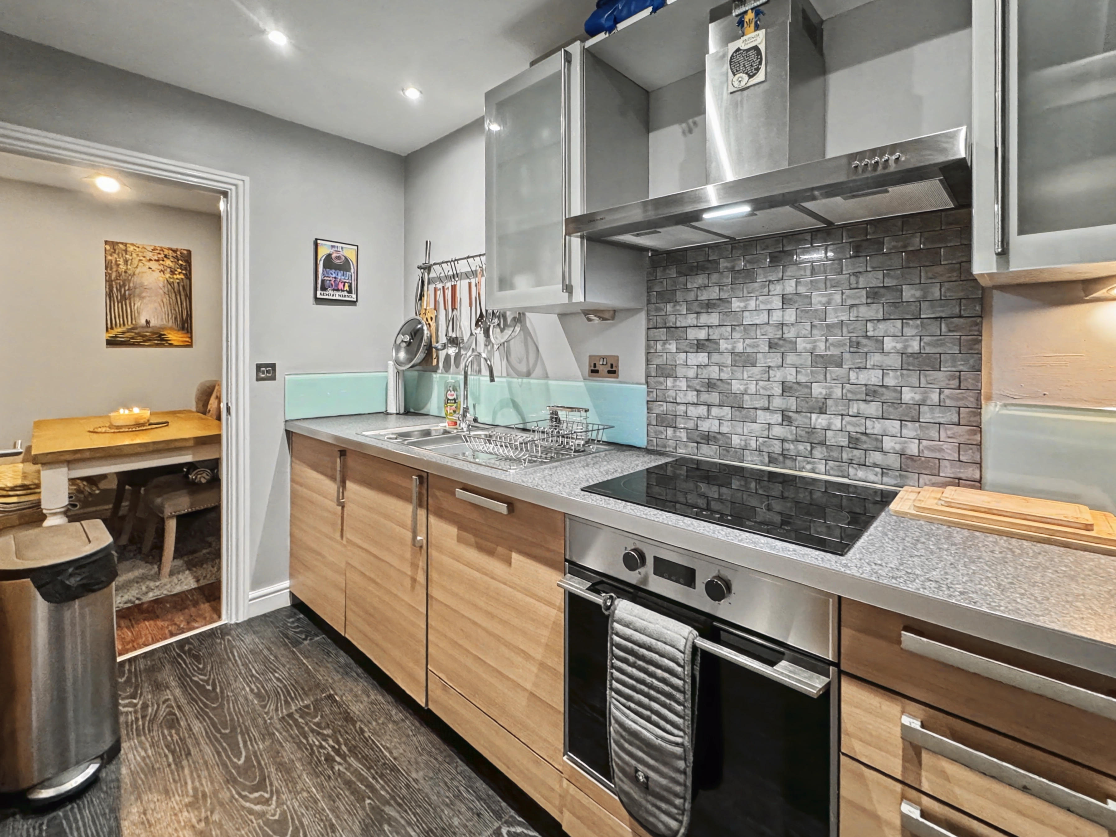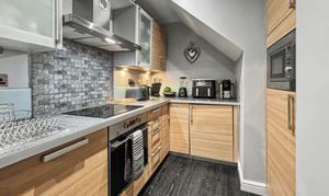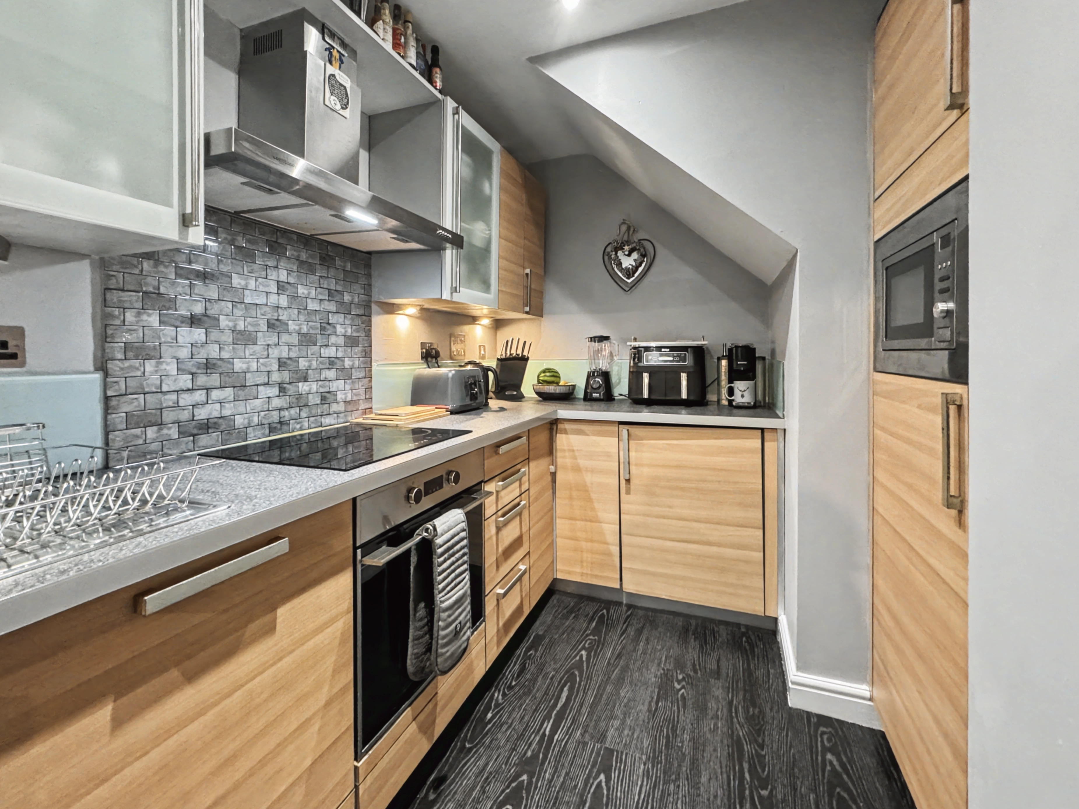 A contemporary kitchen complements the living area and is thoughtfully designed with modern units and practical worktop space. Integrated appliances include a fridge, freezer, washing machine, microwave, cooker and dishwasher, all of which are included, making the kitchen both stylish and highly functional for everyday use.