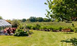 The rear garden is a real highlight, beautifully landscaped with a paved patio beneath a wooden pergola, ideal for outdoor dining. A further lawned area with mature planting, trees, and a large greenhouse leads down to the river, where the property enjoys a panoramic, open west-facing aspect across the neighbouring meadows. The garden also benefits from useful enclosed storage space.