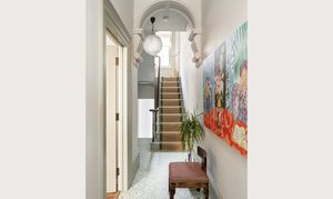 The house retains its period charm, with high ceilings, original fireplaces and ornate cornicing providing a sense of grandeur. A centre staircase winds upwards through the home, its delicate spindles and graceful curve forming a sculptural focal point.