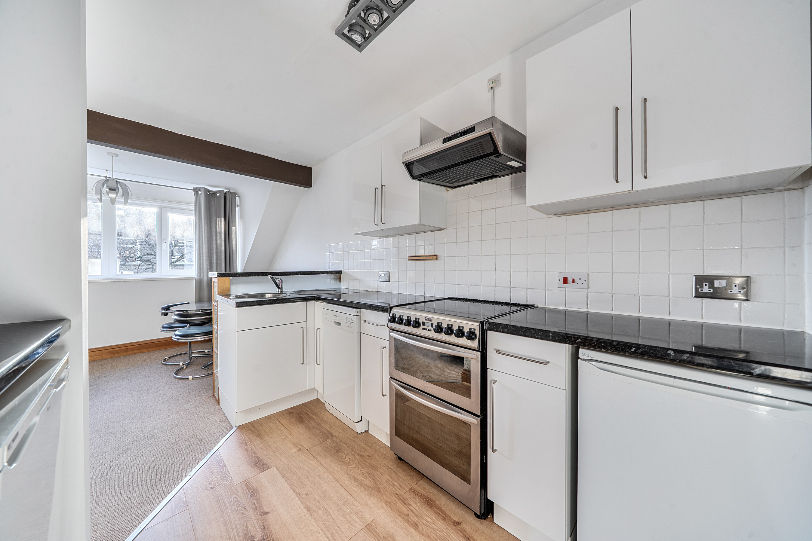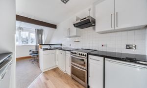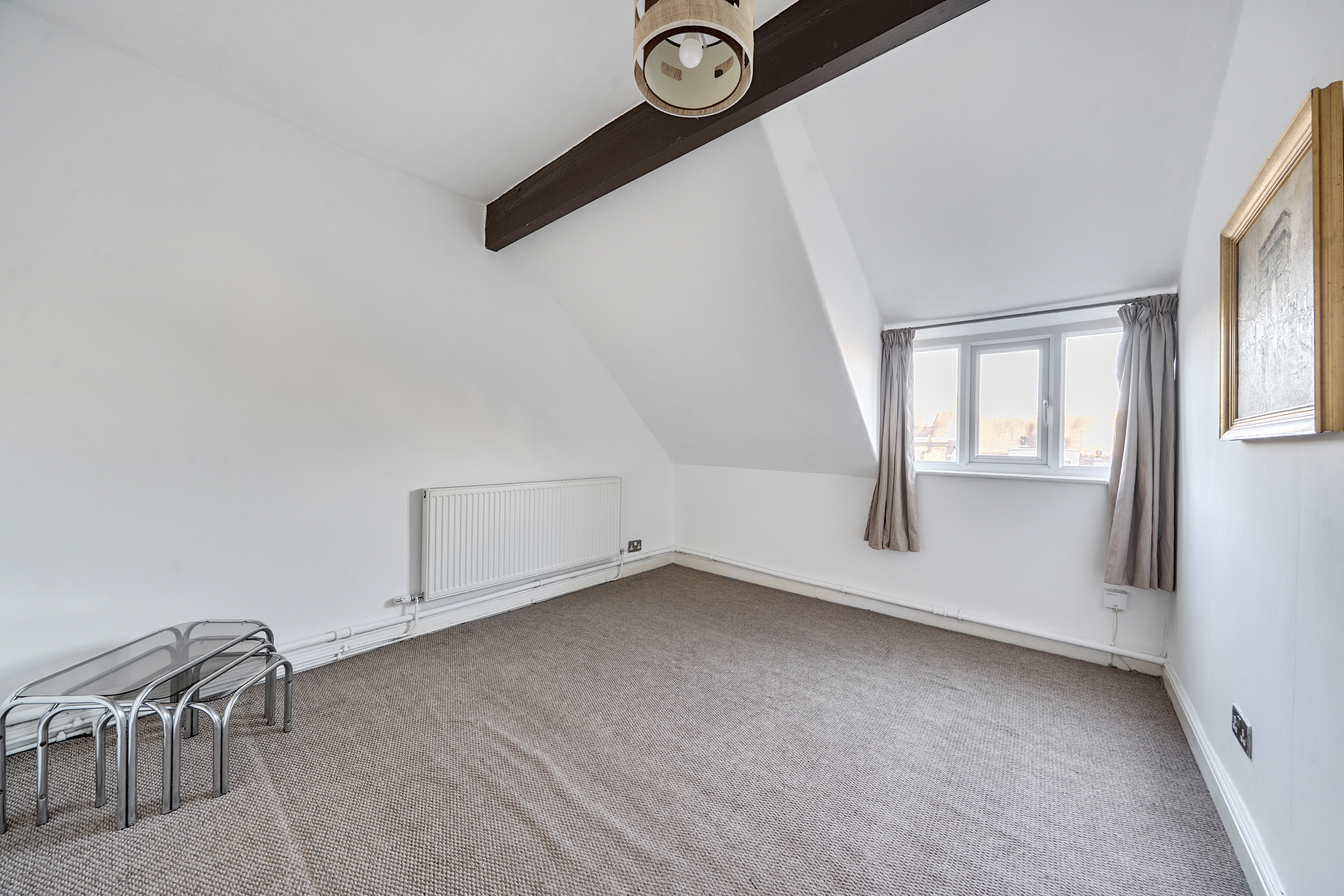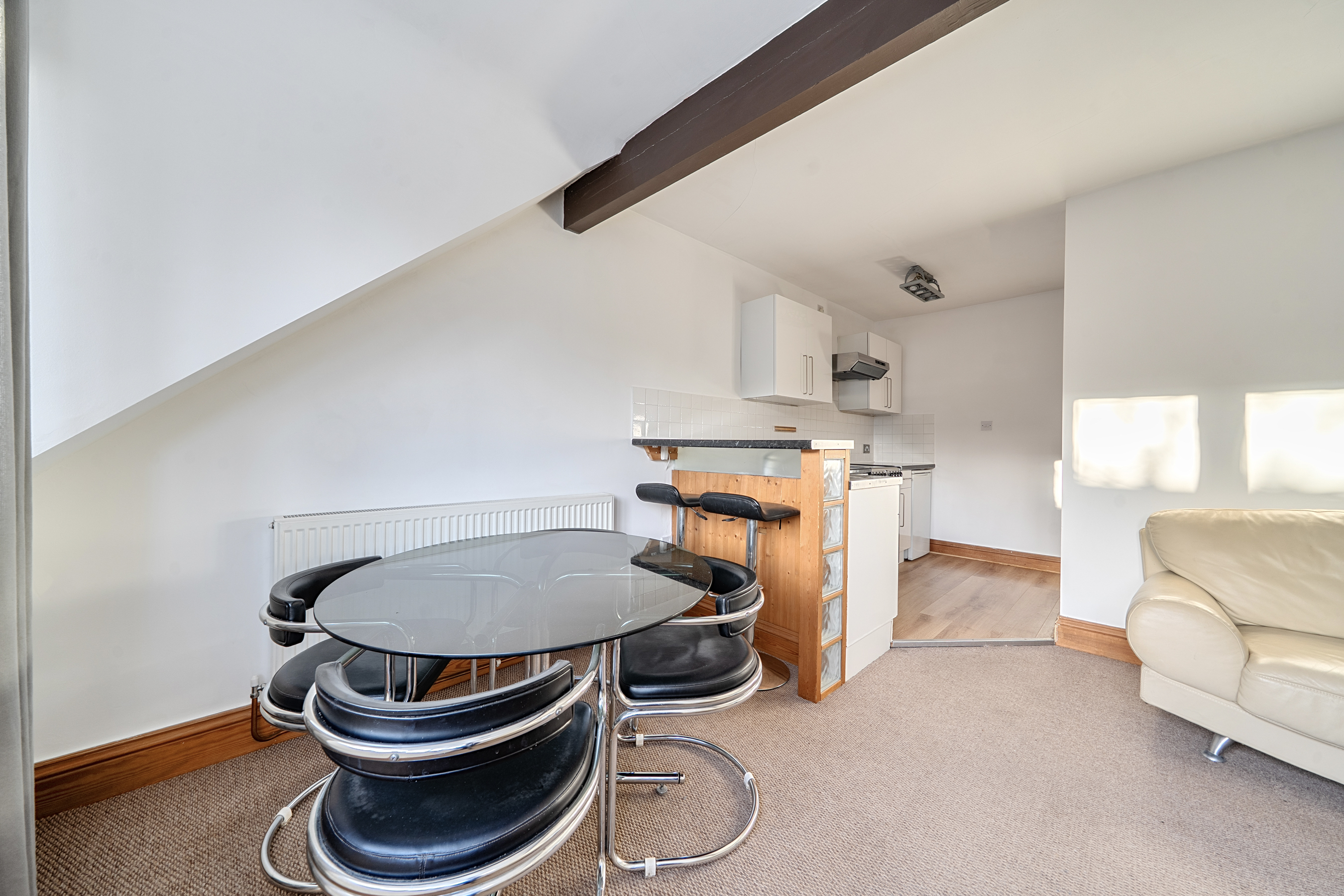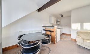Accessed via a secure communal entrance, the apartment has a private entrance hall at first-floor level with stairs leading up to the main accommodation. The south-facing open plan living area is a lovely naturally bright space, featuring a large dormer window and plenty of room for both lounge and dining furniture. Adjoining is a modern kitchen with a breakfast bar and a range of appliances including fridge, freezer, dishwasher and freestanding cooker with hob and extractor. To the rear of the property is a comfortable double bedroom with rooftop views, and a contemporary bathroom fitted with a white suite, shower over the bath, modern tiling and a heated towel rail. A particularly useful feature is the mezzanine level - accessed via a pull-down ladder - which is currently arranged as a home office, benefiting from Velux windows and excellent natural light. Further advantages include gas central heating, double glazing and on-street permit parking to the front.