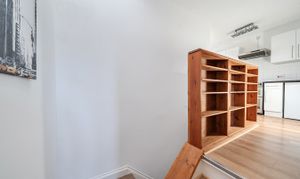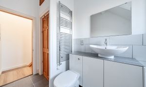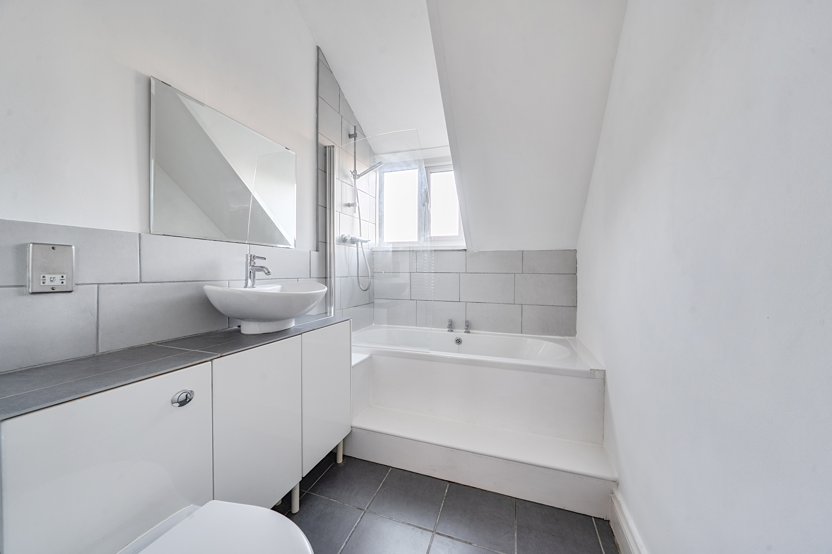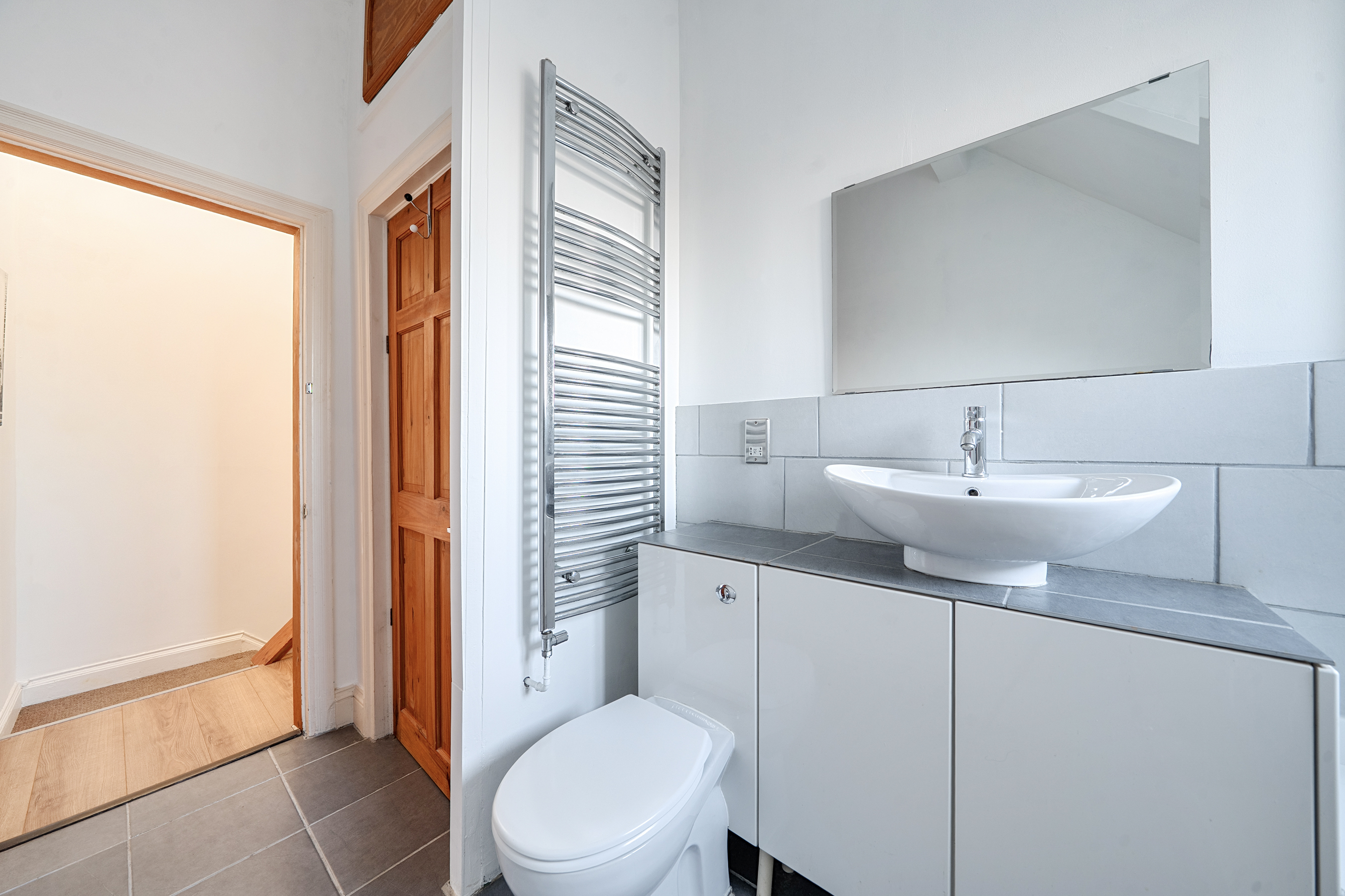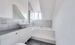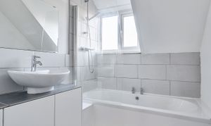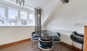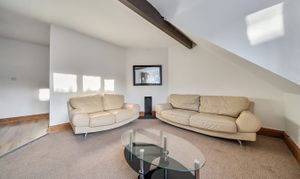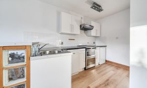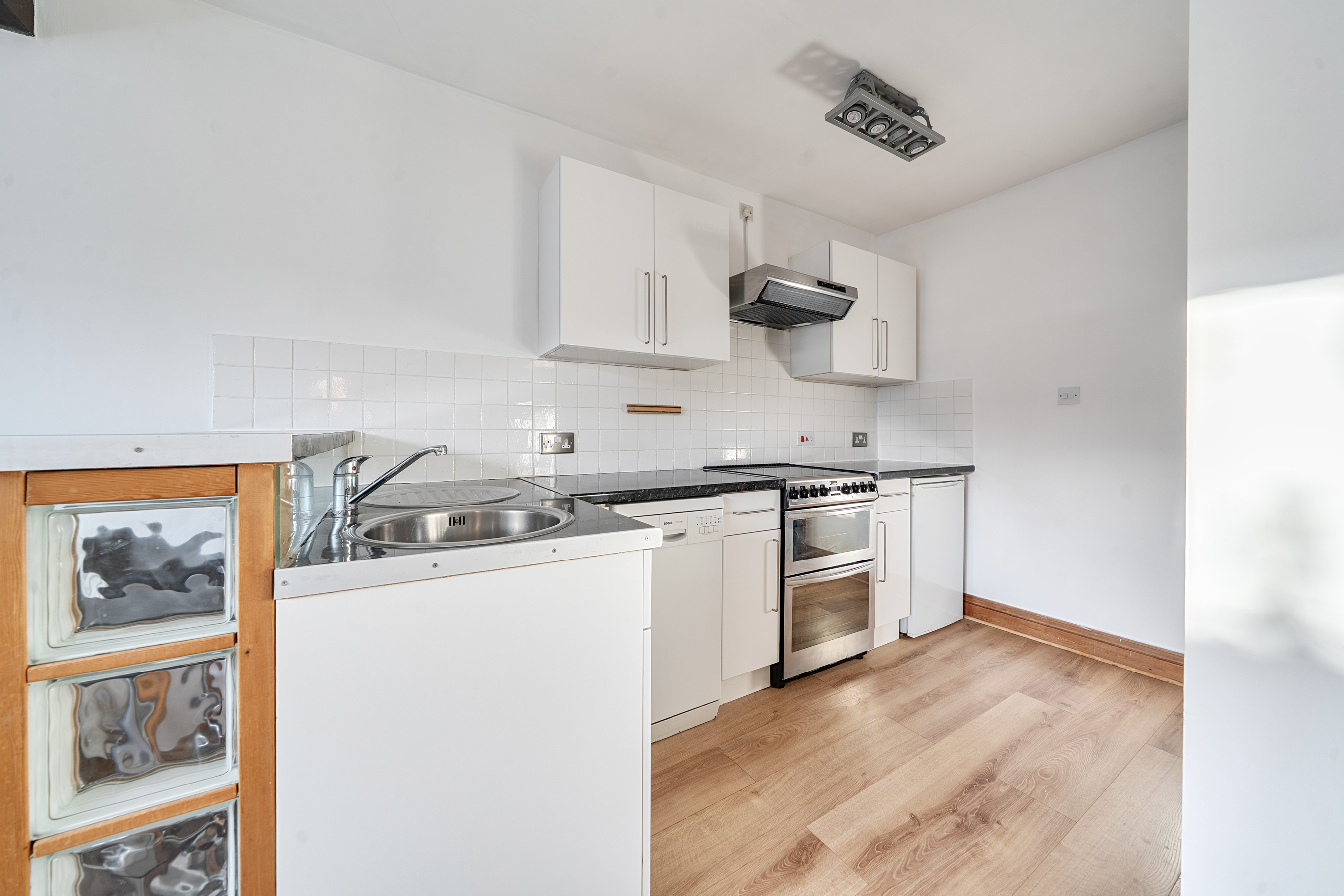 Accessed via a secure communal entrance, the apartment has a private entrance hall at first-floor level with stairs leading up to the main accommodation. The south-facing open plan living area is a lovely naturally bright space, featuring a large dormer window and plenty of room for both lounge and dining furniture. Adjoining is a modern kitchen with a breakfast bar and a range of appliances including fridge, freezer, dishwasher and freestanding cooker with hob and extractor. To the rear of the property is a comfortable double bedroom with rooftop views, and a contemporary bathroom fitted with a white suite, shower over the bath, modern tiling and a heated towel rail. A particularly useful feature is the mezzanine level - accessed via a pull-down ladder - which is currently arranged as a home office, benefiting from Velux windows and excellent natural light. Further advantages include gas central heating, double glazing and on-street permit parking to the front.