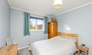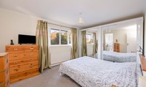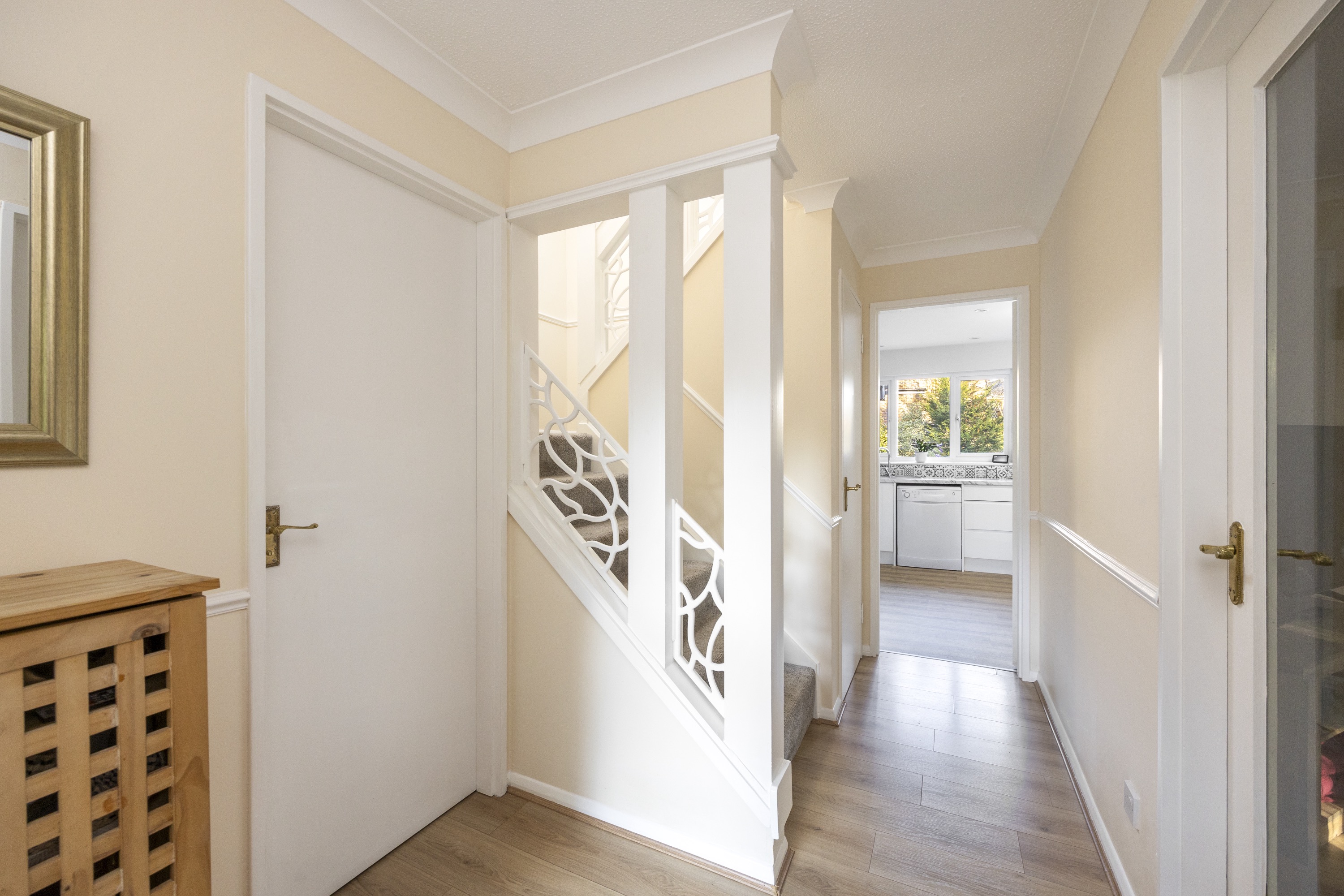 Ascending the main staircase, set beneath Art Deco–style balustrades and complemented by a feature window, the first floor presents four well-proportioned bedrooms. The principal bedroom includes fitted wardrobes and an en-suite. The main family bathroom has been recently refitted to a high standard.