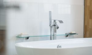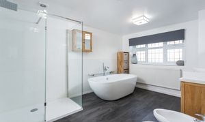 The house bathroom is larger than average and is equipped with a walk-in shower, statement free standing bath, low level WC, bidet and large sink in a luxurious wooden vanity. The flooring is laid with high quality laminate, ideal for this area of the home.