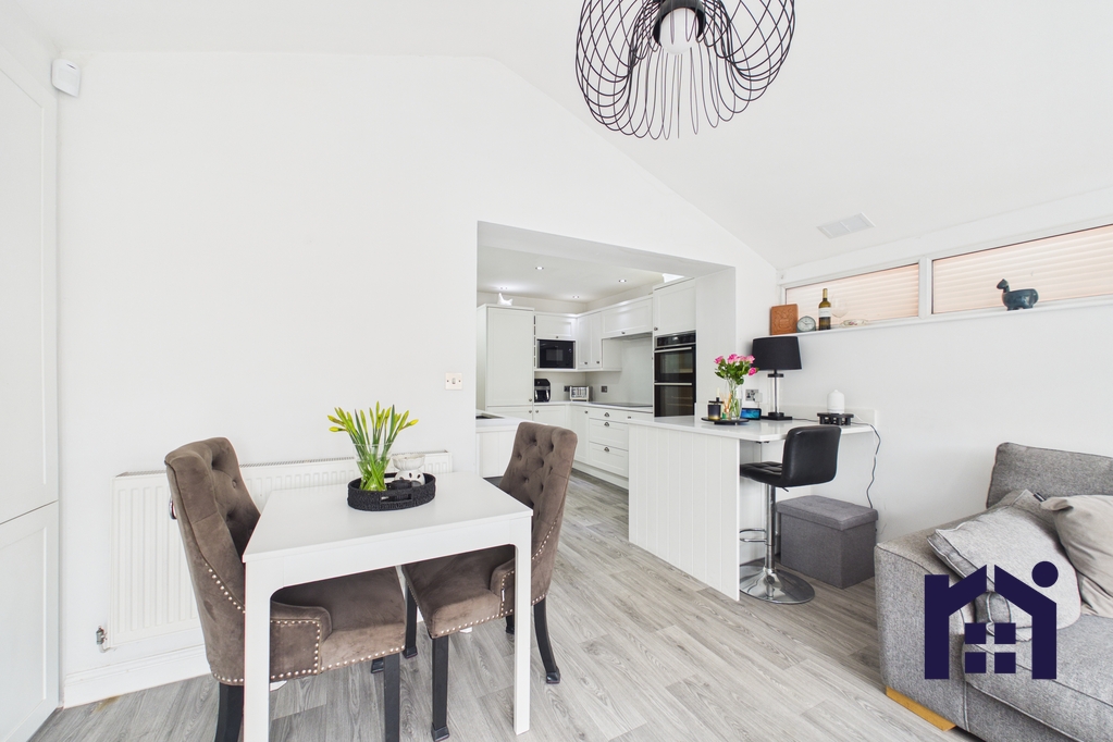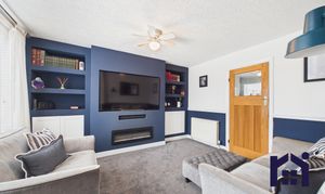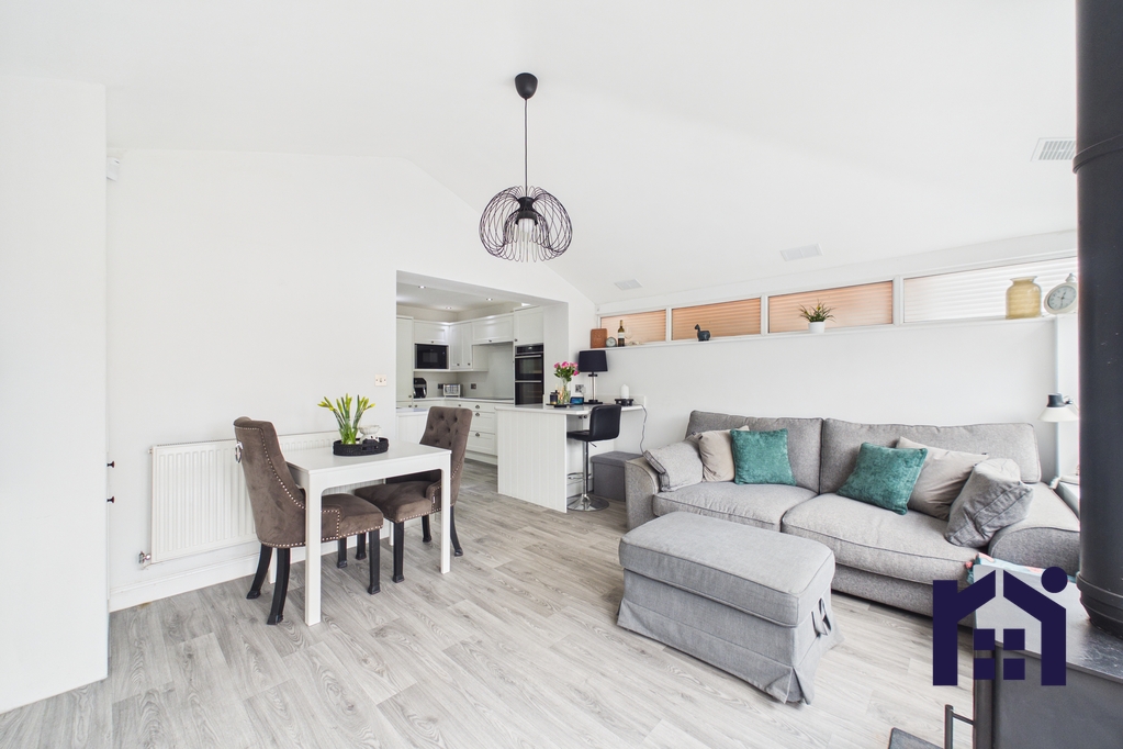 The property is approached via a two-car driveway and opens into a practical porch, providing excellent space for coats and shoe storage before stepping into the main home. The living room is a warm and inviting space, featuring a smart media wall with electric fire and built-in alcove storage. A large window to the front elevation fills the room with natural light, creating a bright yet cosy atmosphere. Moving further into the home, you enter the spacious family room. Immediately to the right is the stylish family bathroom, fitted with a bath and overhead rainfall shower, WC, wash hand basin with fitted storage and plumbing for a washing machine. The kitchen is finished to a high standard with a range of modern wall and base units, complemented by quartz worktops and splash back. Integrated appliances include a dishwasher, fridge freezer, Neff microwave, induction hob and double oven, while a Quooker tap adds a premium finishing touch. The property has been extended to create an impressive open-plan dining and seating area, centred around a multi-fuel burner. With plenty of space for entertaining and everyday family living, this room enjoys lovely views out onto the south-west facing garden.