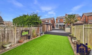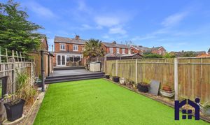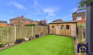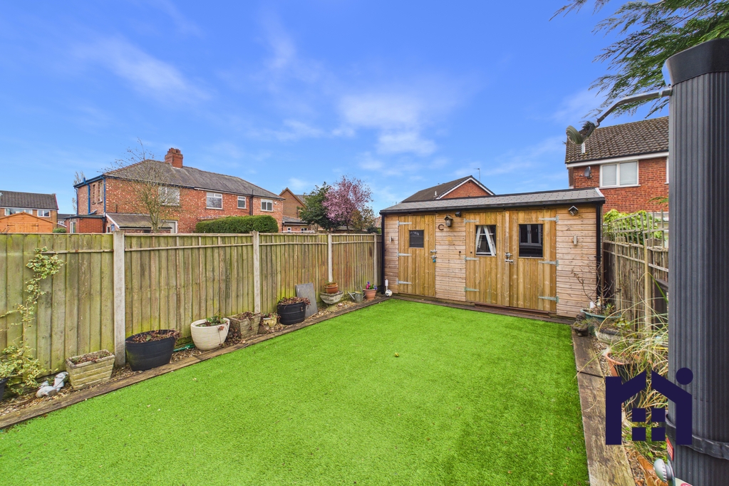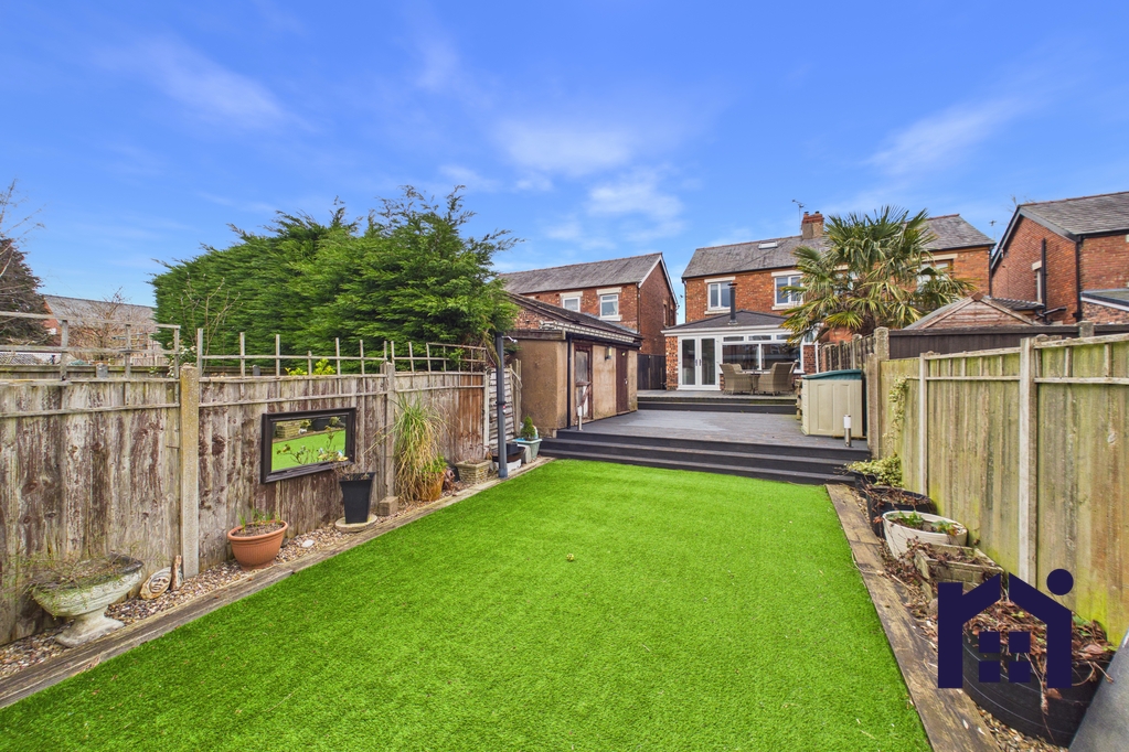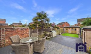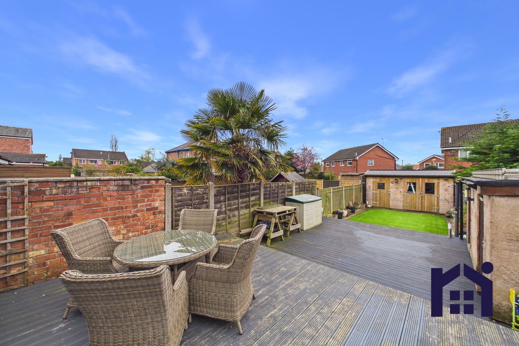 Externally, the garden has been thoughtfully designed for both relaxation and practicality. A large decked seating area provides the perfect entertaining space, while a side access pathway leads to the driveway and includes both hot and cold outdoor taps. At the far end of the garden is an area of astro turf and a substantial shed with power and lighting, currently used as a gym and workshop. Additional storage with power and lighting is located on the decking.