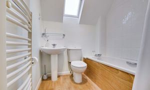 With double glazed skylight window to the wide elevation, laminate floor, part tiled walls, bath with shower over, low-level WC, wash hand basin, radiator.