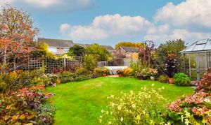 With paved patio seating area, steps leading to lawn, flowerbeds and shrubs, greenhouse, access to the garage. gravelled area to the rear.
