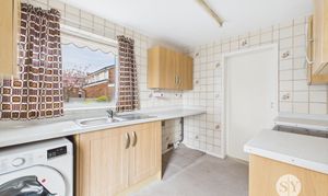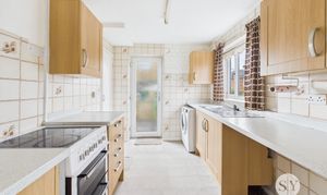 Carpet flooring, fitted base and wall units with contrasting worktops, tile splashback, sink and drainer, space for freestanding cooker, space for fridge freezer, space for washing machine and tumble dryer, under the stairs storage cupboard, UPVC double glazed frosted door, UPVC double glazed window