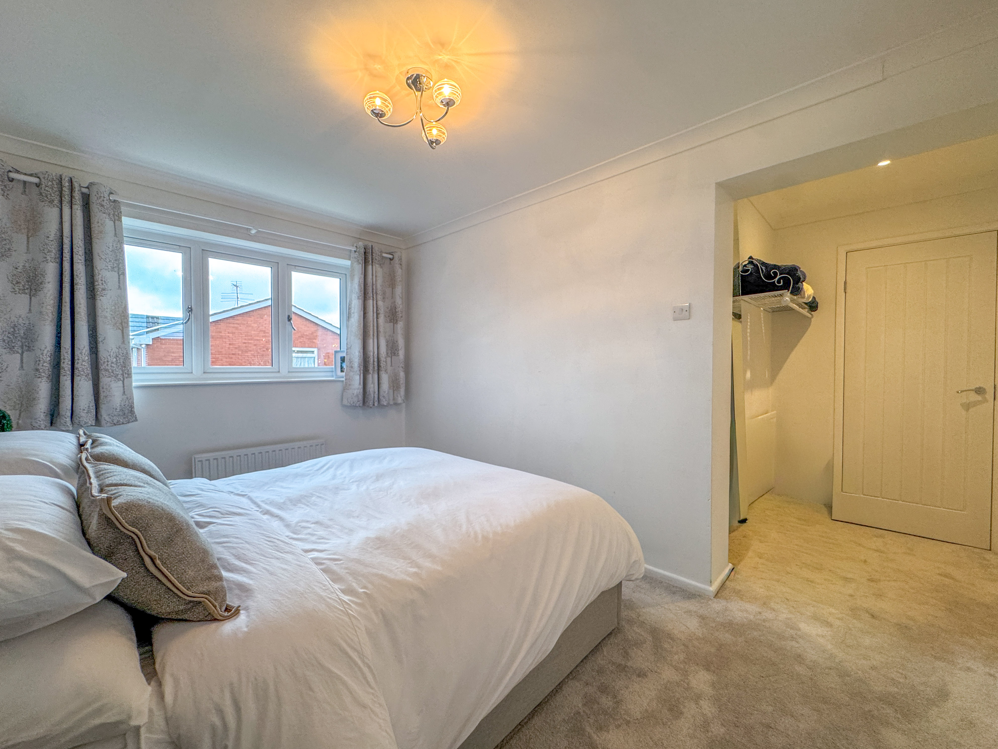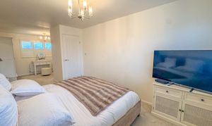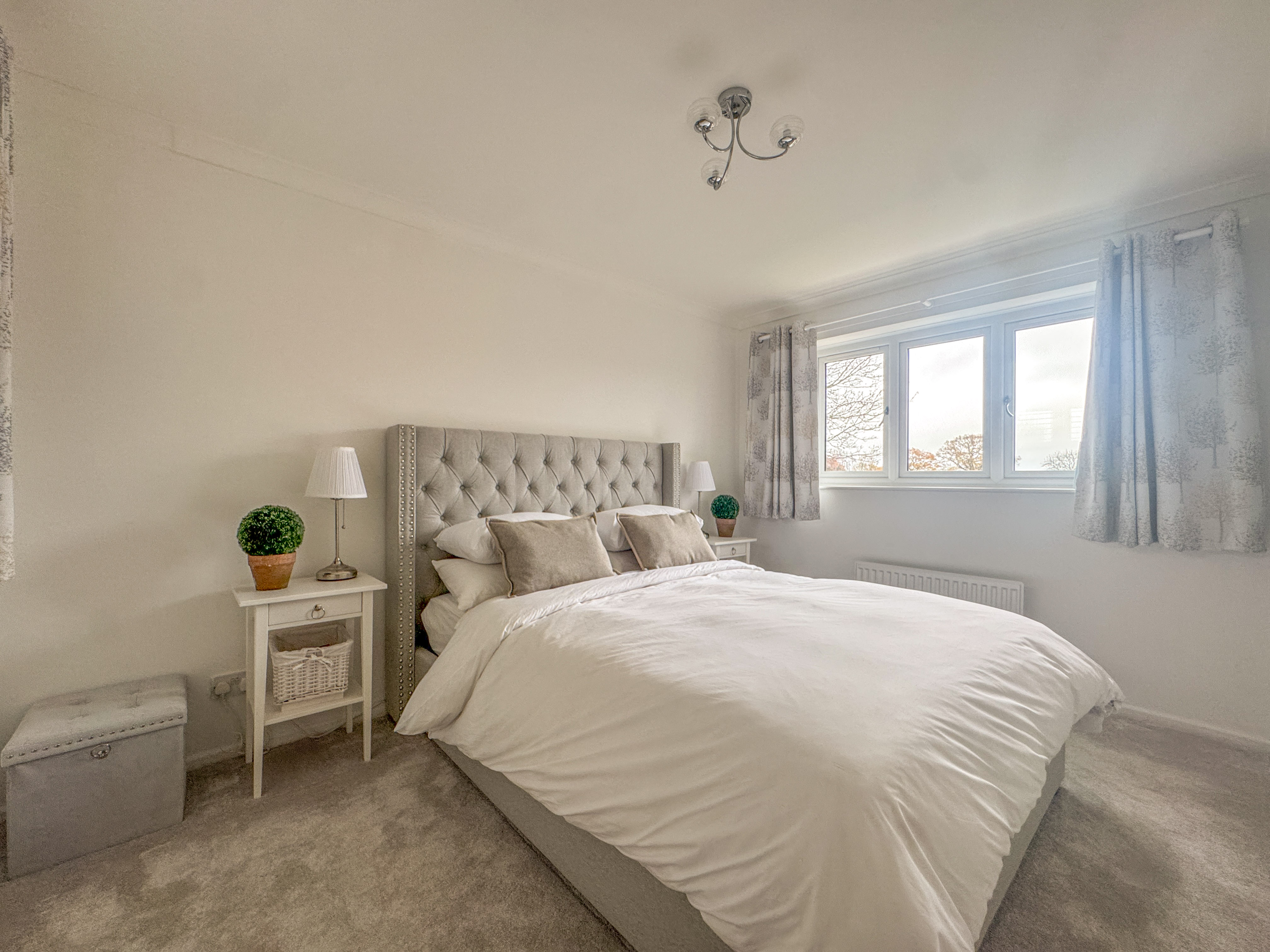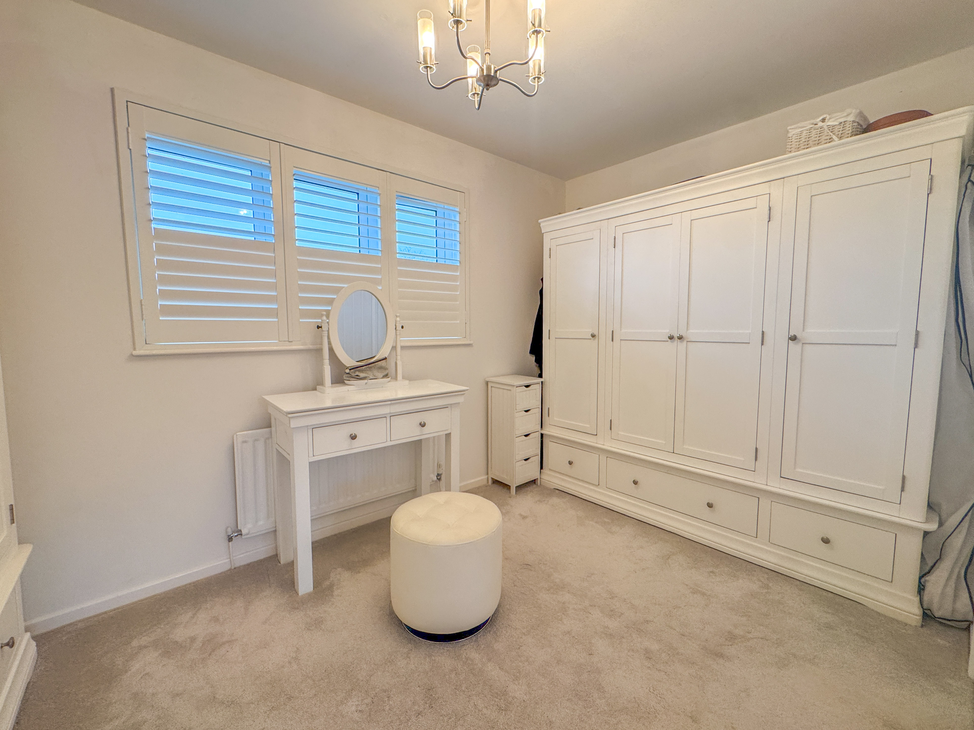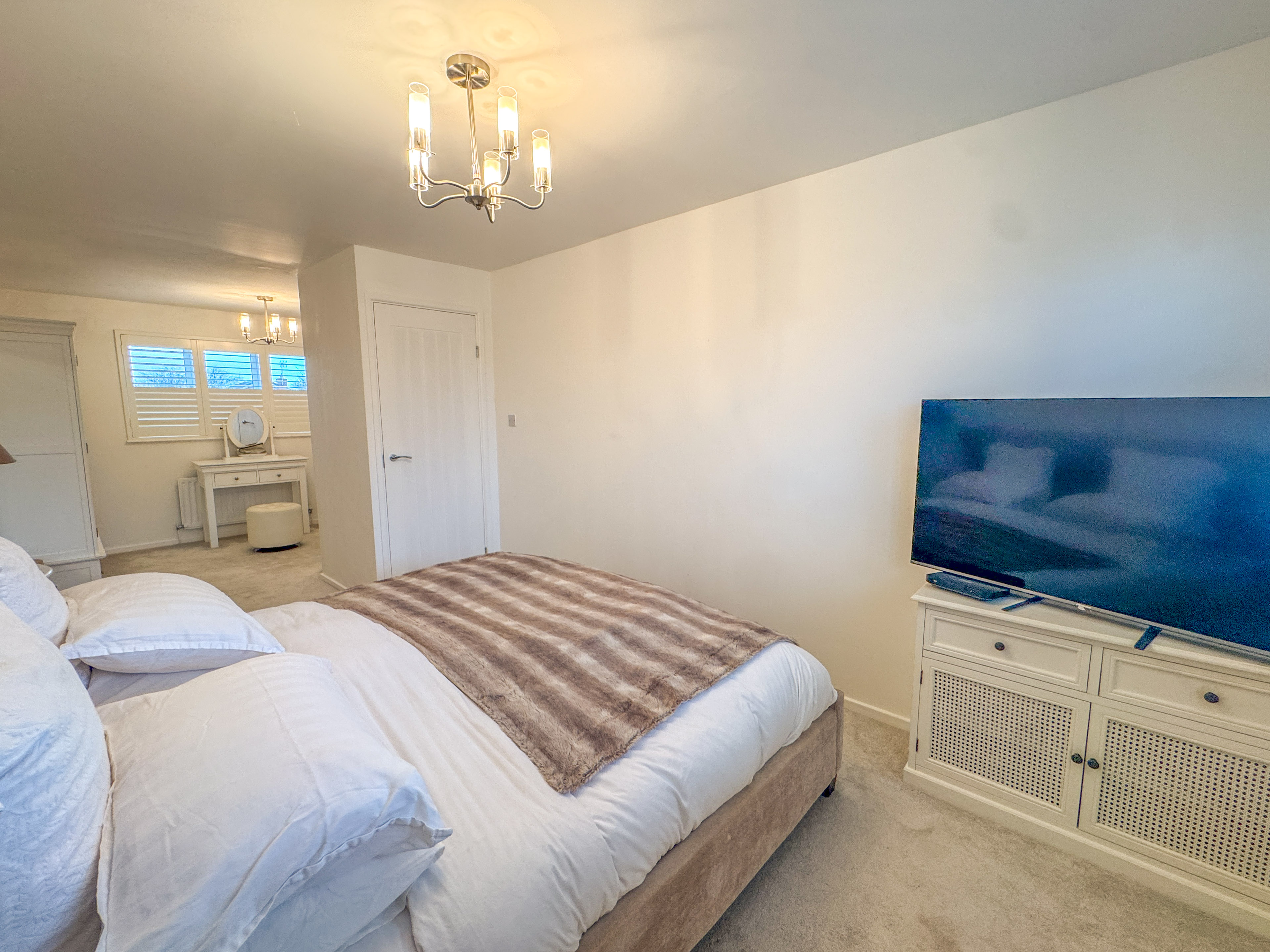 To the first floor, the layout has been reconfigured to create a show-stopping principal suite, formed by combining two of the original bedrooms into one substantial space with dressing room (The stud wall can be reinstated to return to a four-bedroom layout if desired.) There are two further double bedrooms, one with a WC/cloaks and both with built-in wardrobes—additionally there is a stylish luxury bathroom featuring premium tiling, fixtures and underfloor heating.