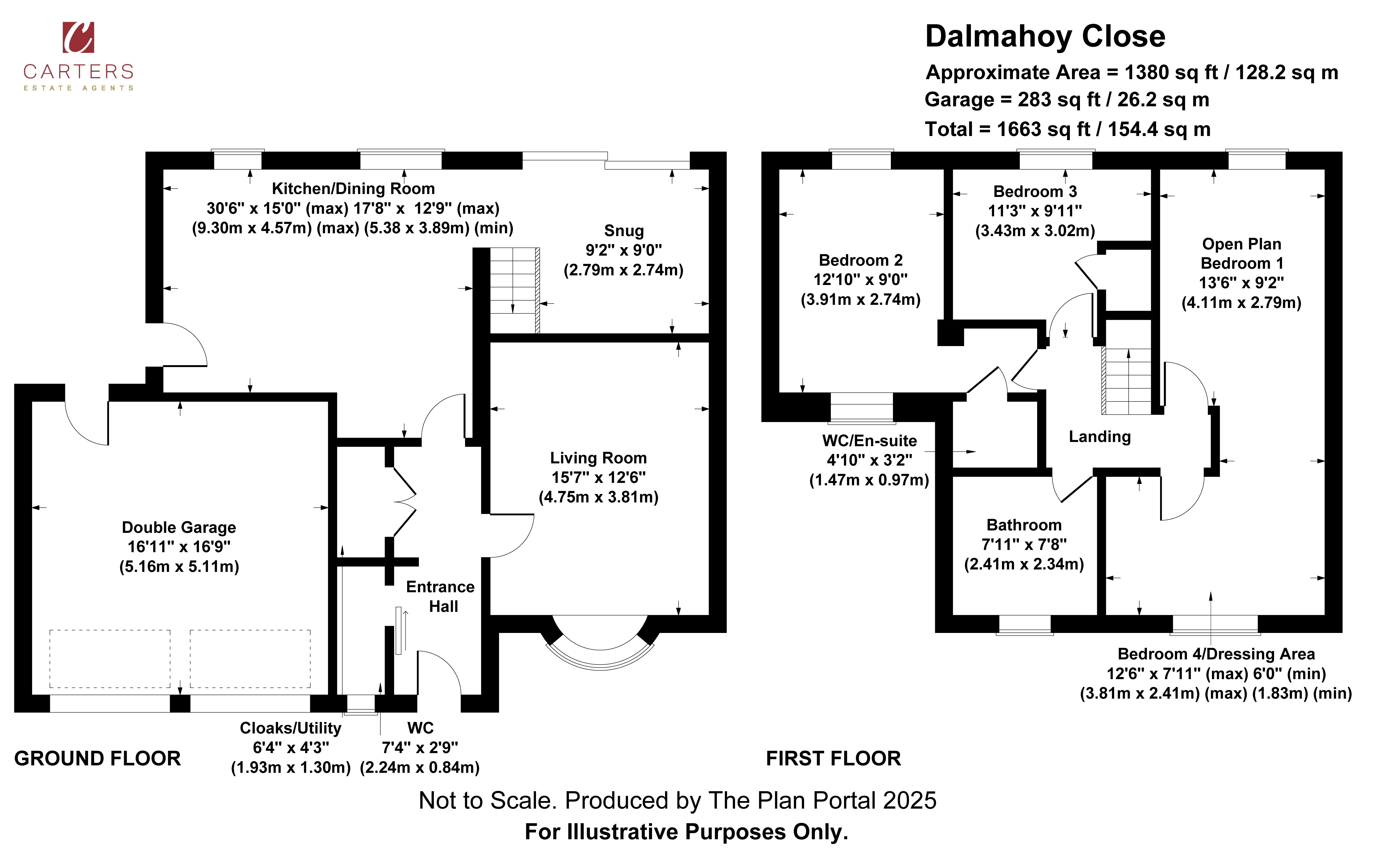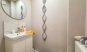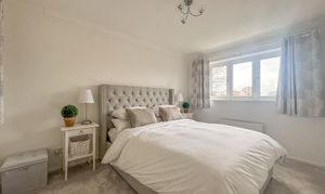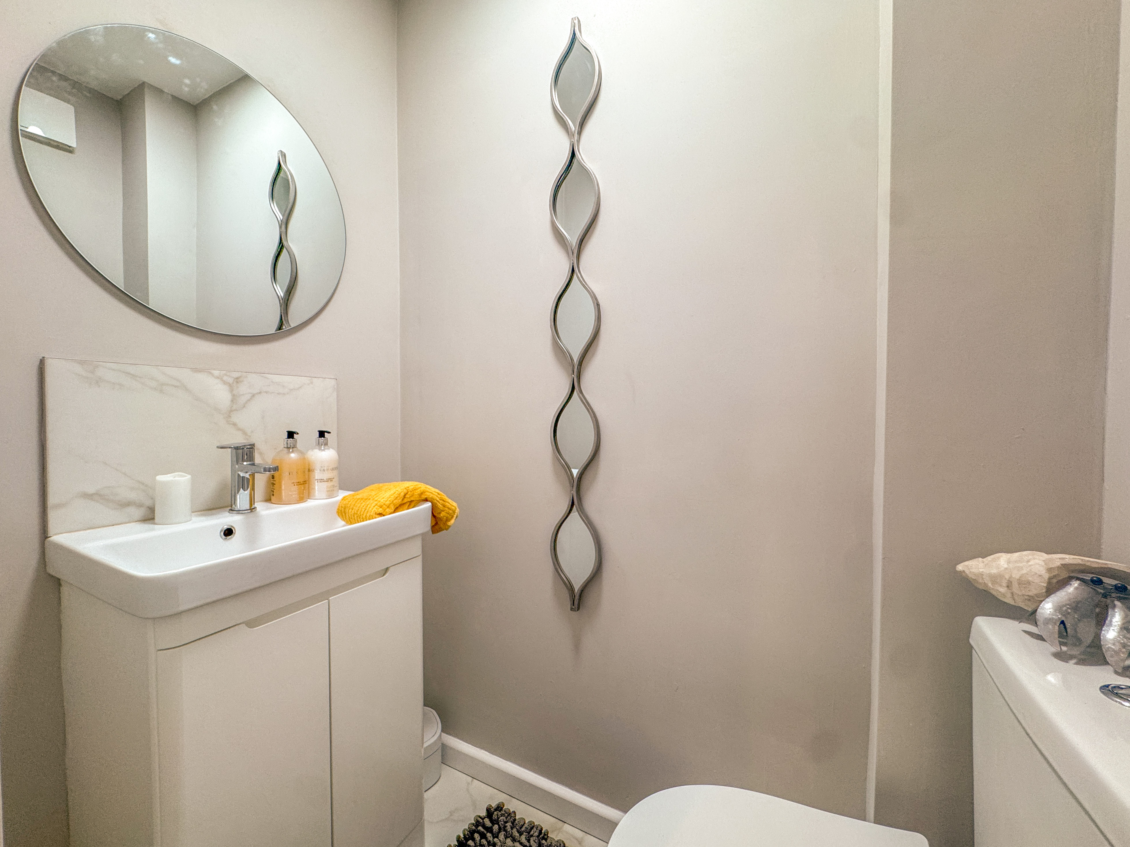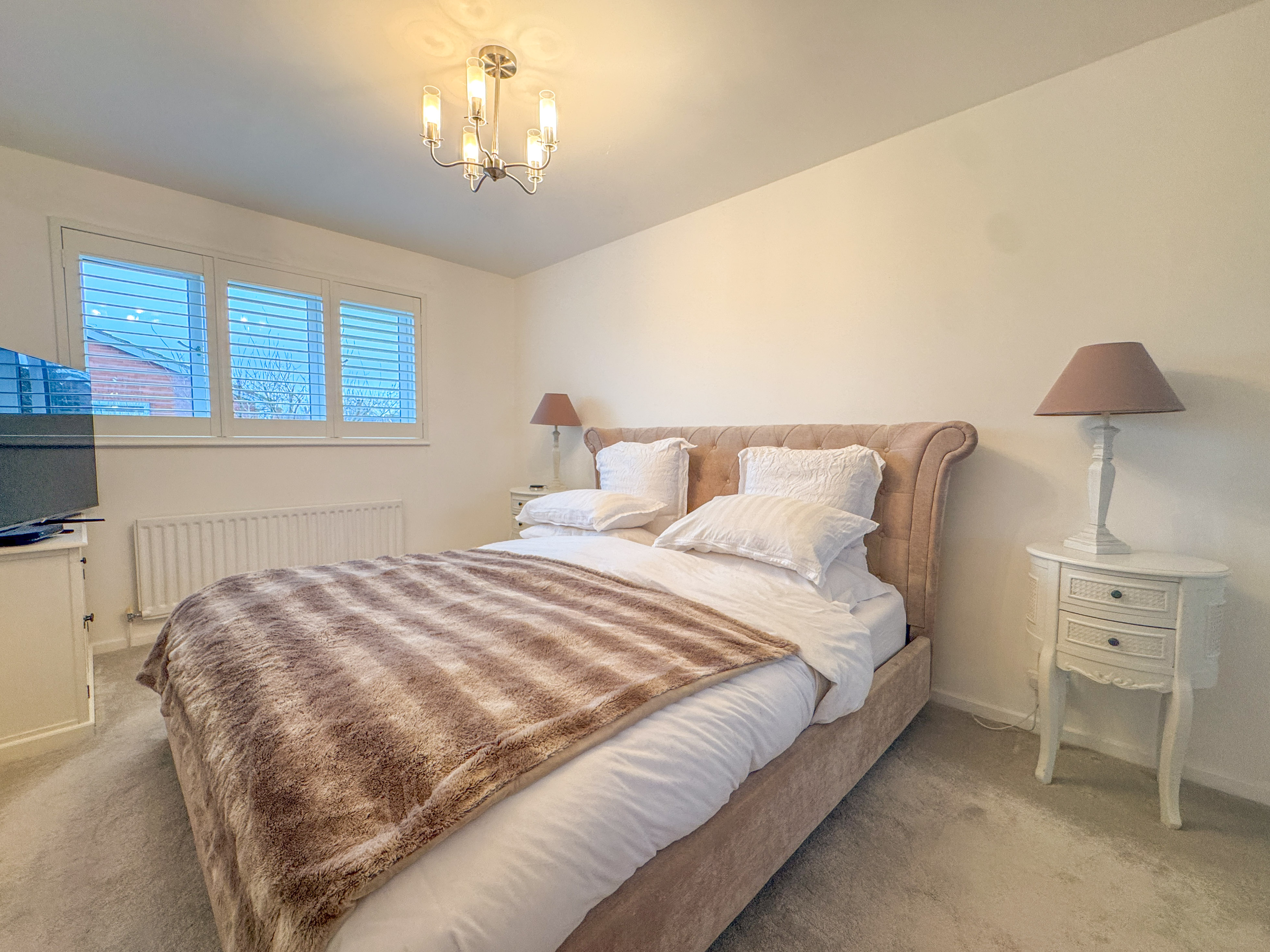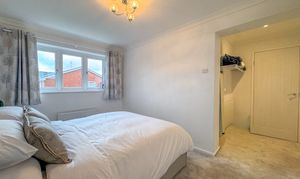To the first floor, the layout has been reconfigured to create a show-stopping principal suite, formed by combining two of the original bedrooms into one substantial space with dressing room (The stud wall can be reinstated to return to a four-bedroom layout if desired.) There are two further double bedrooms, one with a WC/cloaks and both with built-in wardrobes—additionally there is a stylish luxury bathroom featuring premium tiling, fixtures and underfloor heating.