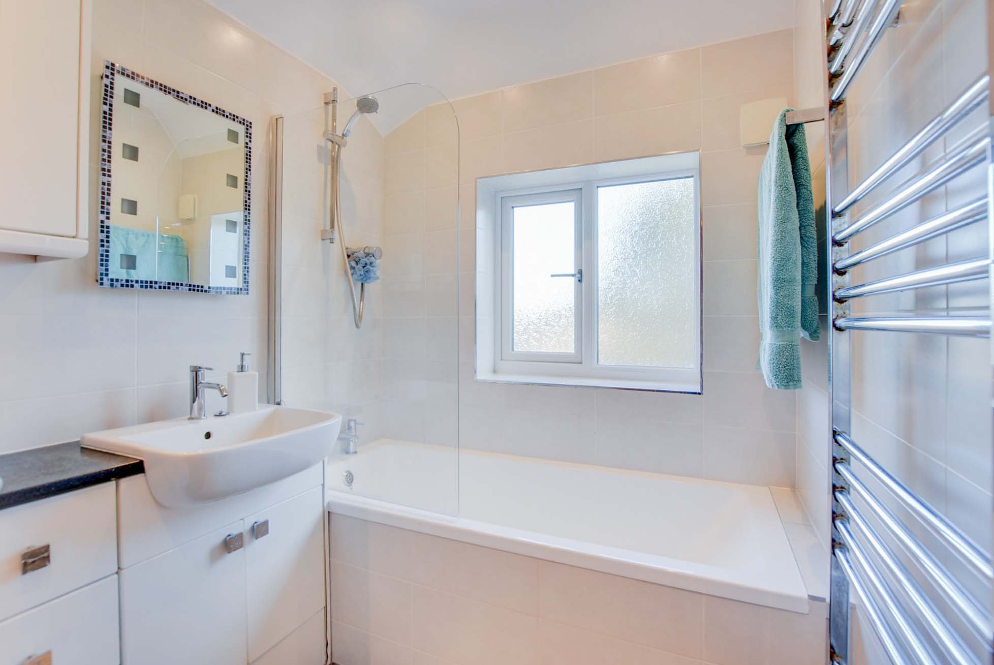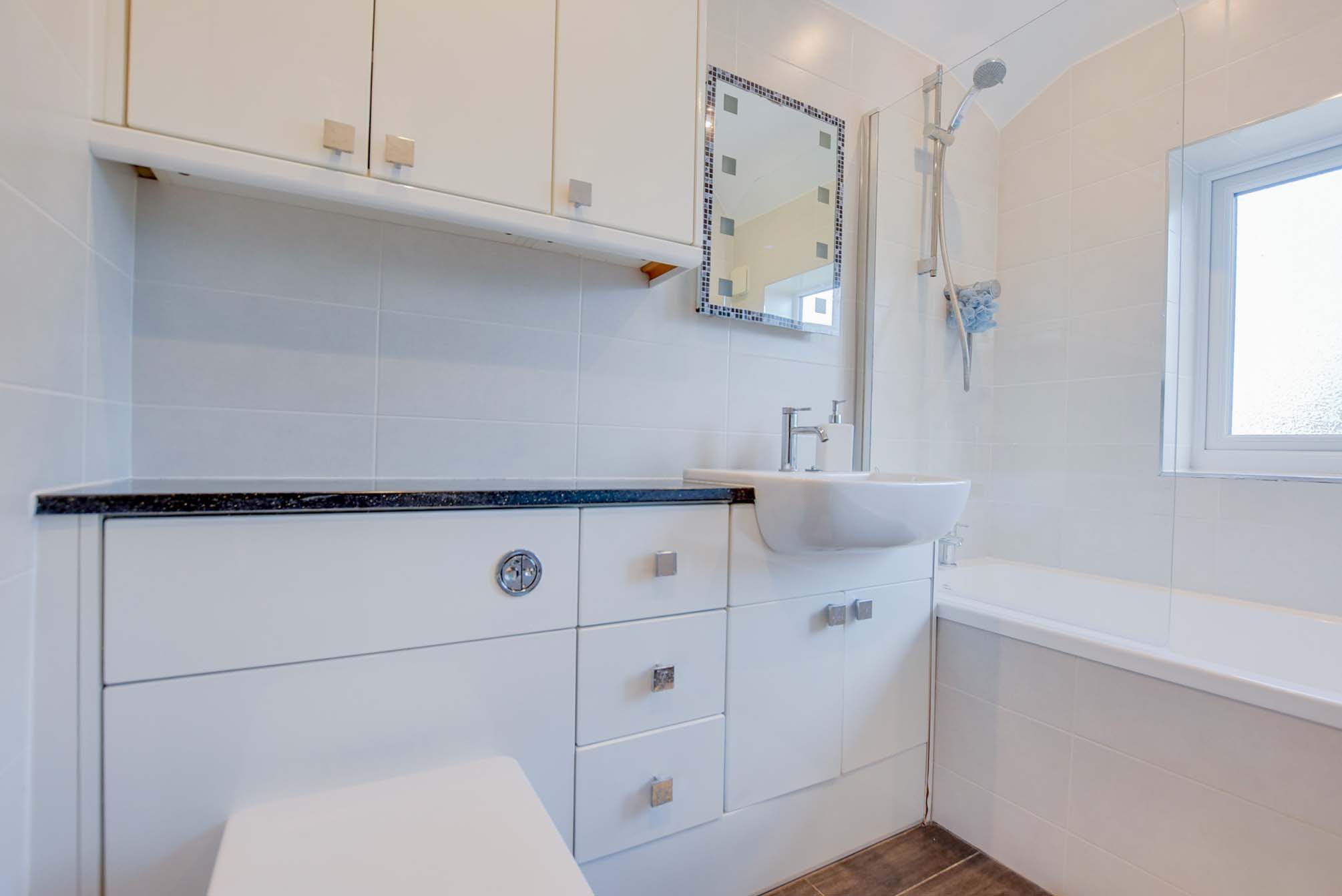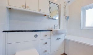 With a double-glazed window to the rear elevation, bath with shower over, wash hand basin, WC, storage units, tiled walls, ceiling spotlights and a heated chrome towel rail.