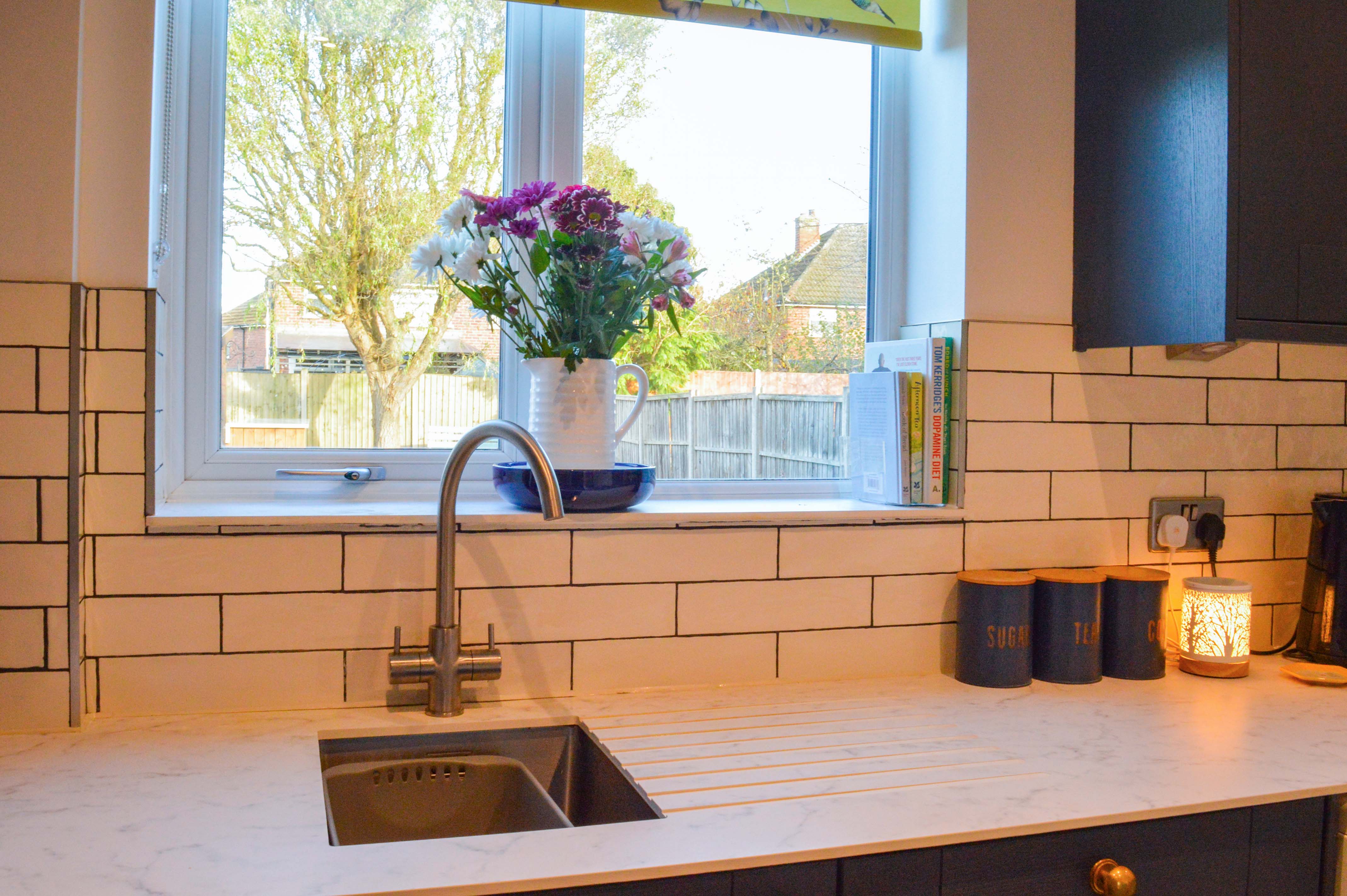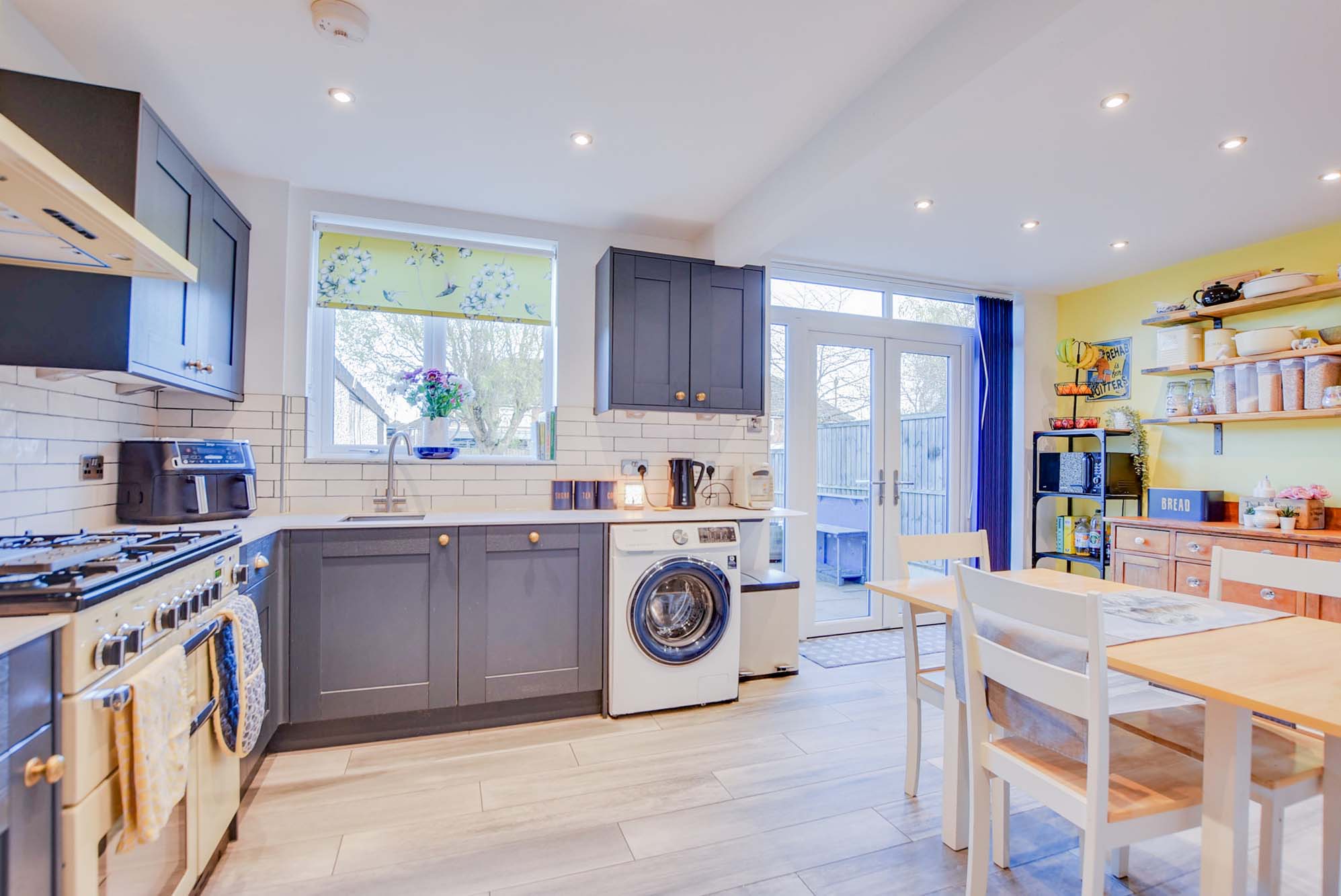 With double-glazed French doors and a window to the rear elevation, a sink and drainer unit with a range of wall and base units with work surfaces over, Rangemaster cooker with chimney hood over, plumbing for a washing machine, fridge freezer, dishwasher, ceiling spotlights, tiled flooring and a radiator.