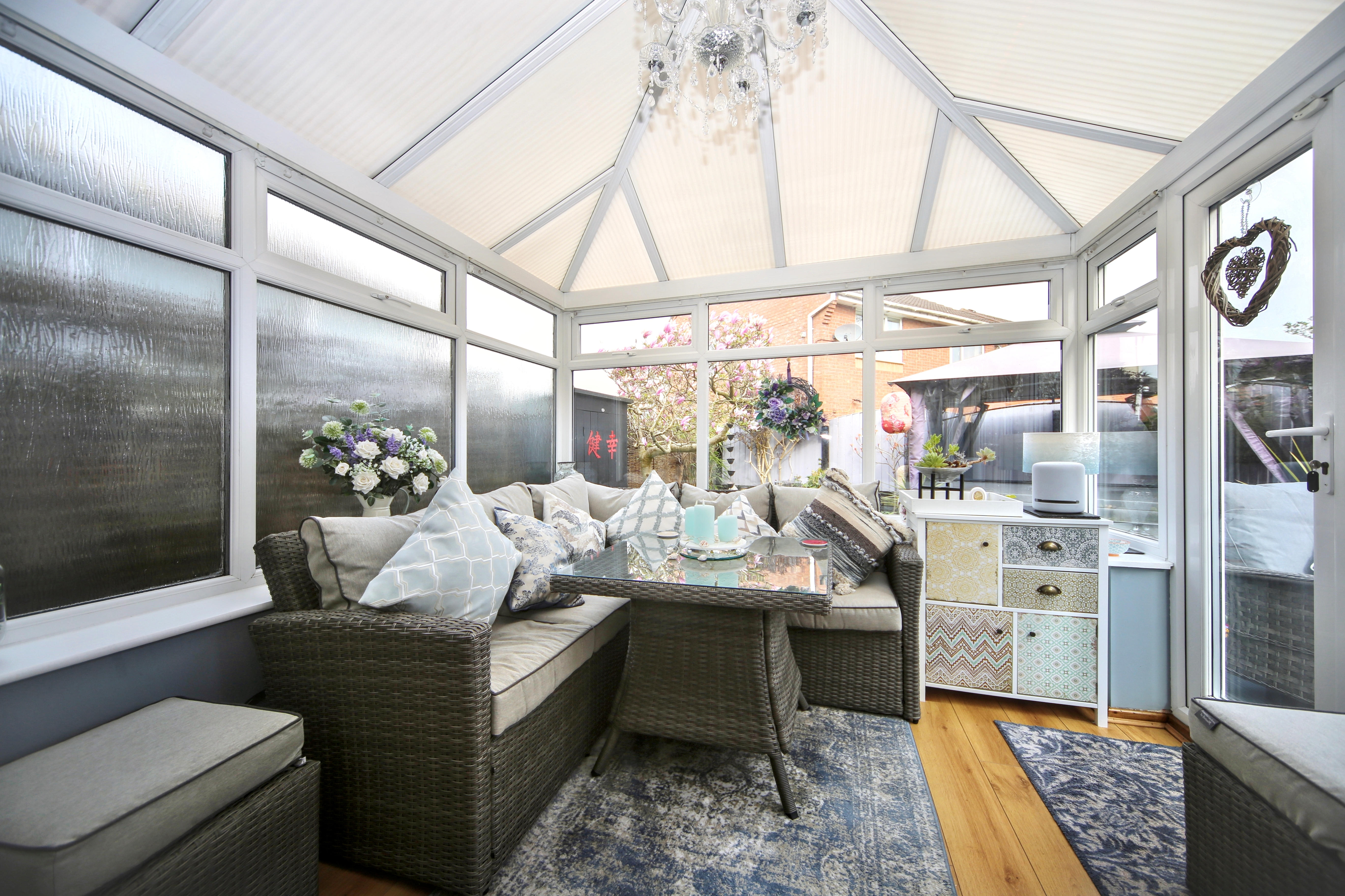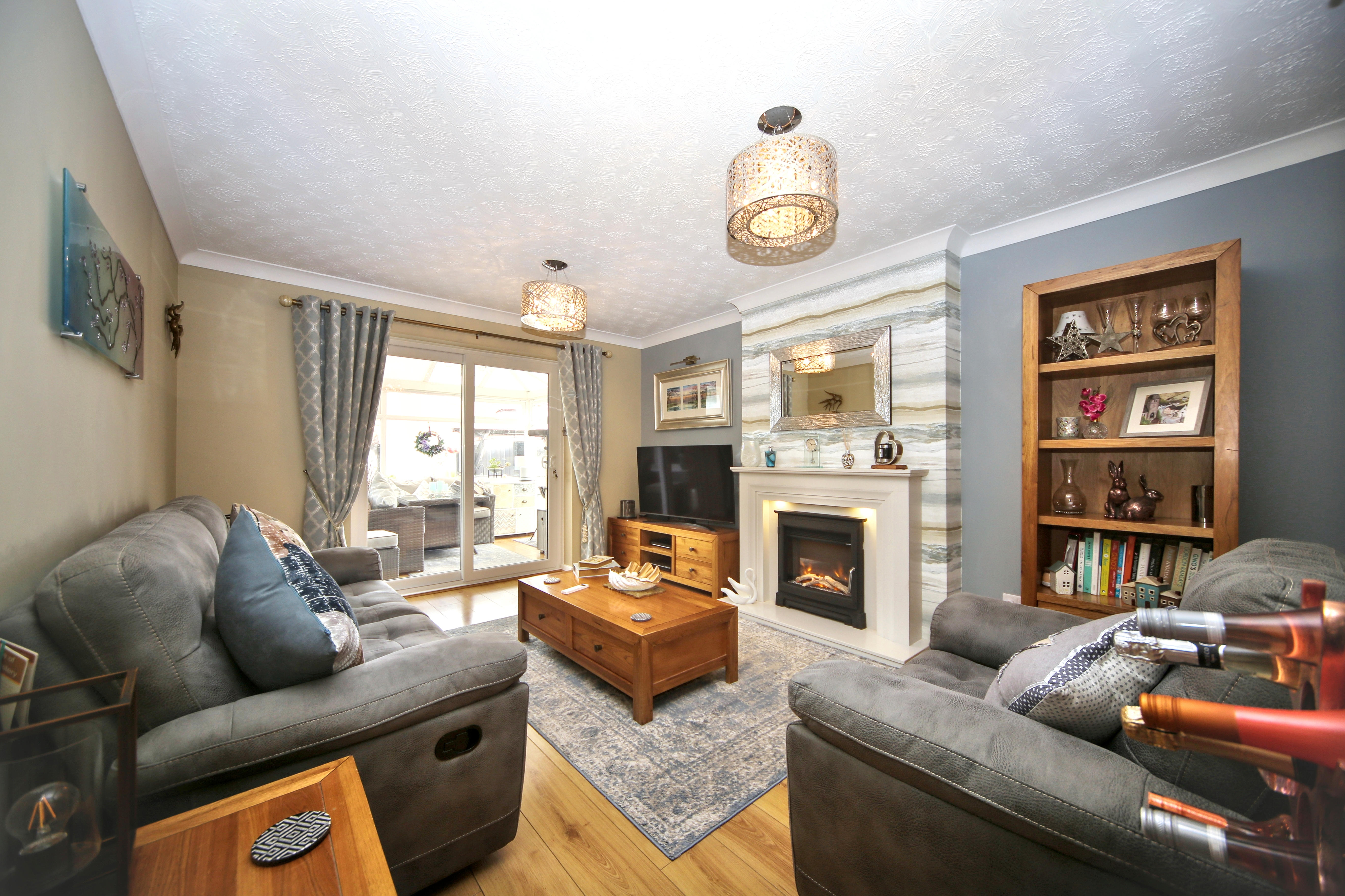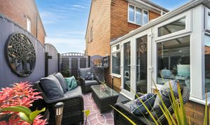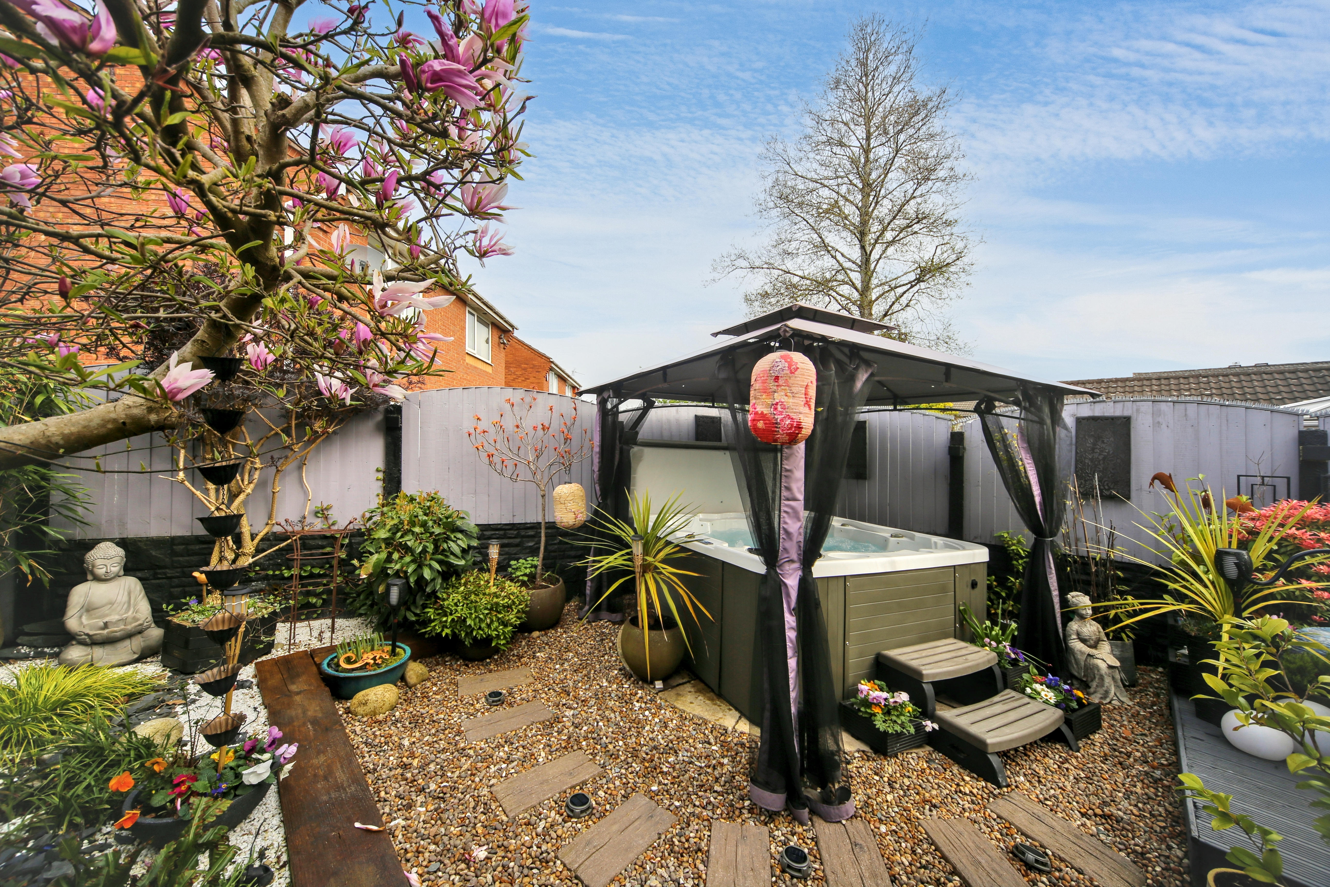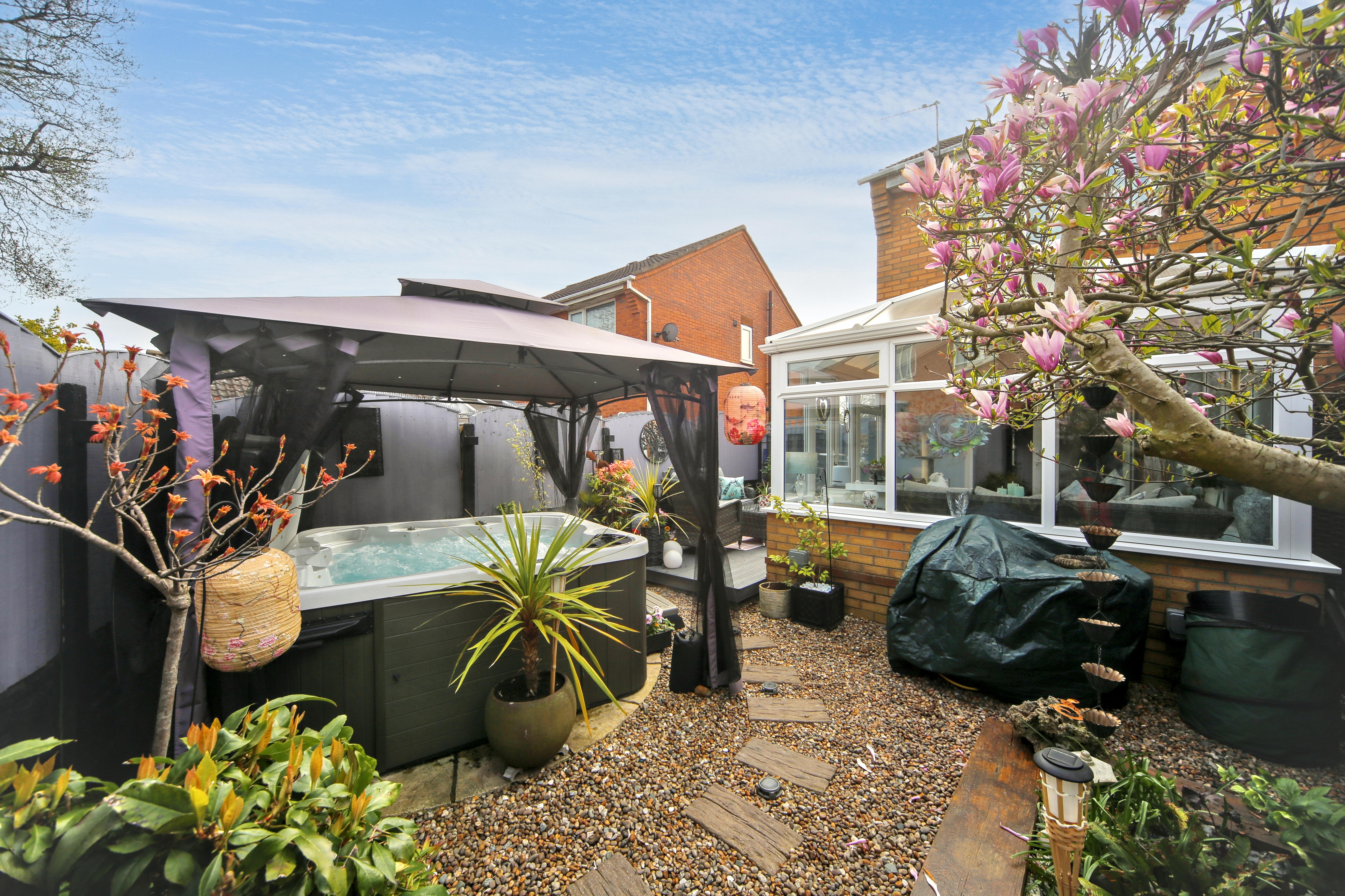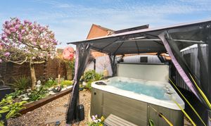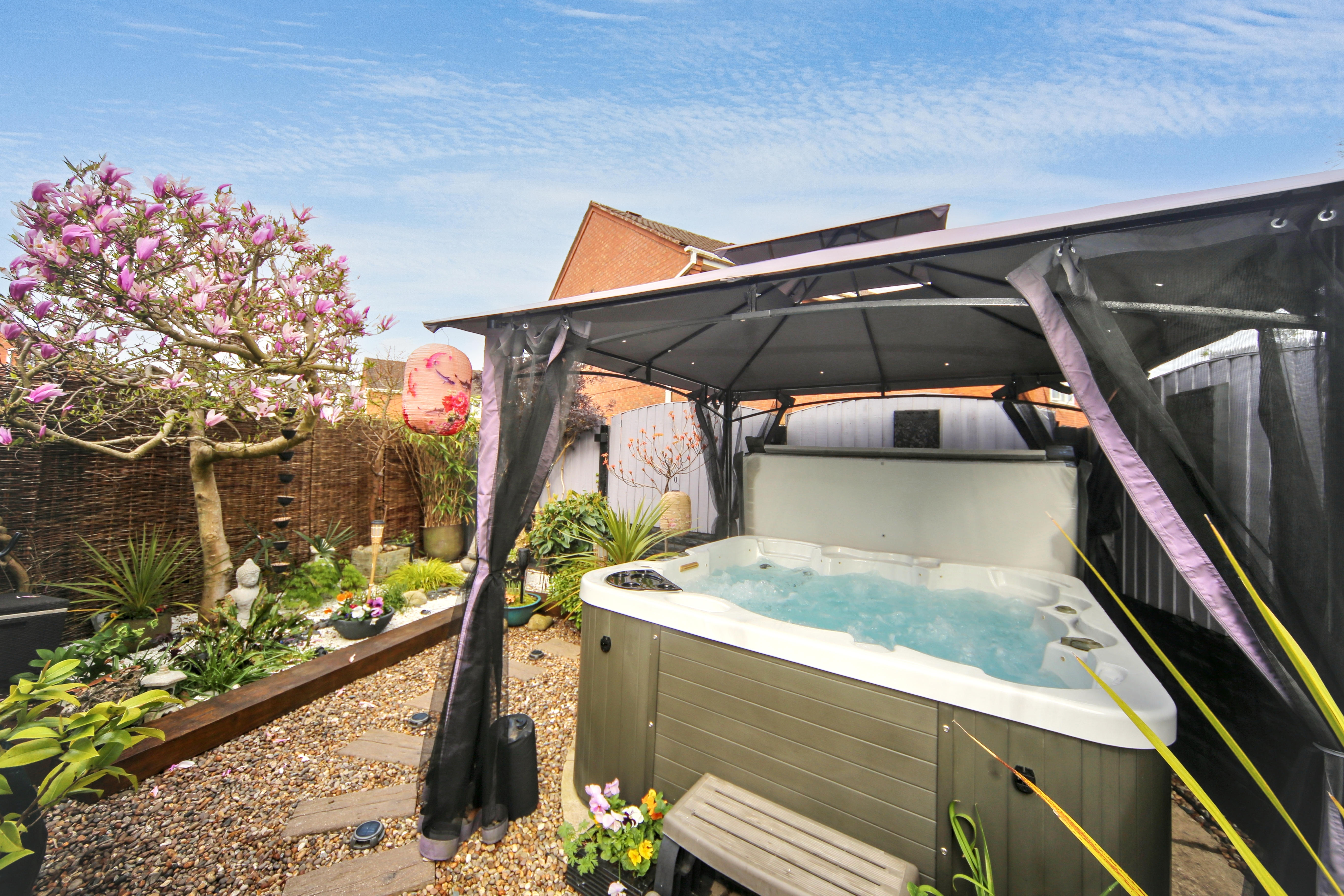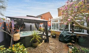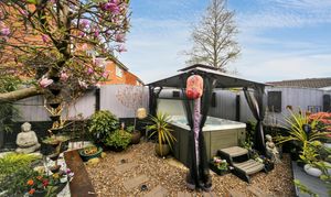 The stylish lounge features an electric fireplace, creating a warm and inviting space to relax. This flows seamlessly into a conservatory, offering additional living space and lovely views over the rear garden. Outside, you’ll find a cosy, landscaped garden with decking—ideal for entertaining or unwinding. A hot tub is also included, subject to negotiation.