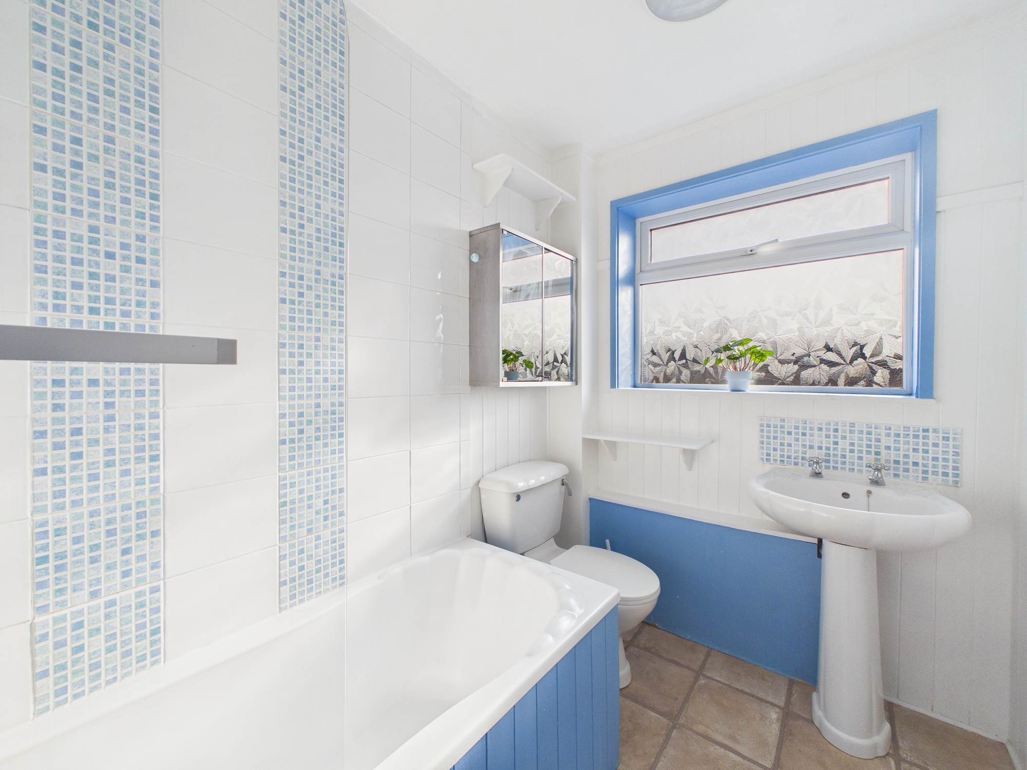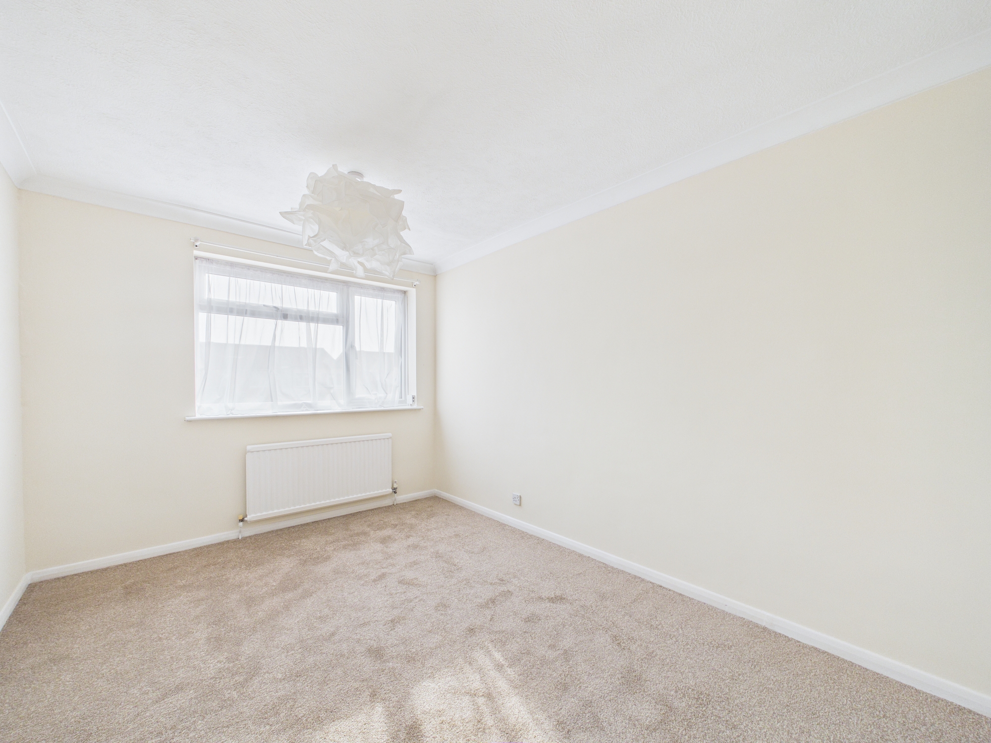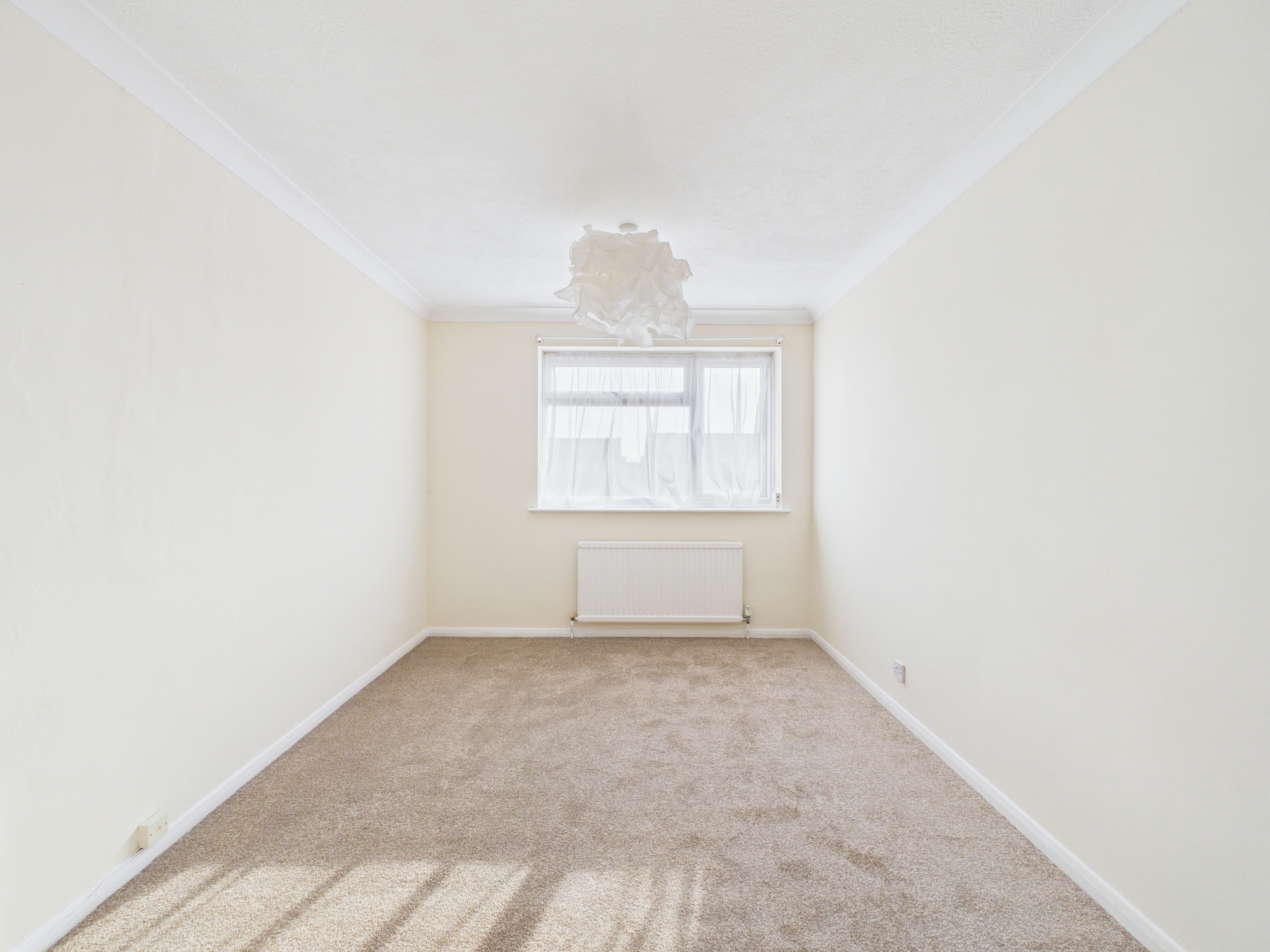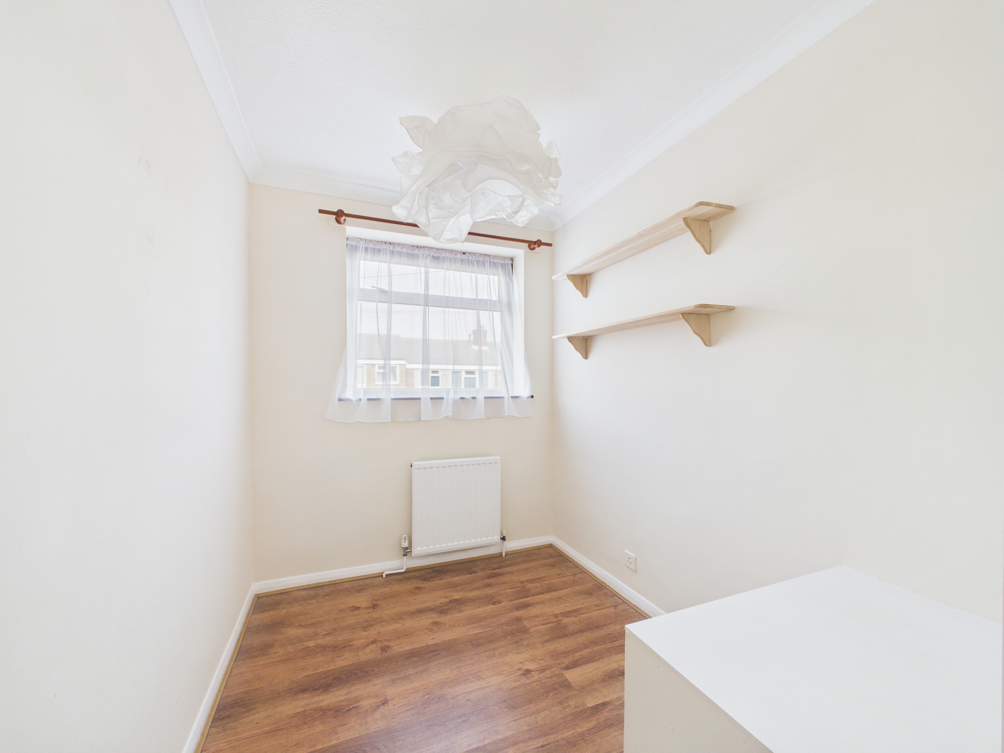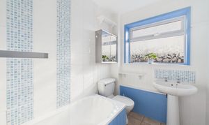 Each bedroom benefits from generous natural light, neutral décor, and practical built-in storage or shelving, offering flexibility for relaxation or work-from-home setups. The family bathroom is fitted with modern fixtures, an electric shower, modern tiling, and a full bath ensuring both comfort and convenience and with pedestal wash hand basin and low level wc.