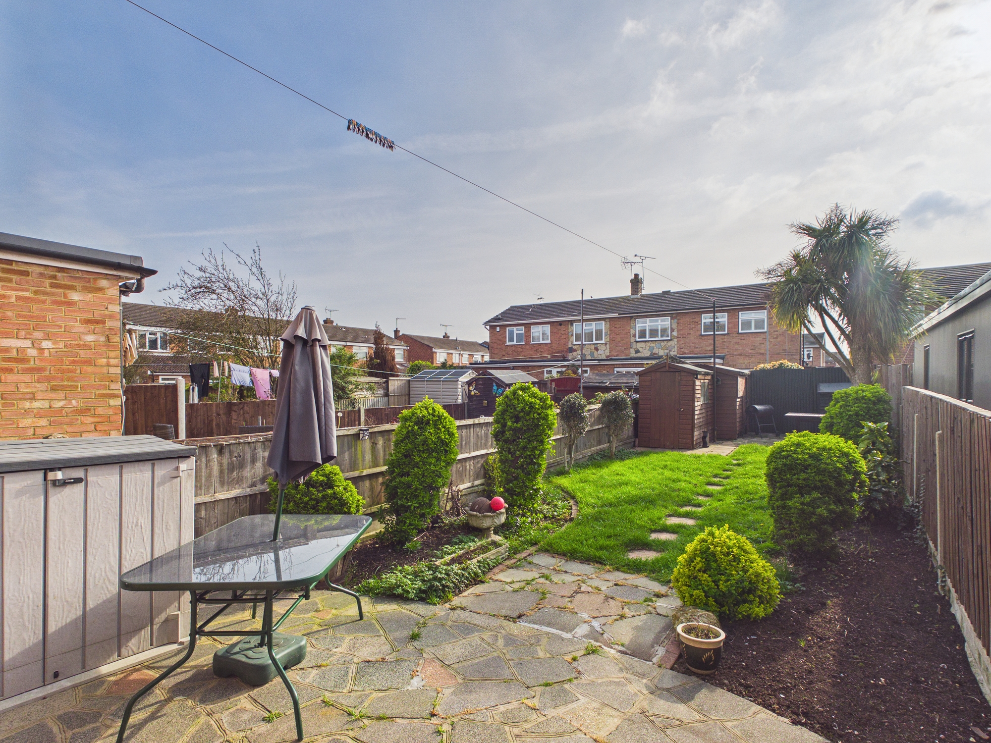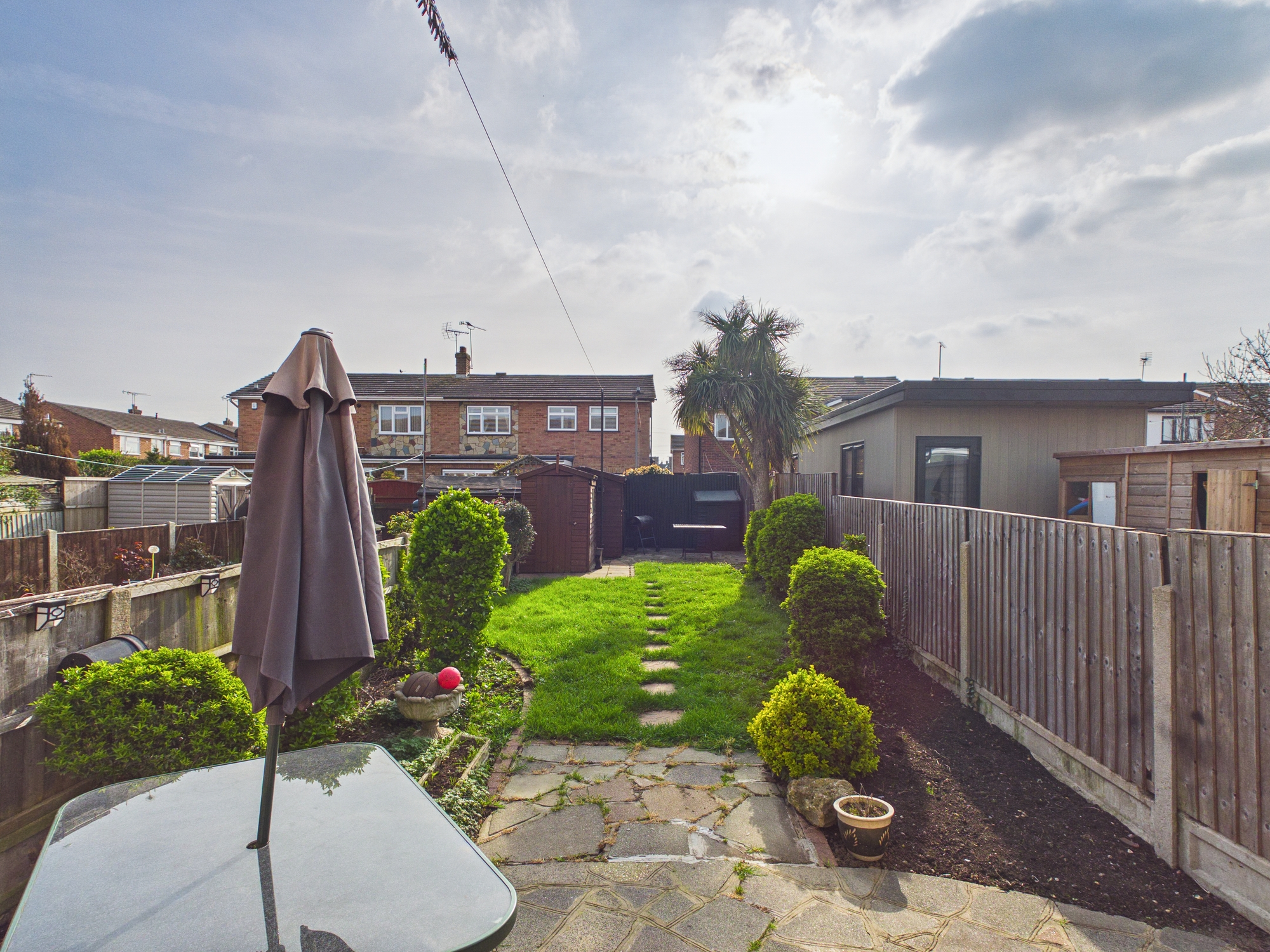 The well-maintained private garden is of a good size with a sunny South-Westerly aspect and features a lush lawn, multiple patio areas for outdoor dining and entertaining, and two practical timber storage sheds, with power and light connected. Secure fenced boundaries provide privacy and peace of mind. The front garden is paved and provides a useful off road parking facility.