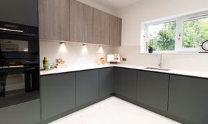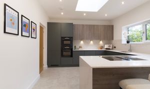 The bespoke kitchen, fully fitted by German manufacturer Nobilia, combines precision design with contemporary style. Quartz work surfaces, finished with a waterfall end panel, frame the space beautifully, while a full suite of integrated Bosch and Elica appliances ensures effortless functionality. A striking central island becomes the heart of the room, bringing together cooking, dining and socialising in one seamless flow.