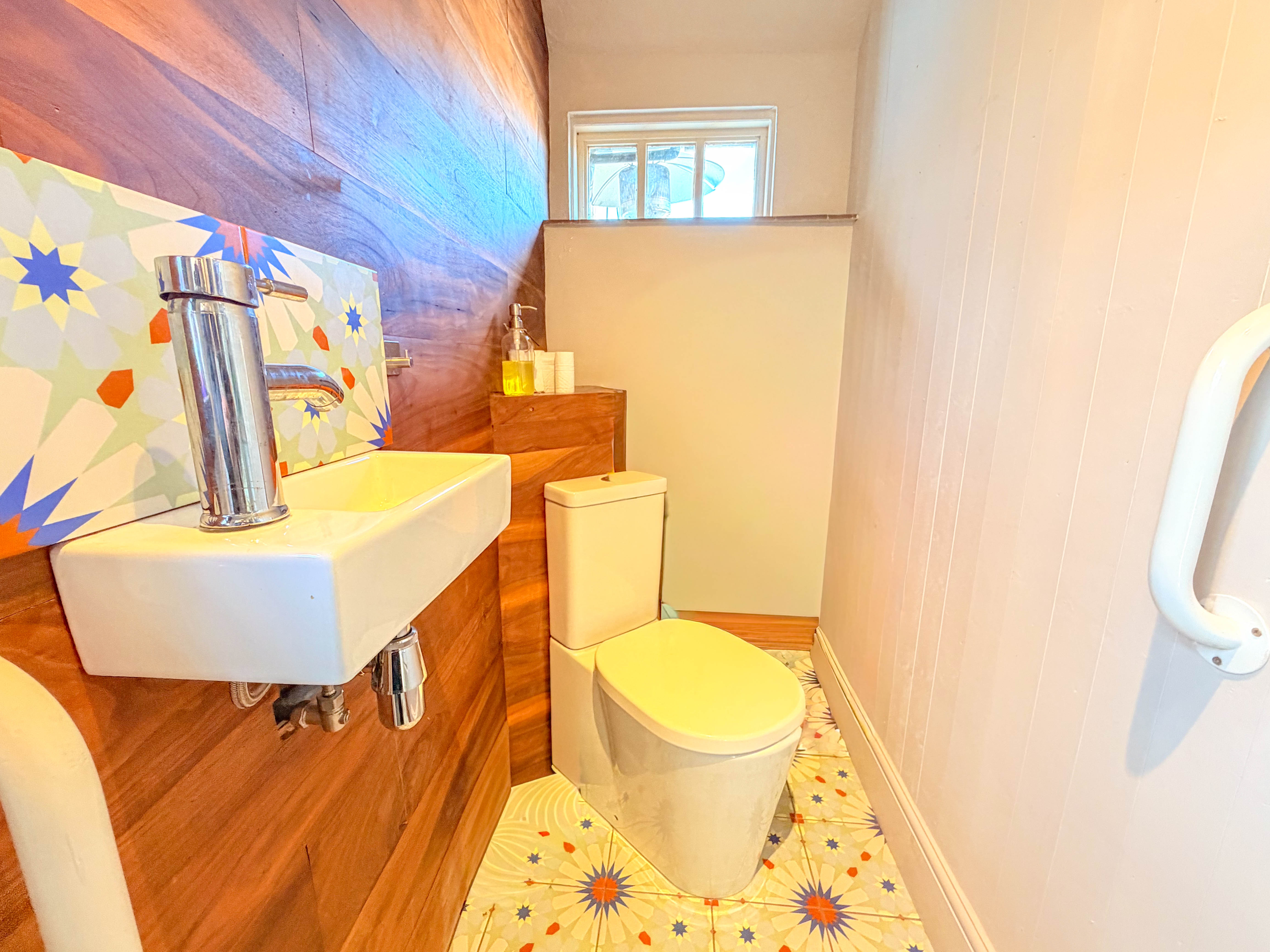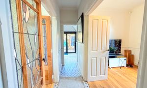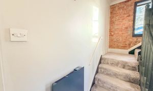 Upon entering, you are welcomed into a spacious and inviting hallway, where a staircase—set against a characterful exposed brick feature wall—ascends to the first floor. This warm and stylish entrance sets the tone for the tasteful accommodation that follows.