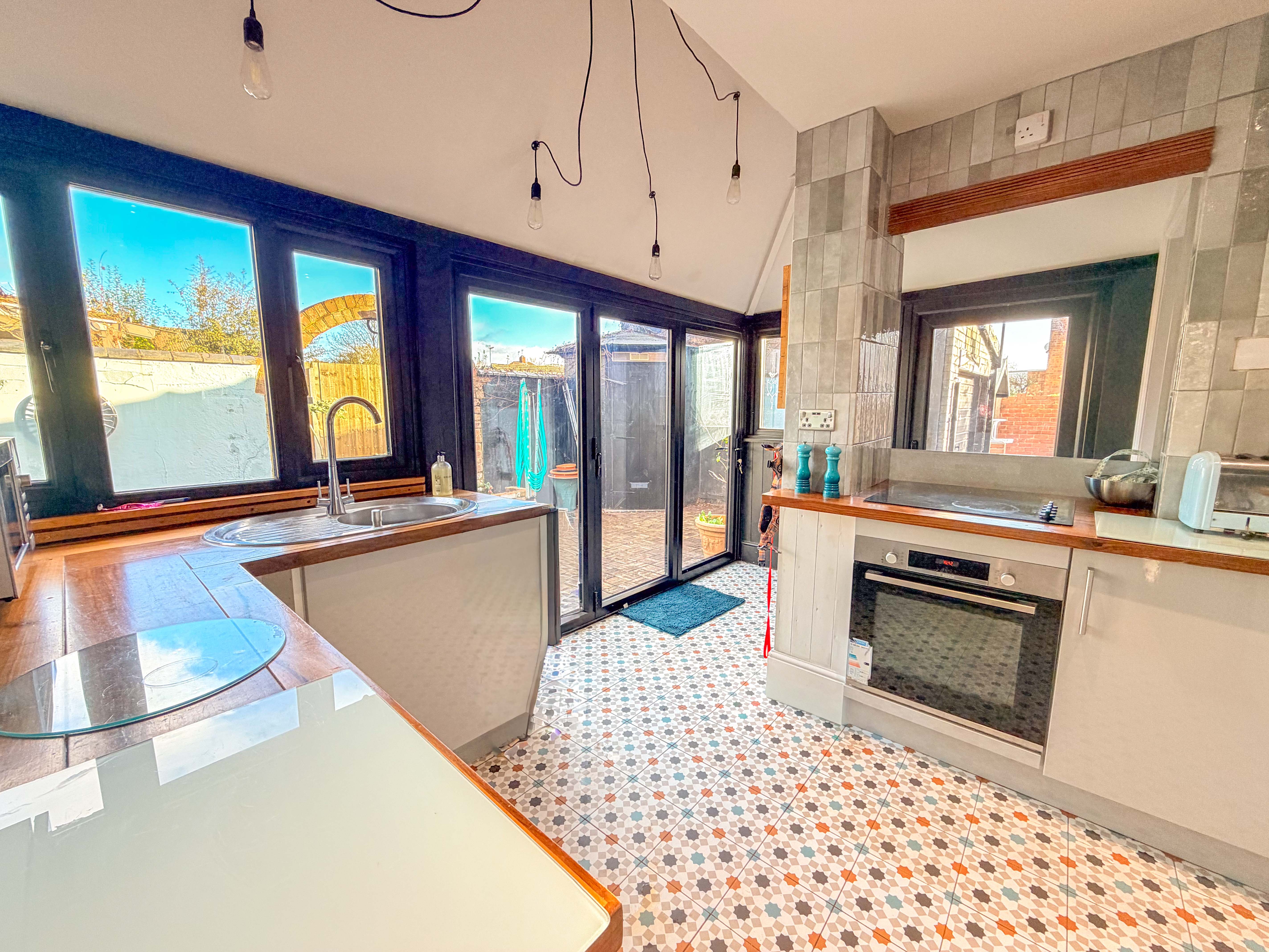 The kitchen is exceptionally well fitted with a modern range of grey units, providing both style and practicality. A set of elegant bi-fold doors opens directly onto the rear patio, allowing natural light to flood the space and offering the perfect environment for social gatherings. Completing the ground floor is a highly useful WC/utility room, adding further convenience to the home.