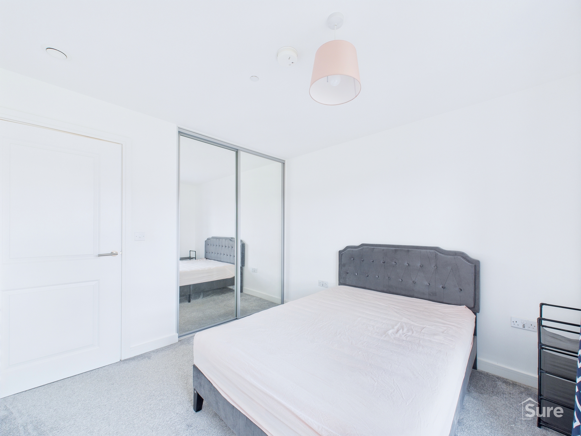 The generously sized bedroom features a double bed and a built-in wardrobe, providing plenty of storage while maintaining an open feel. The contemporary bathroom includes a shower over the bath, wash hand basin, and low-level WC.