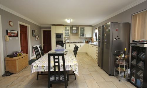 Tremendous size family kitchen with a cermiac tile flooring throughout. The kitchen is well appointed with matching eye level and base units in cream with brushed steel style furniture. The units are complemented by modern work tops which have a one and a half bowl stainless steel sink with mixer tap. Deep saucepan drawers. Integrated appliances include a dishwasher, double oven with grill, microwave / grill combo oven, 5 ring gas hob, glass canopied extractor hood plus there is adequate space for other appliances as required. Ideal space for formal dining table and chairs. Cherry wood style panelled door to utility room and return door to the dining room. uPVC double glazed rear window plus complementing sliding doors which give access to the conservatory. Two radiators, coving and two ceiling lights.