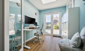 The bungalow comprises an entrance hall, a cloakroom with WC, and a spacious living/dining room featuring a square bay window. There is also an office or sun room with French doors opening onto the garden, and a kitchen with a door providing access to the side of the property. The two double bedrooms include a master with a walk-in wardrobe and en-suite bathroom, complemented by a family bathroom.