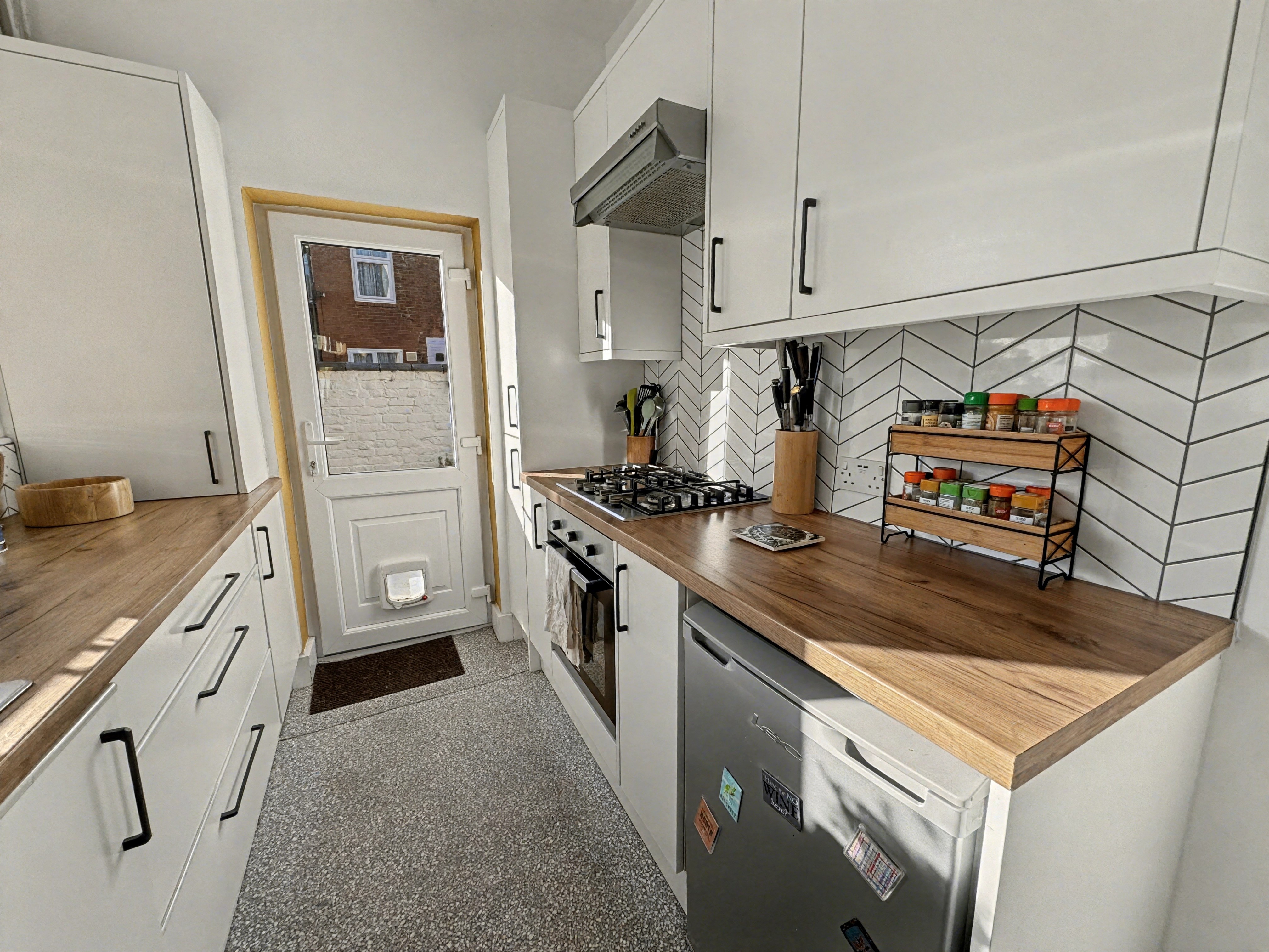 The well-planned kitchen features contemporary white units and wood-effect worktops, offering ample workspace whether you’re cooking everyday meals or trying something new.