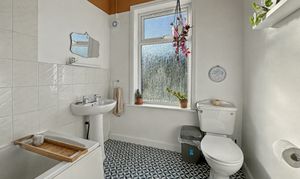 Upstairs, the property offers two good-sized bedrooms, each providing a comfortable and peaceful setting. The master bedroom has a smart, tasteful finish with plenty of room for wardrobes and other furniture, while the second bedroom is also a well-proportioned double. Completing this floor is a tiled bathroom with a white three-piece suite including a bath with overhead shower, pedestal sink and WC.
