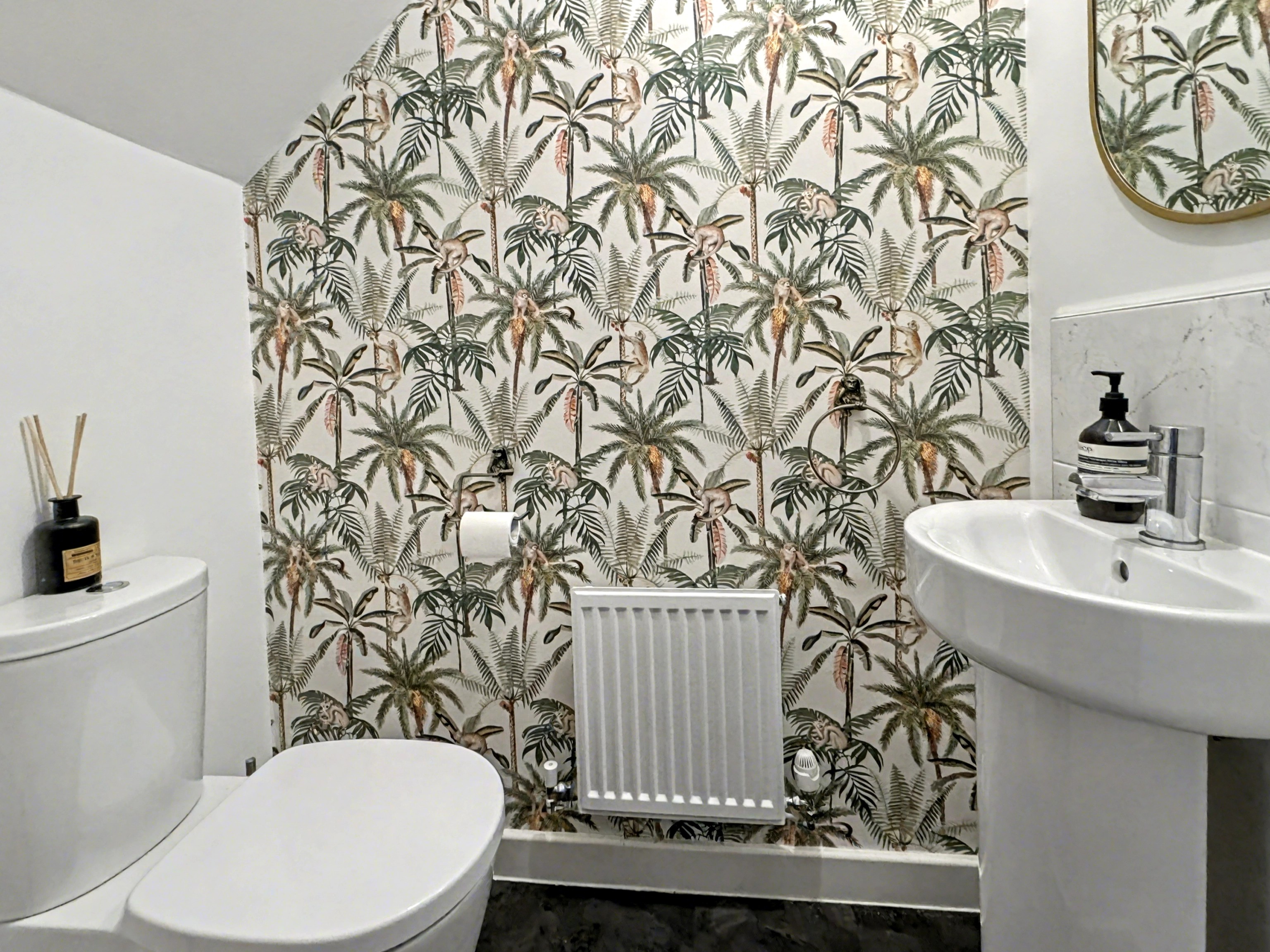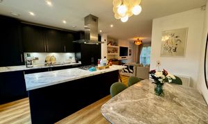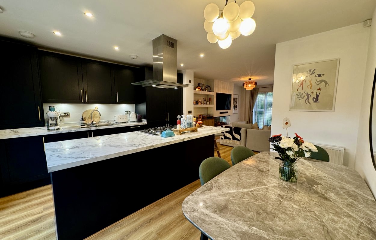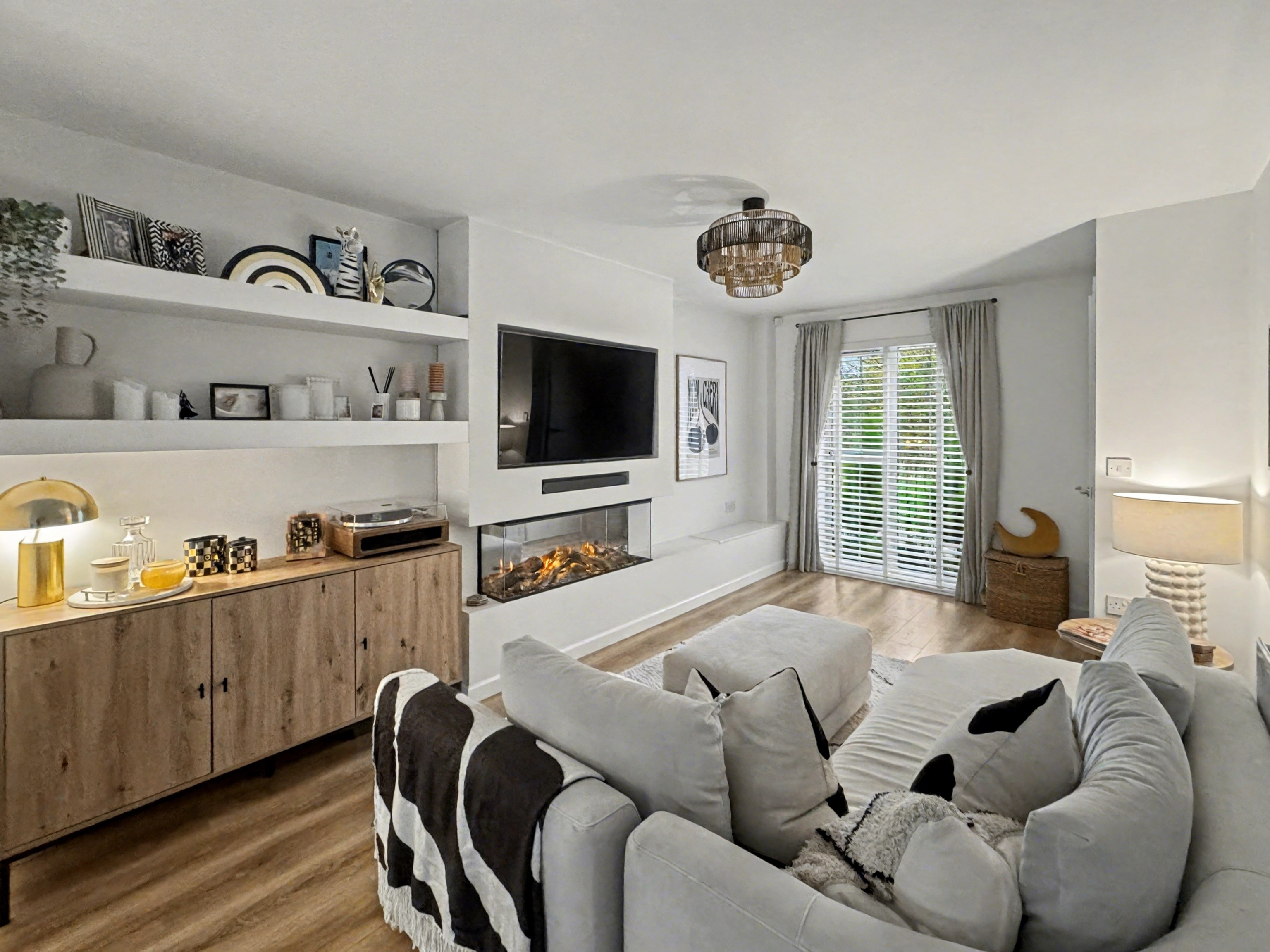 Upon entering, you are welcomed by a bright hallway leading into the impressive open-plan living and dining area. The lounge features a stylish media wall complete with integrated fireplace, creating a warm and inviting focal point. The space opens into a modern fitted kitchen, enhanced by full-width bi-fold doors which lead directly onto the rear garden—ideal for sociable indoor-outdoor living and summer entertaining. A convenient downstairs WC completes the ground floor.