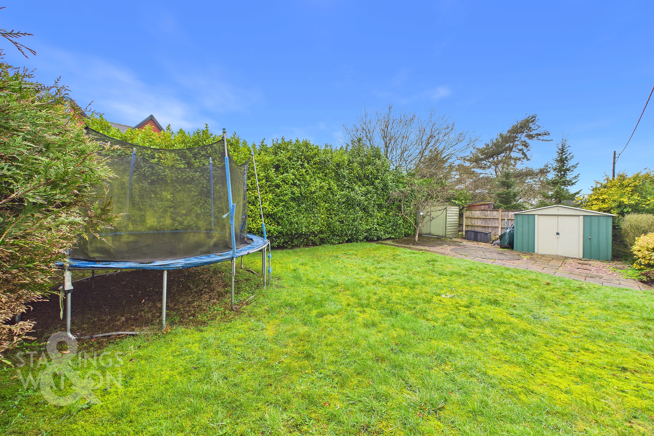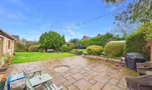 THE GREAT OUTDOORS Enclosed within timber panel fencing, brick walling and mature hedging, the rear garden offers a private non-overlooked aspect with a large patio seating area extending from the dining room French doors. Two expanses of lawn can be found with a ramped section leading to the rear raised garden, where a range of storage can be found, further patio seating and a variety of mature hedging and shrubbery. The side access offers a gate to the driveway.