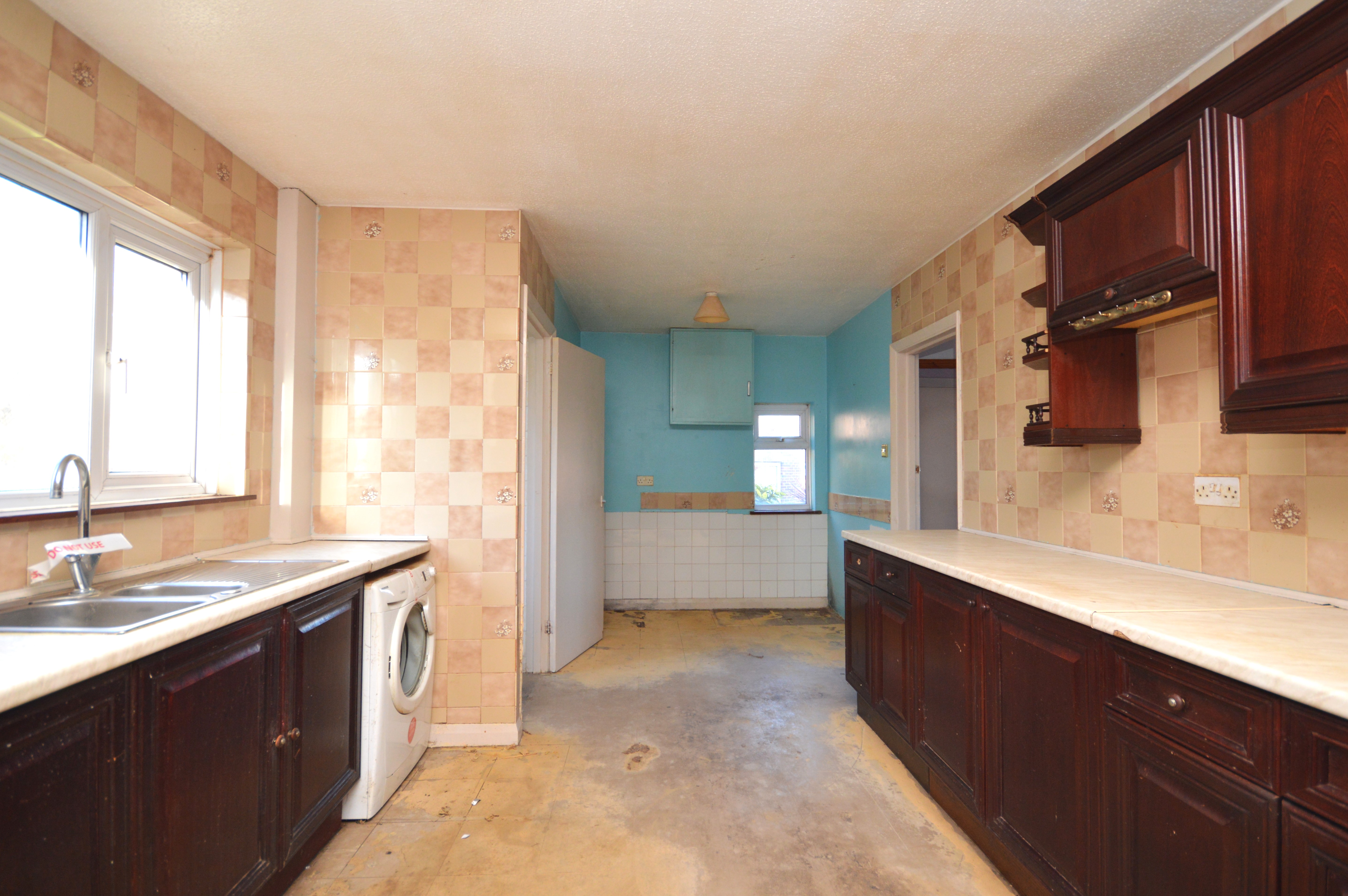 UPVC double glazed windows to the rear and side of the property. Matching wall and base units with space for freestanding cooker, washing machine and fridge/freezer. Stainless steel sink and wall mounted boiler. UPVC double glazed back door to garden and door to:-